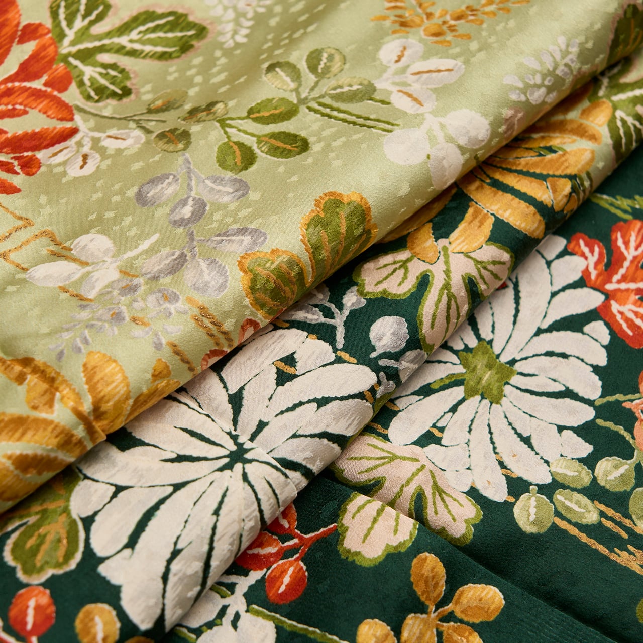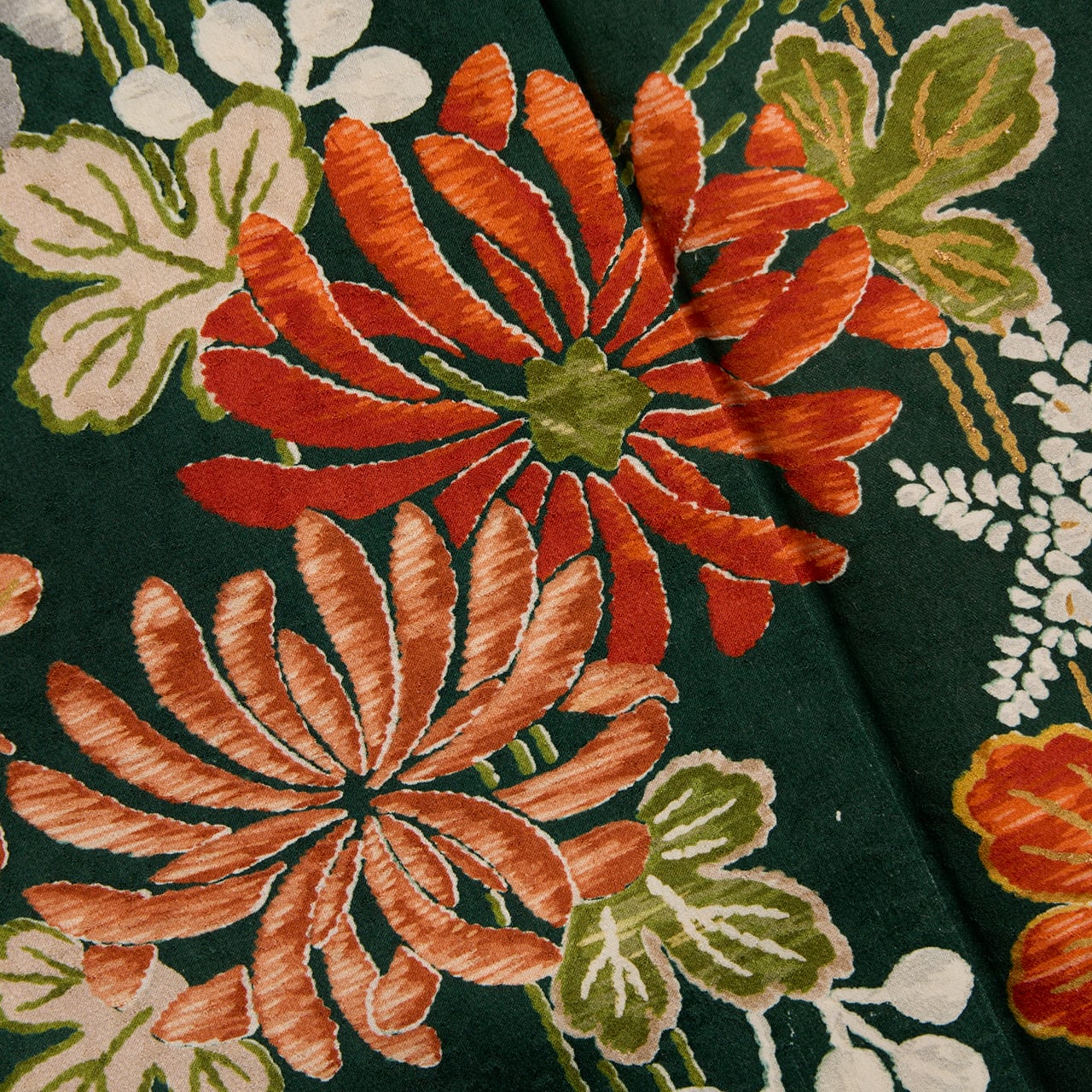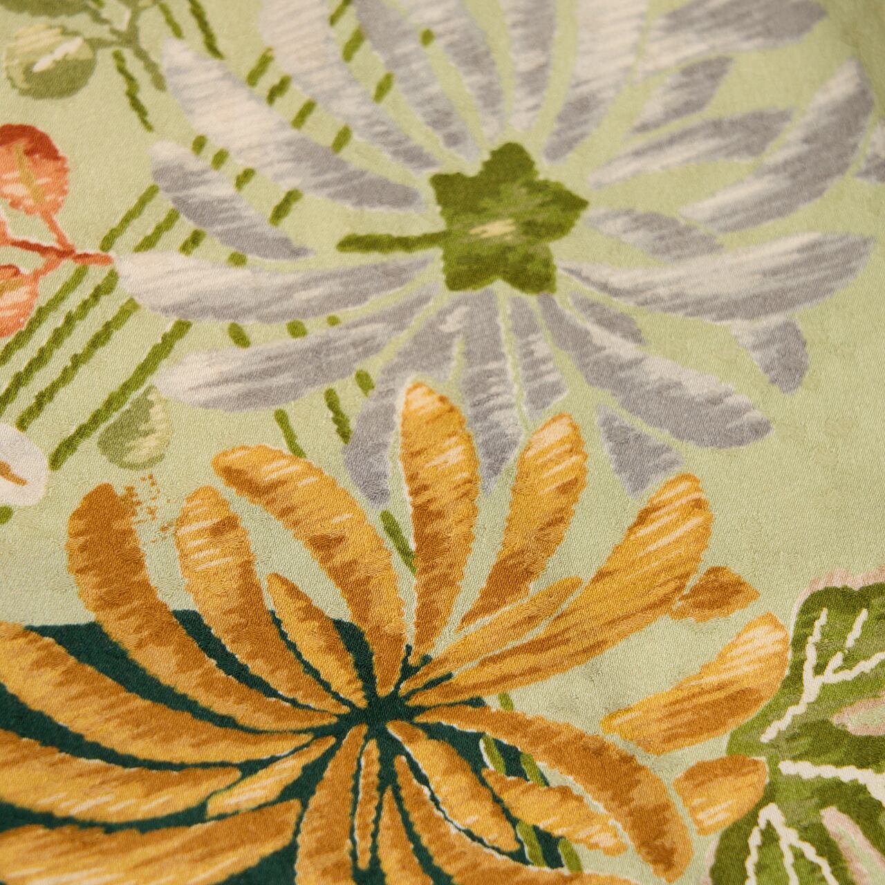 そして、染め分けられた濃い緑・天鵞絨色の部分の菊のお花は、身頃あたりとは密度を変えられていて、ボリュームのある描写をされていますが、そういった手間を惜しまない細かい心遣いにも多ち花さんらしさが感じられます。