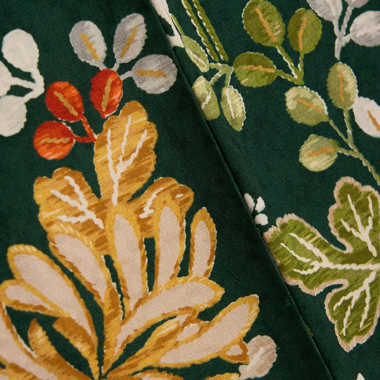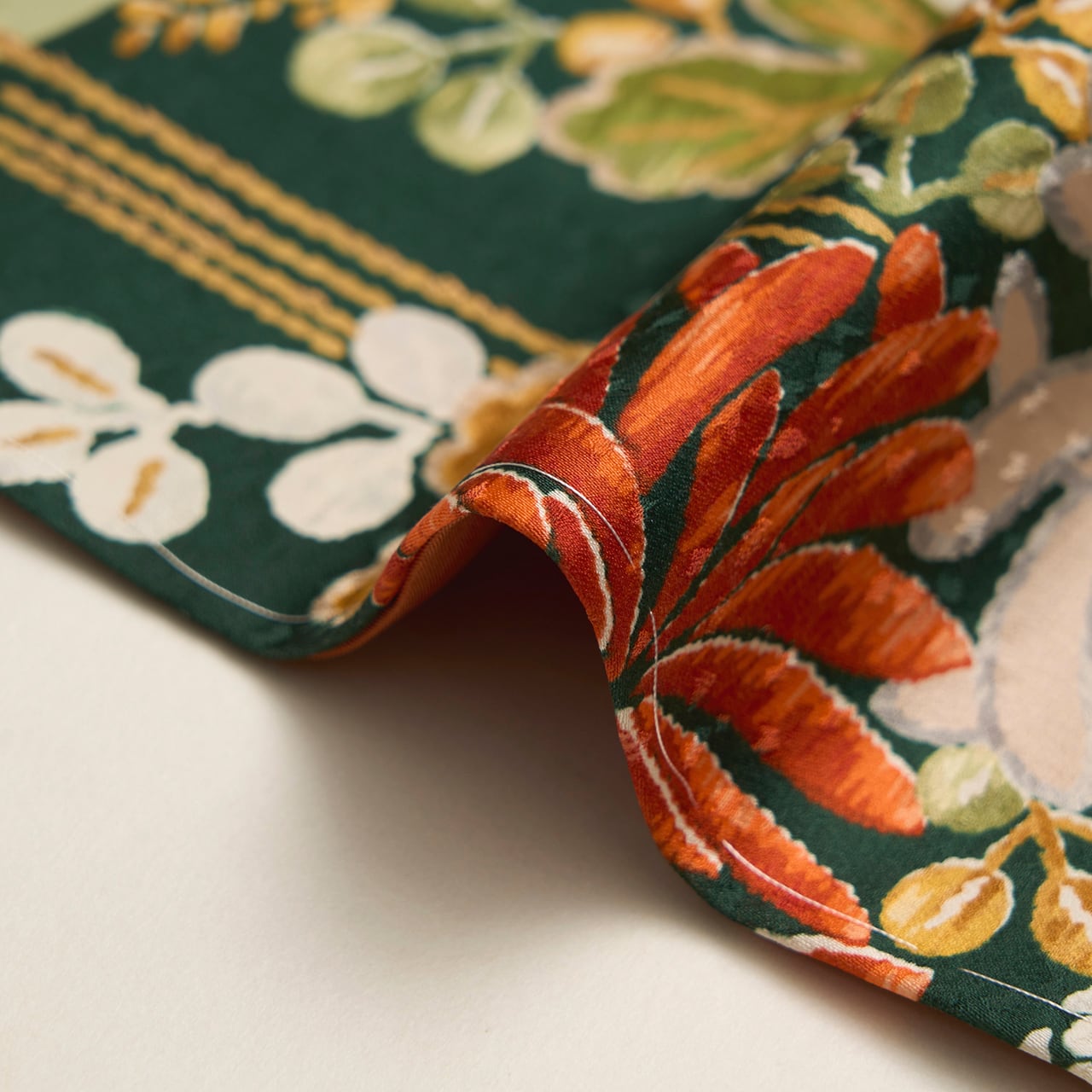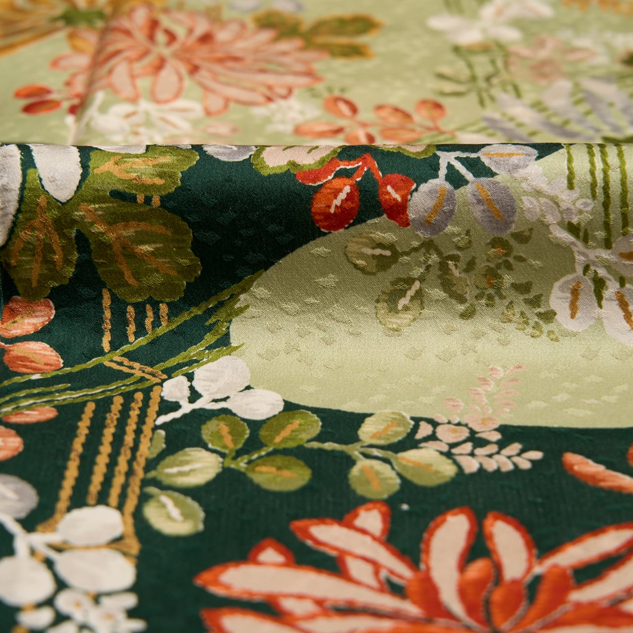 そして、染め分けられた濃い緑・天鵞絨色の部分の菊のお花は、身頃あたりとは密度を変えられていて、ボリュームのある描写をされていますが、そういった手間を惜しまない細かい心遣いにも多ち花さんらしさが感じられます。