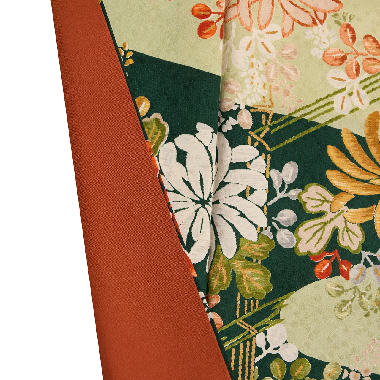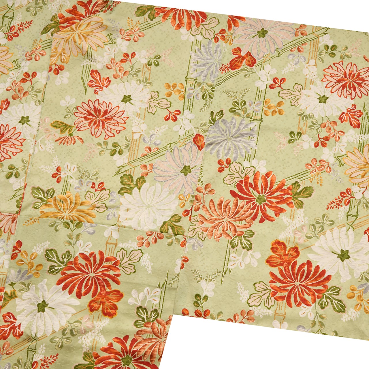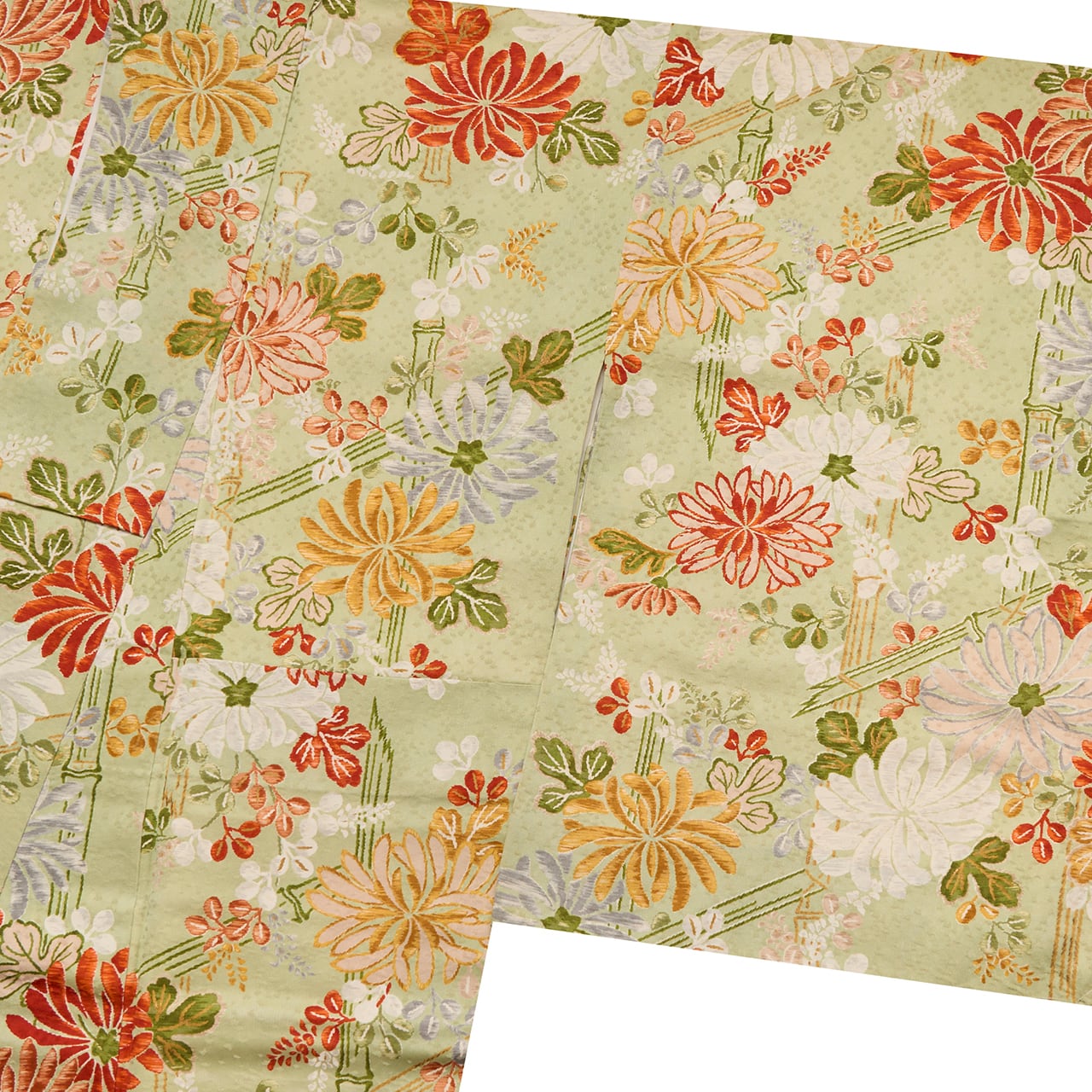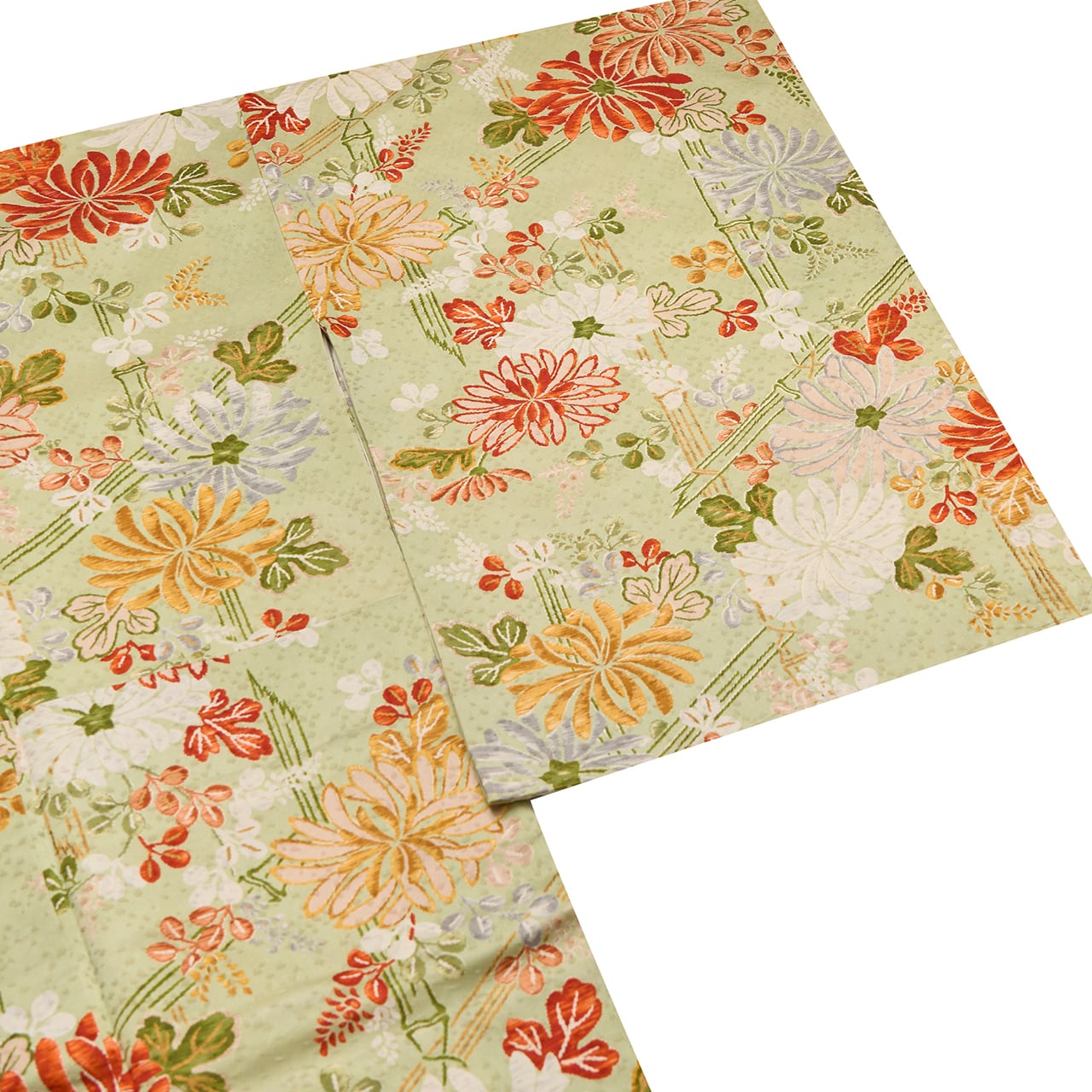 菊のお花の背景には斜めに連続して並ぶ竹垣がシャープに描かれ、たっぷりと咲く菊のお花はオレンジ系の代赭色の濃淡や山吹茶色、白茶色、薄色など色とりどりに染められ、傍らには白い萩のお花が添えられています。