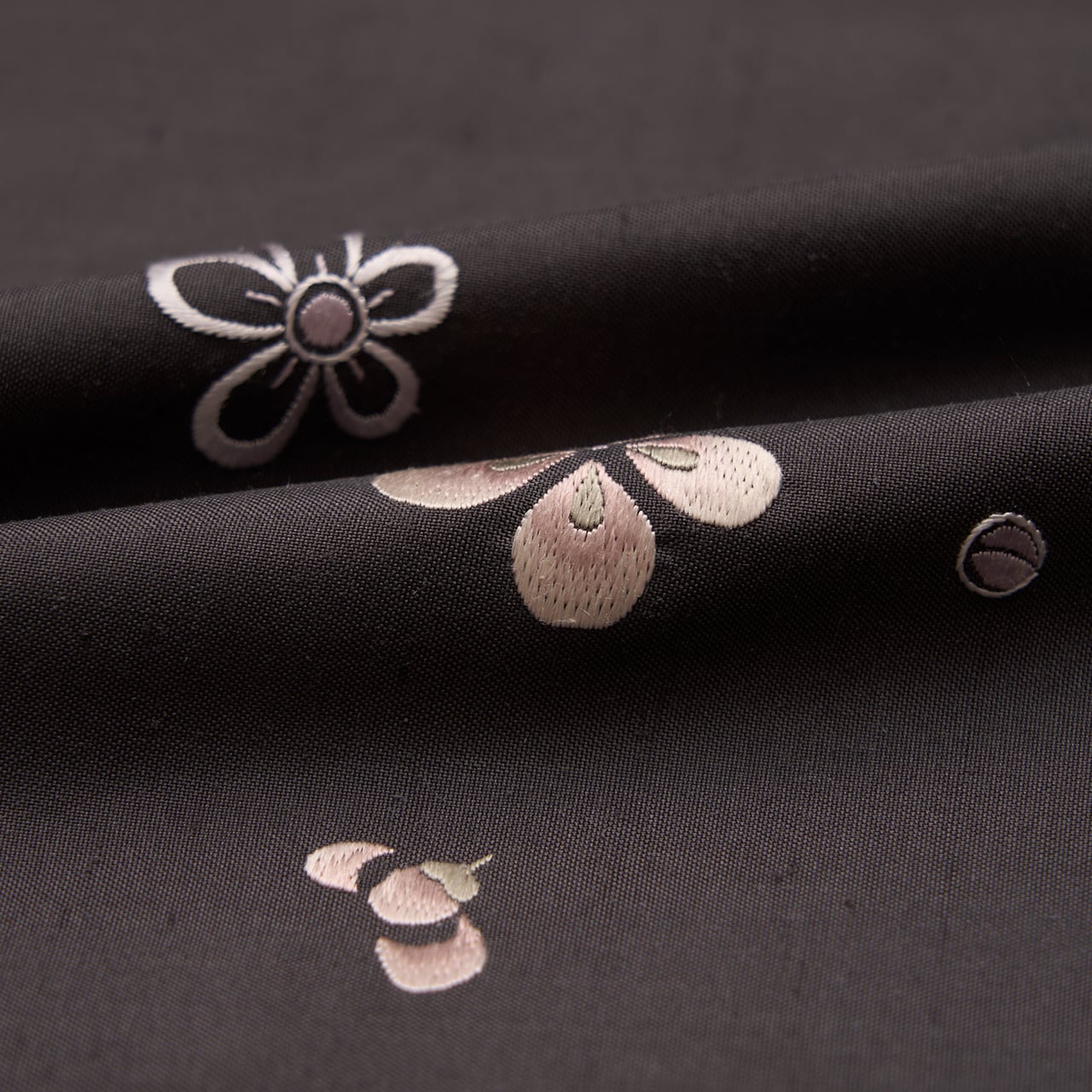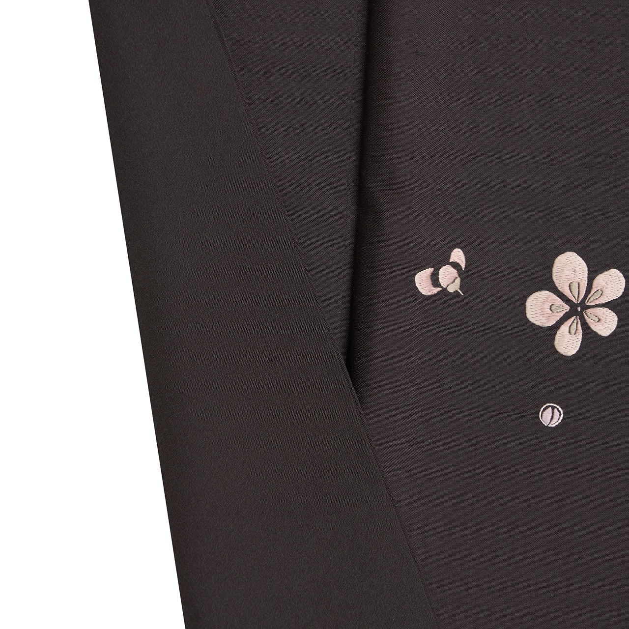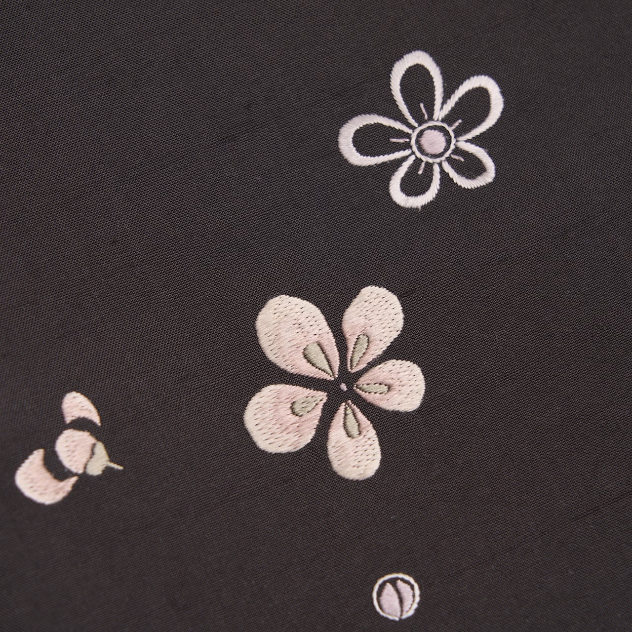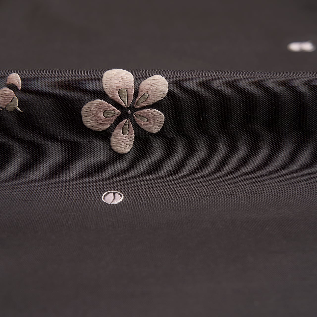 ほんの少し赤味の感じられるような黒といったイメージの深い色が味わい深く、スマートな印象となっていますが、それにほんのりとした淡いピンク系の糸でちらほらと手刺繍が入れられて、少し柔らかい雰囲気を醸し出しています。