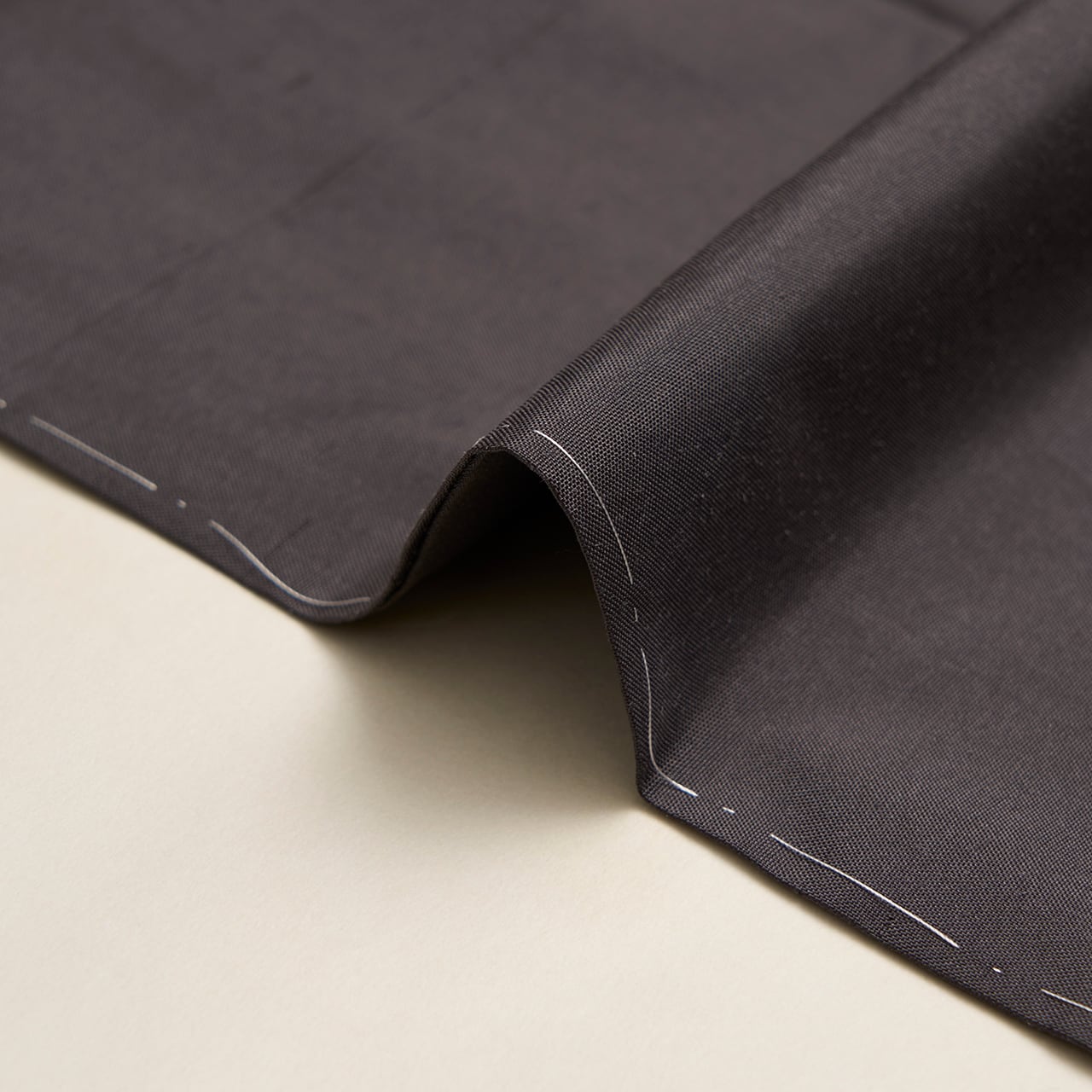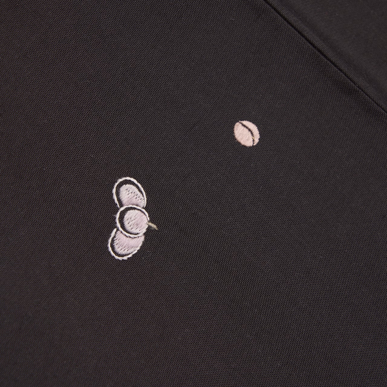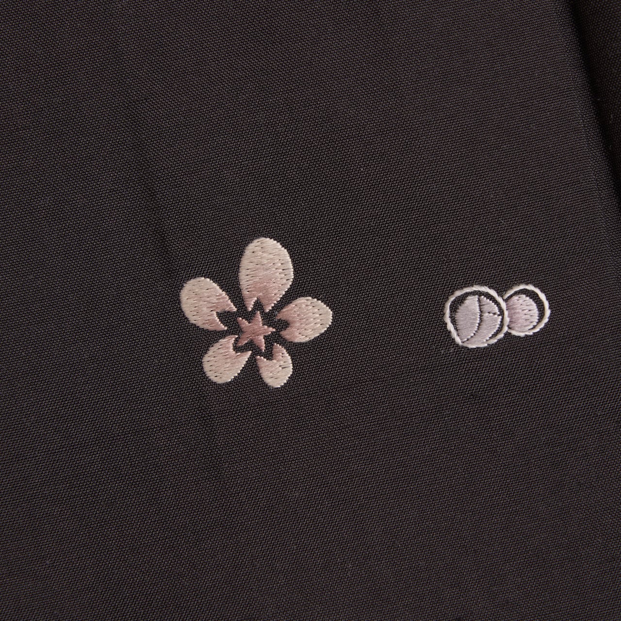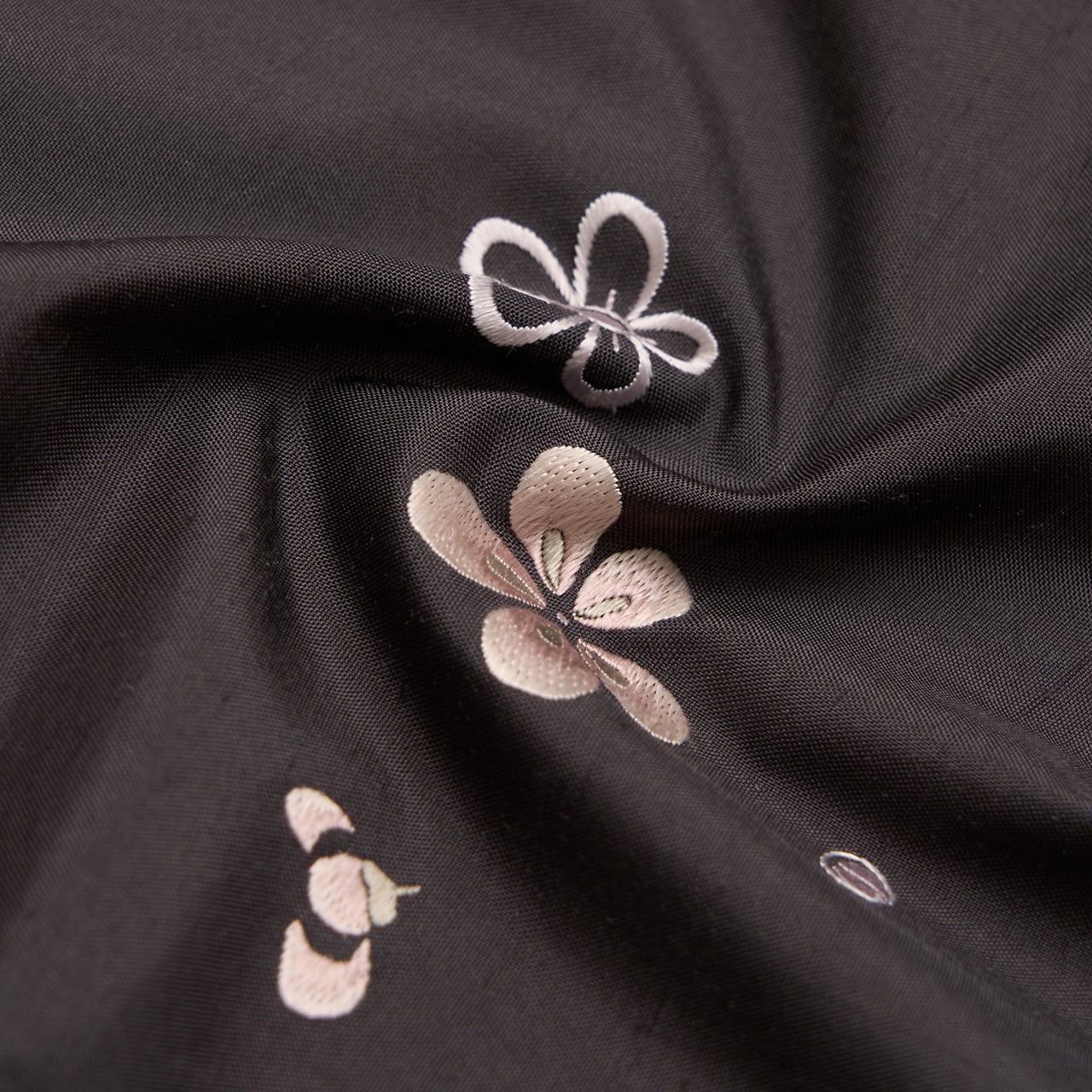 ほんの少し赤味の感じられるような黒といったイメージの深い色が味わい深く、スマートな印象となっていますが、それにほんのりとした淡いピンク系の糸でちらほらと手刺繍が入れられて、少し柔らかい雰囲気を醸し出しています。