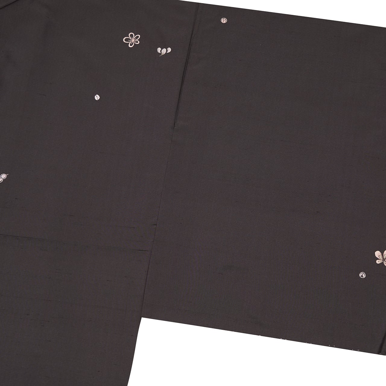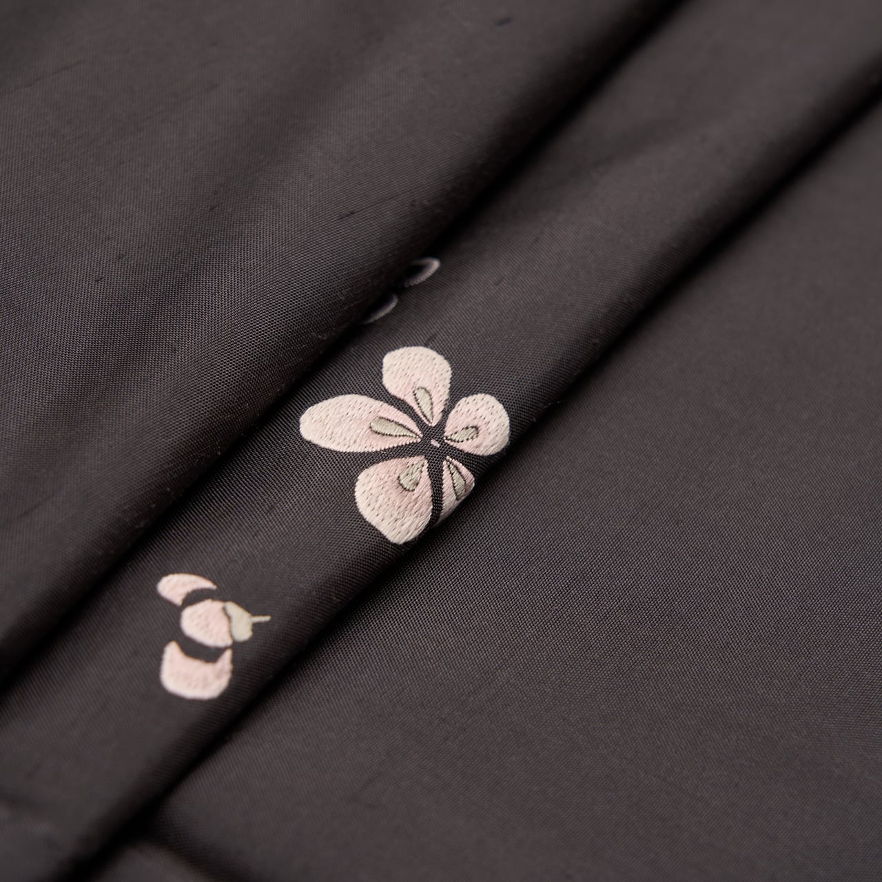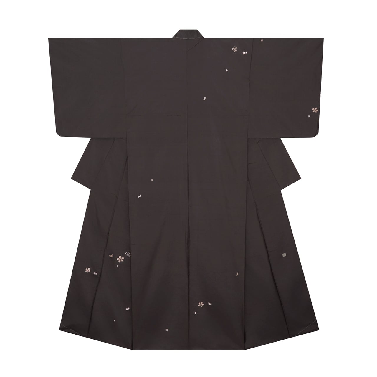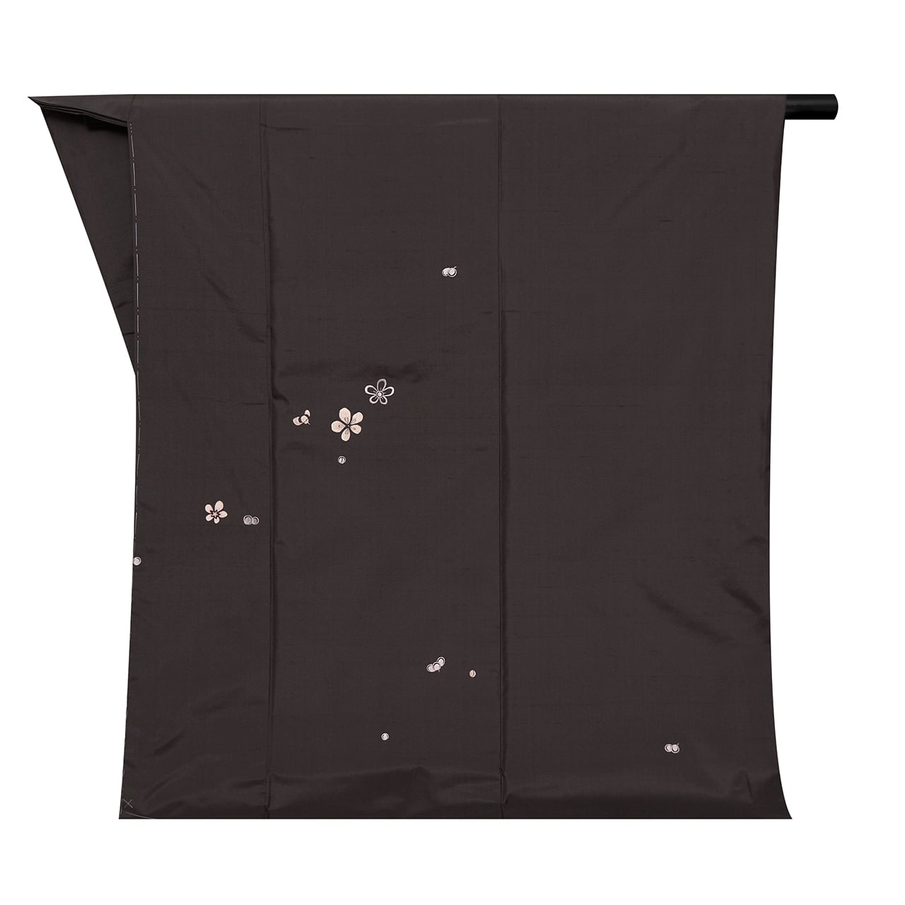 泥染めかと思われる、黒に近い焦げ茶・檳榔子染色の無地の大島紬の生地に、上前や袖、胸、肩などに小さな梅のお花が淡いピンク・灰梅色の糸で手刺繍されて散らされた、とてもお洒落な雰囲気の附下のお着物です。