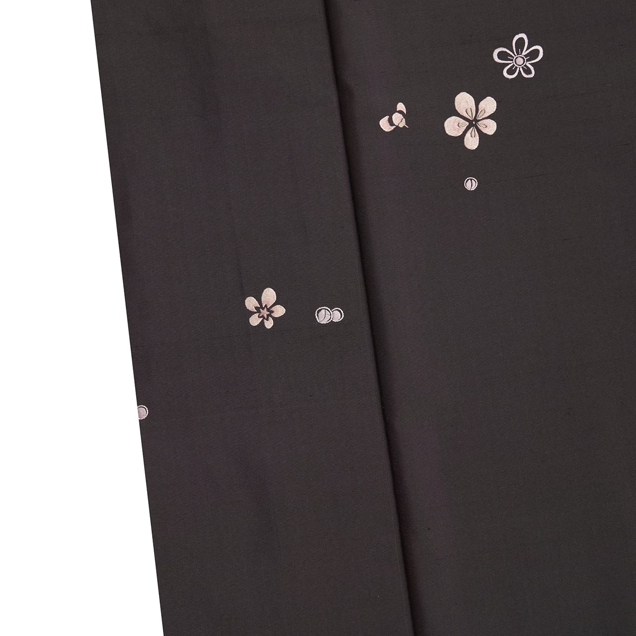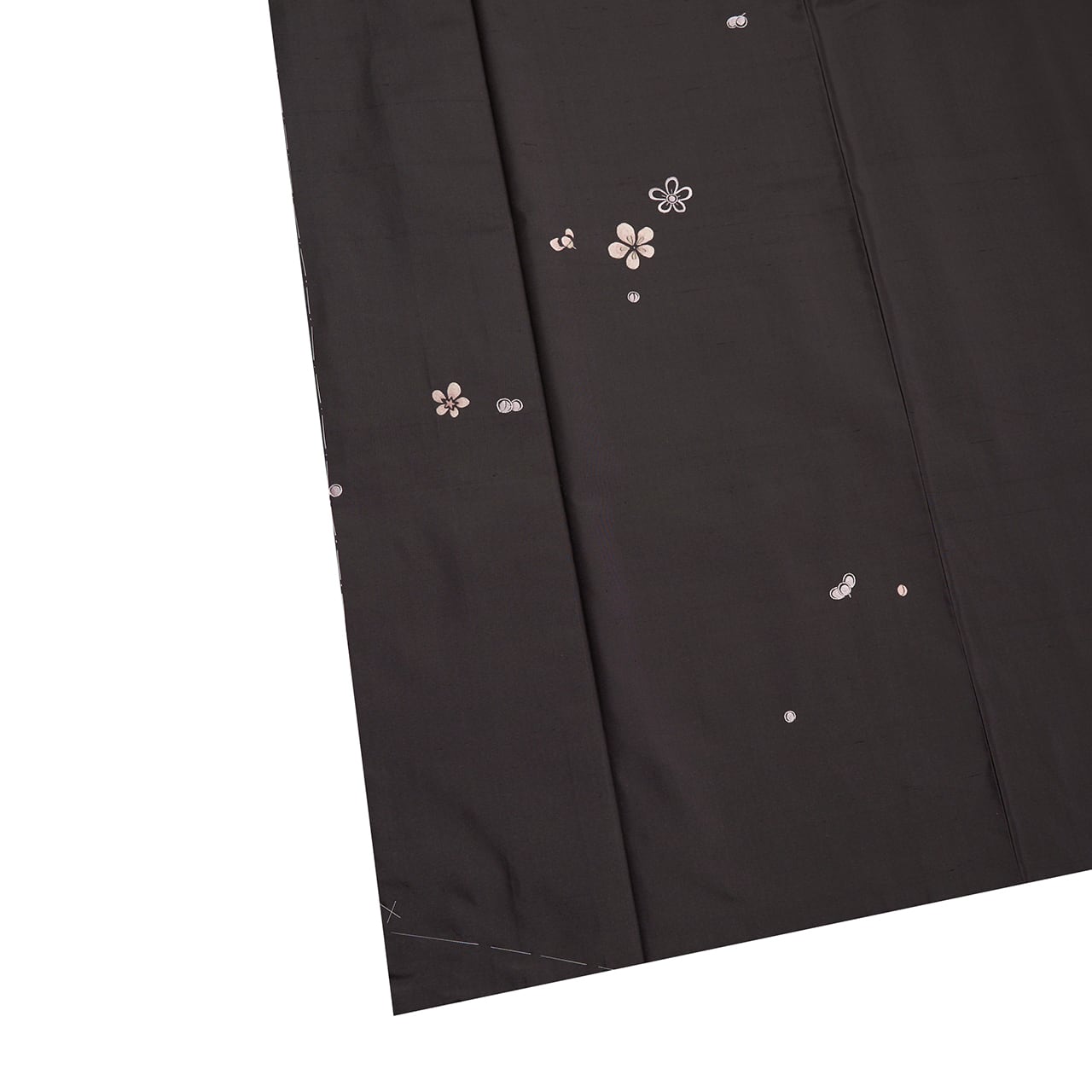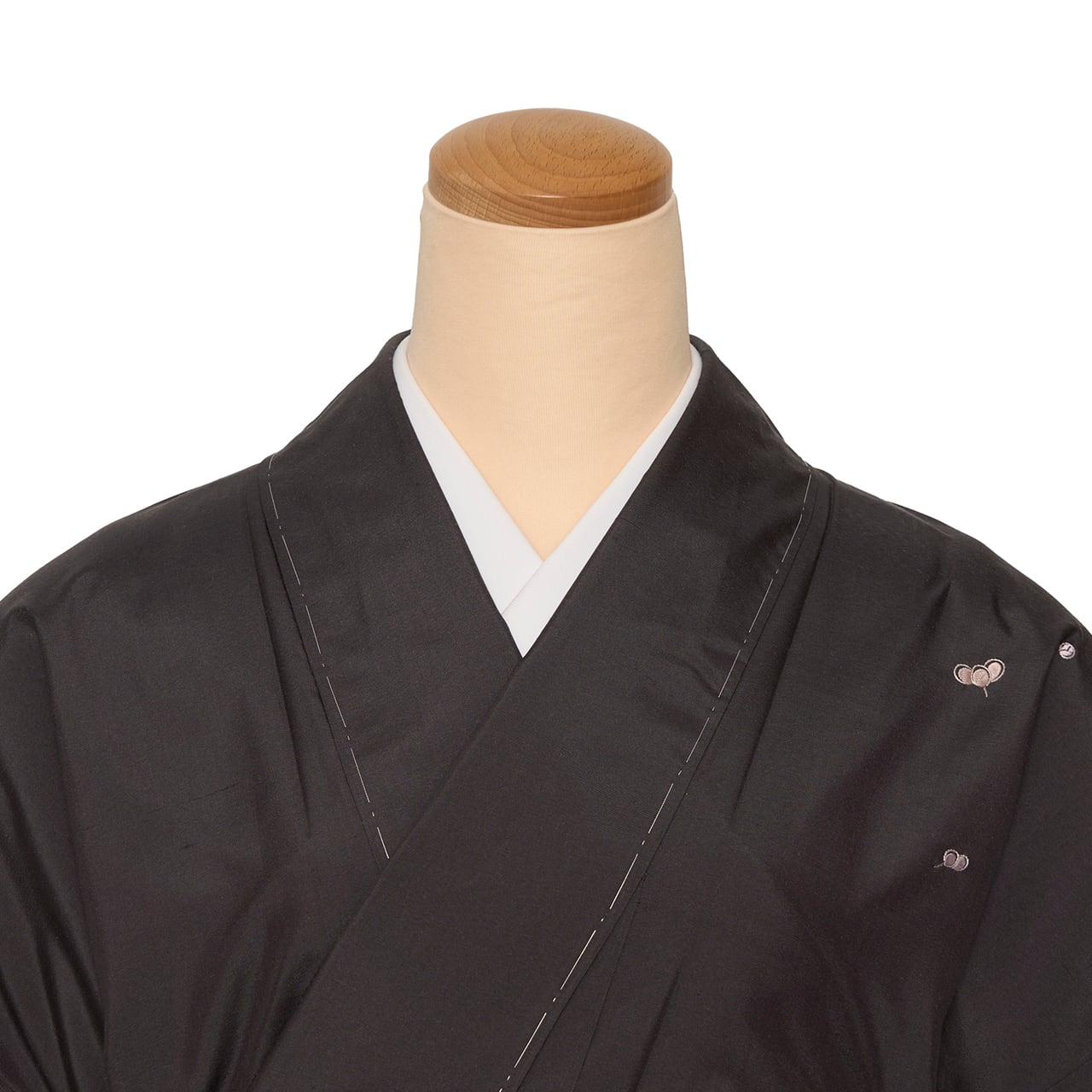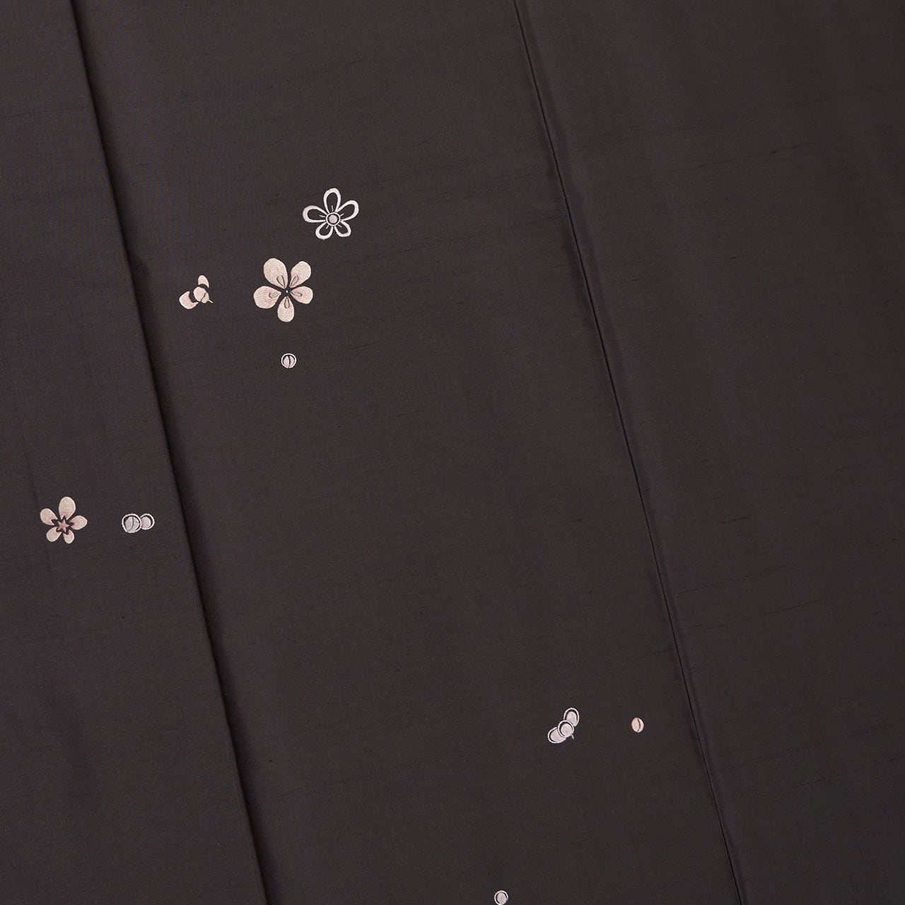 泥染めかと思われる、黒に近い焦げ茶・檳榔子染色の無地の大島紬の生地に、上前や袖、胸、肩などに小さな梅のお花が淡いピンク・灰梅色の糸で手刺繍されて散らされた、とてもお洒落な雰囲気の附下のお着物です。