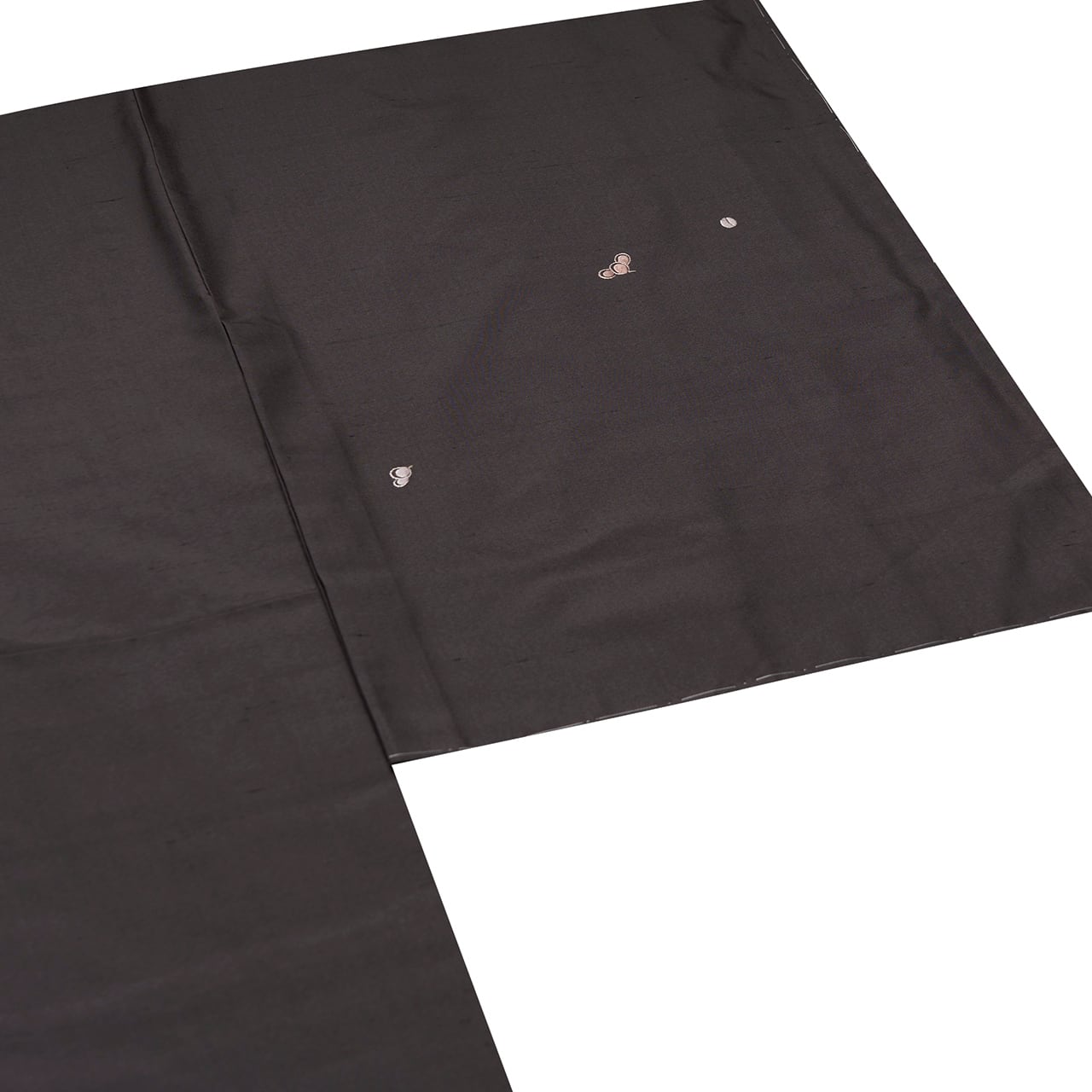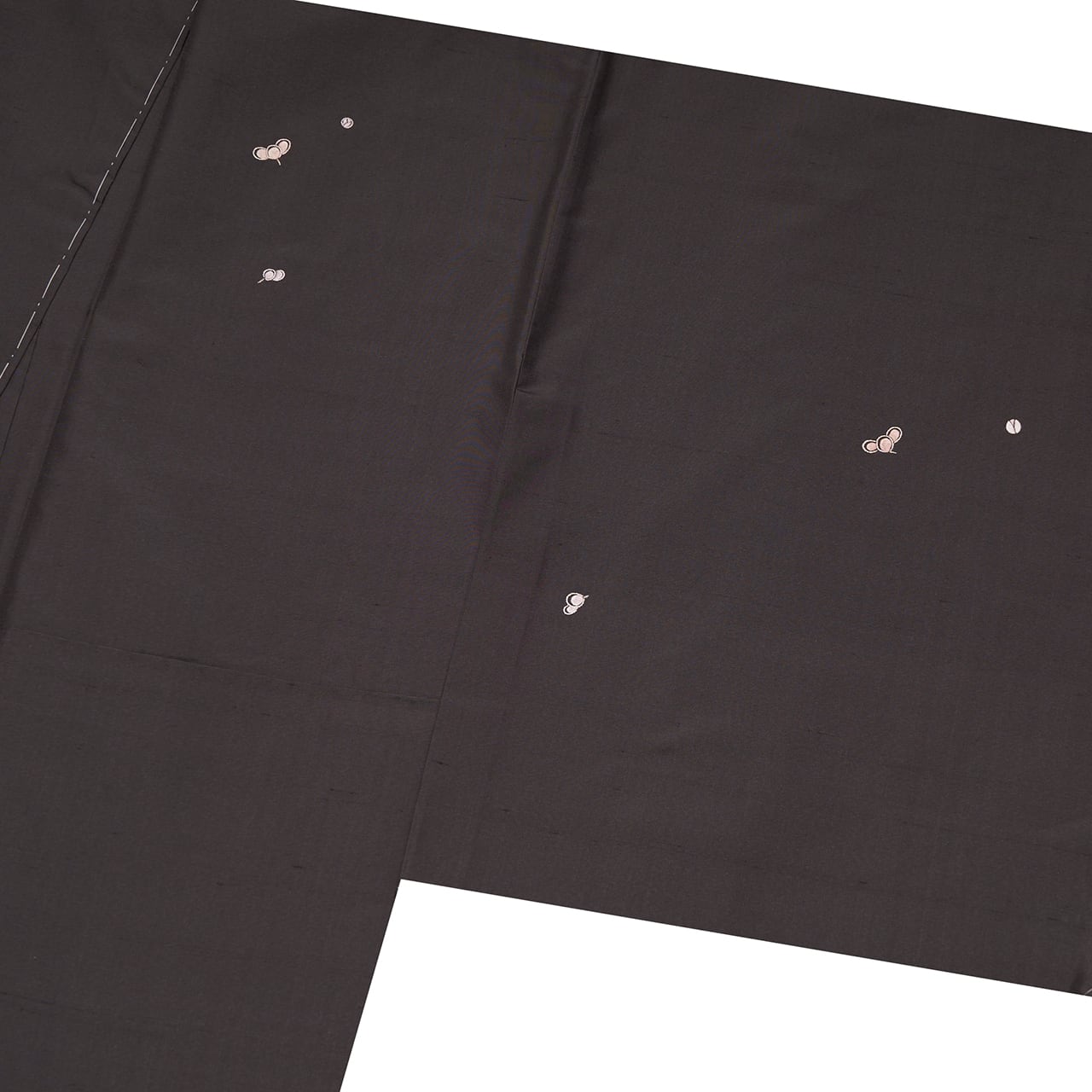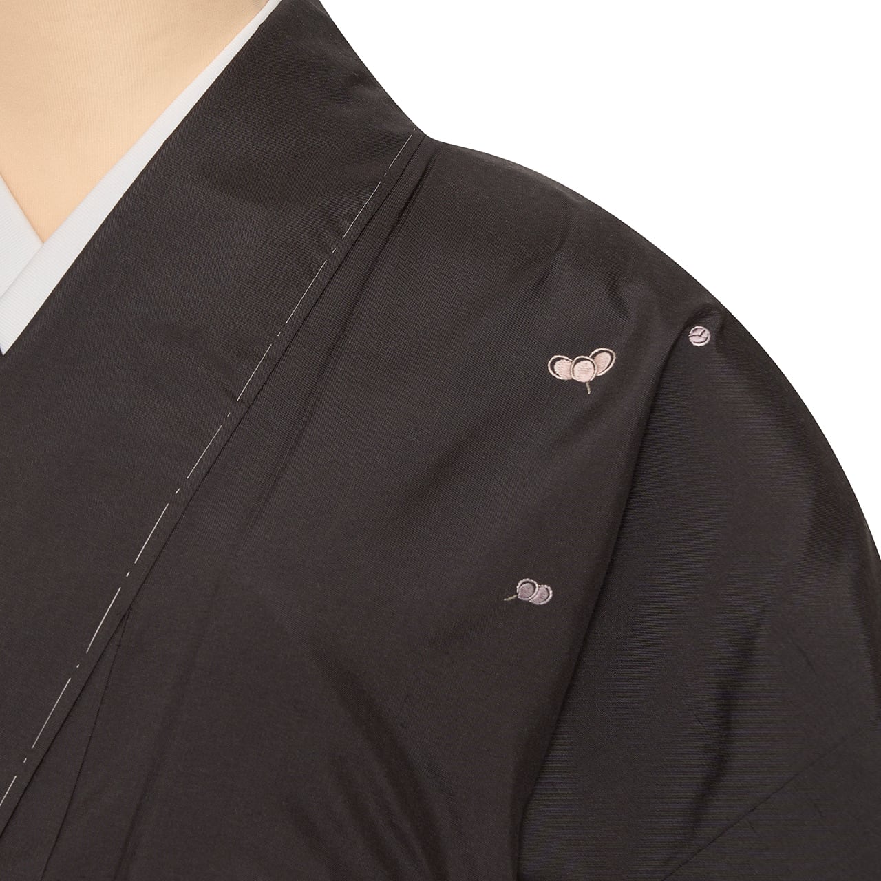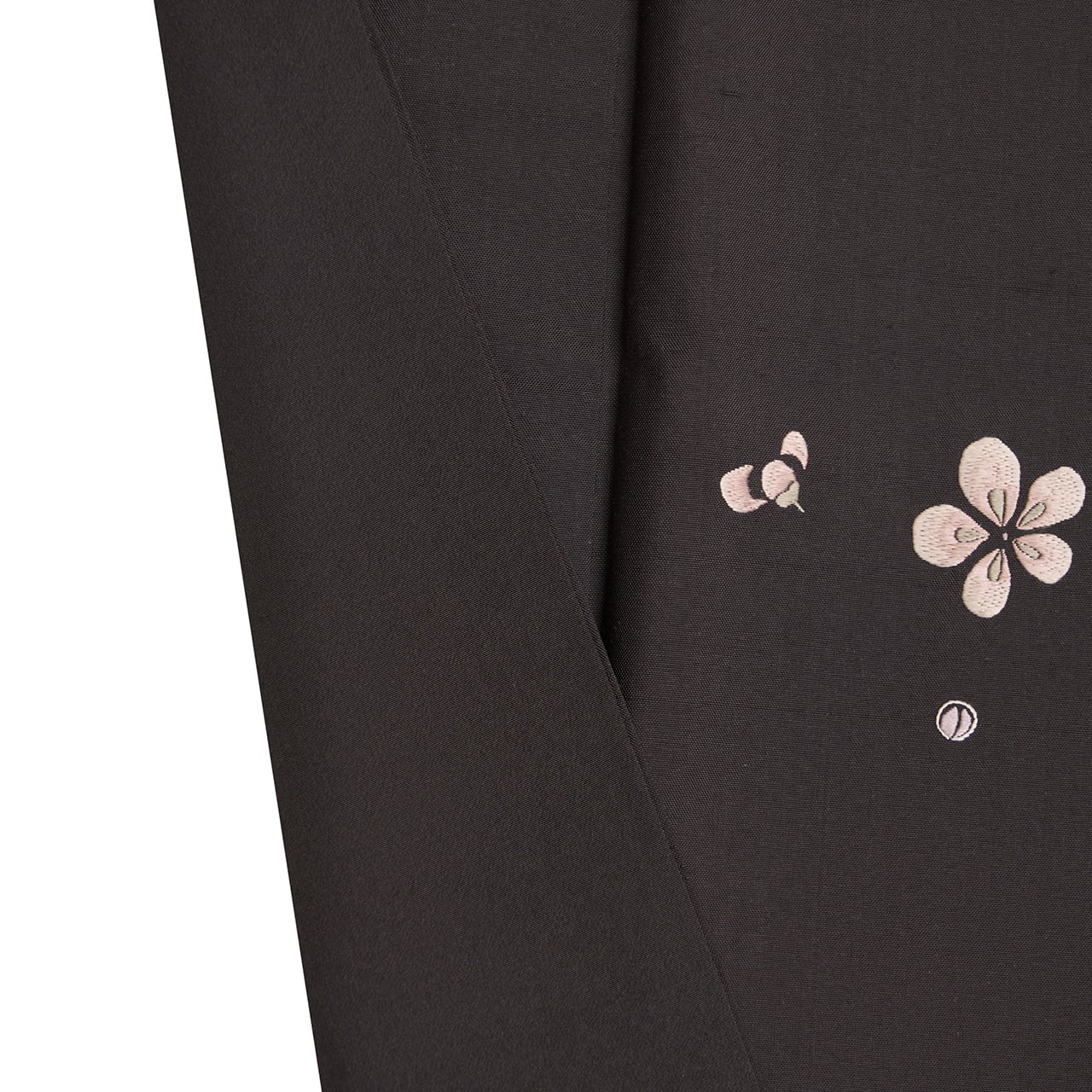 泥染めかと思われる、黒に近い焦げ茶・檳榔子染色の無地の大島紬の生地に、上前や袖、胸、肩などに小さな梅のお花が淡いピンク・灰梅色の糸で手刺繍されて散らされた、とてもお洒落な雰囲気の附下のお着物です。
