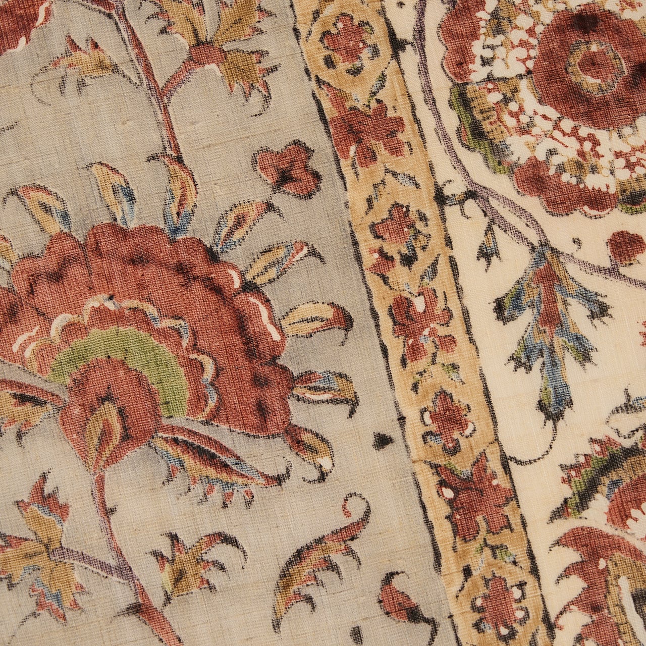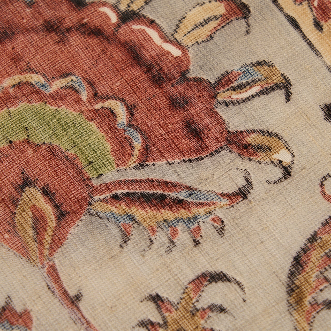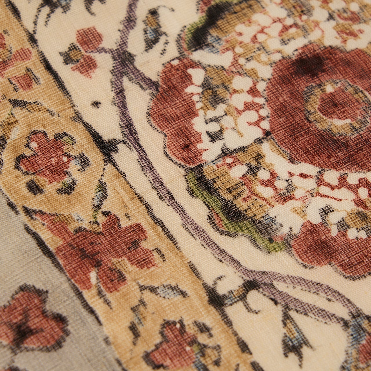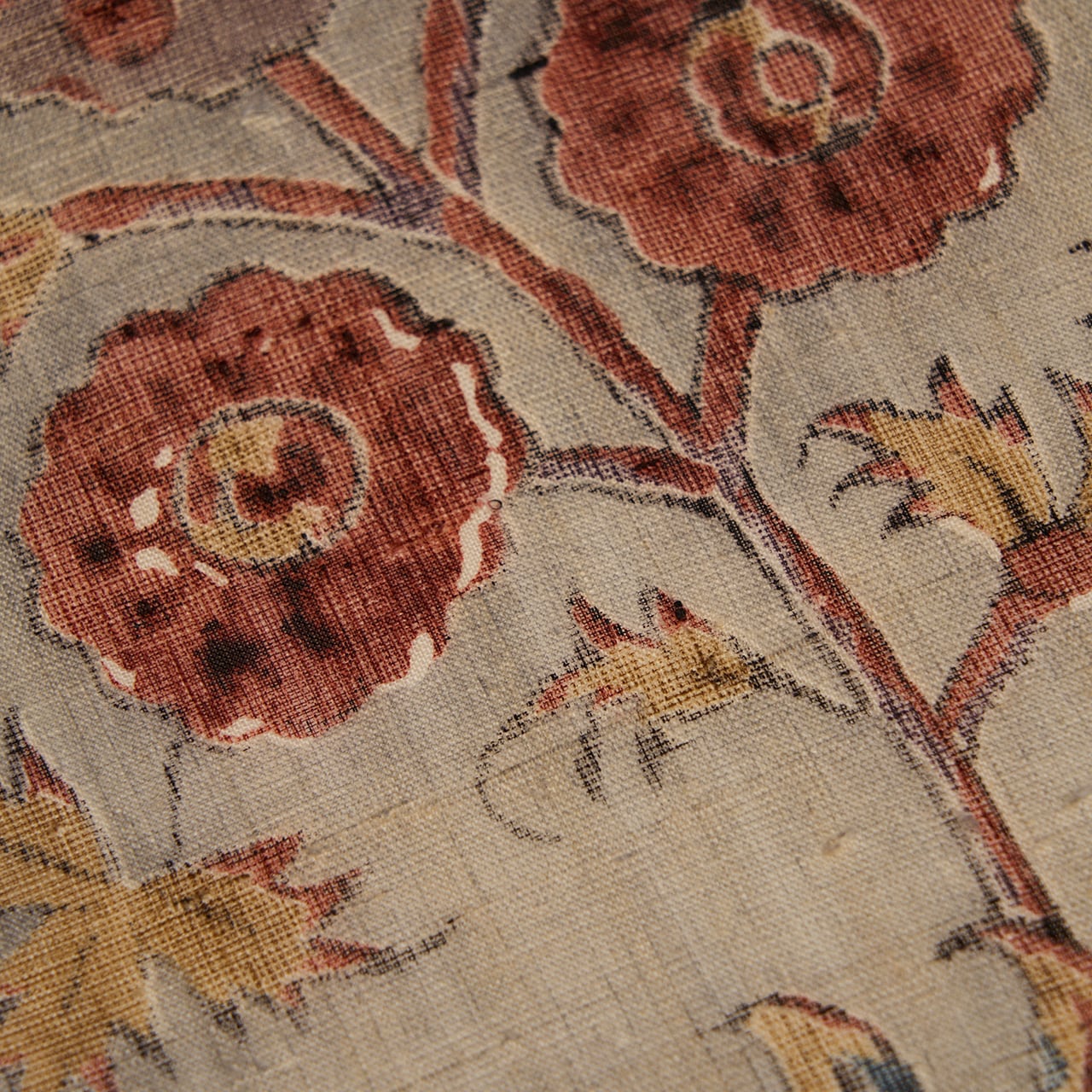 全体的に使われている紅鳶色のくすんだ赤茶色が古いインド茜を連想させるところもありますが、ペルシャ絨毯の模様などに見られる図案を参考にされたそうで、全体的に古色然とした重厚さもあります。