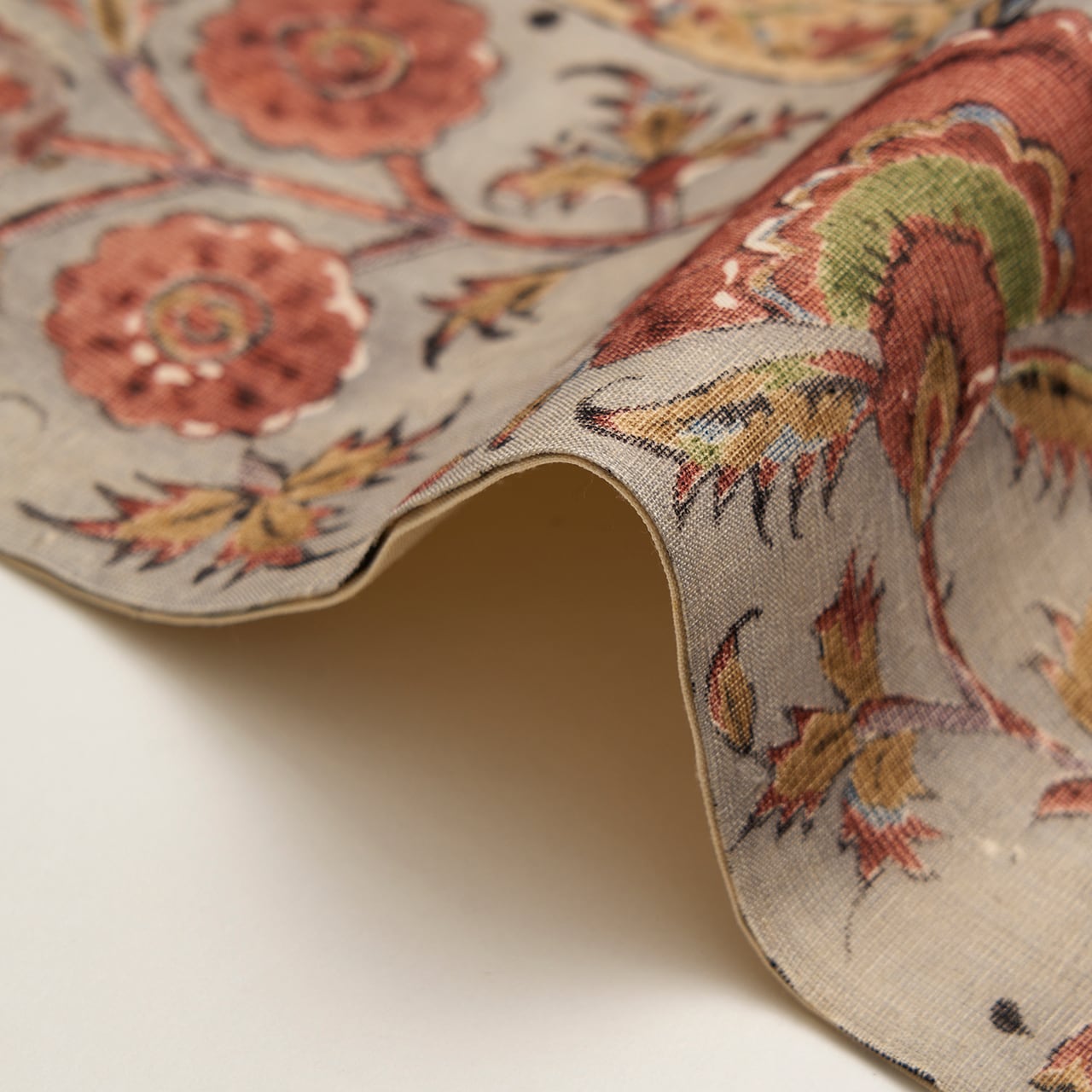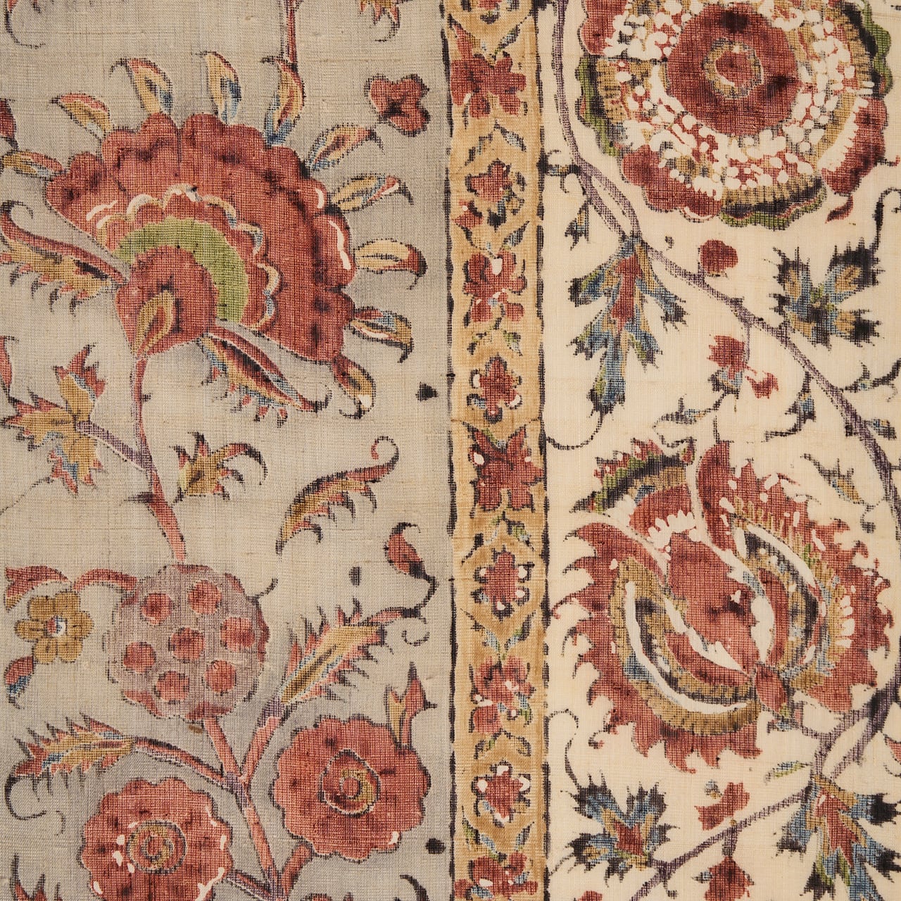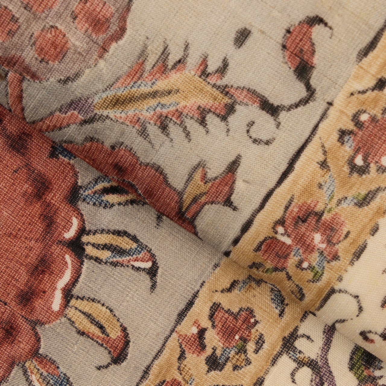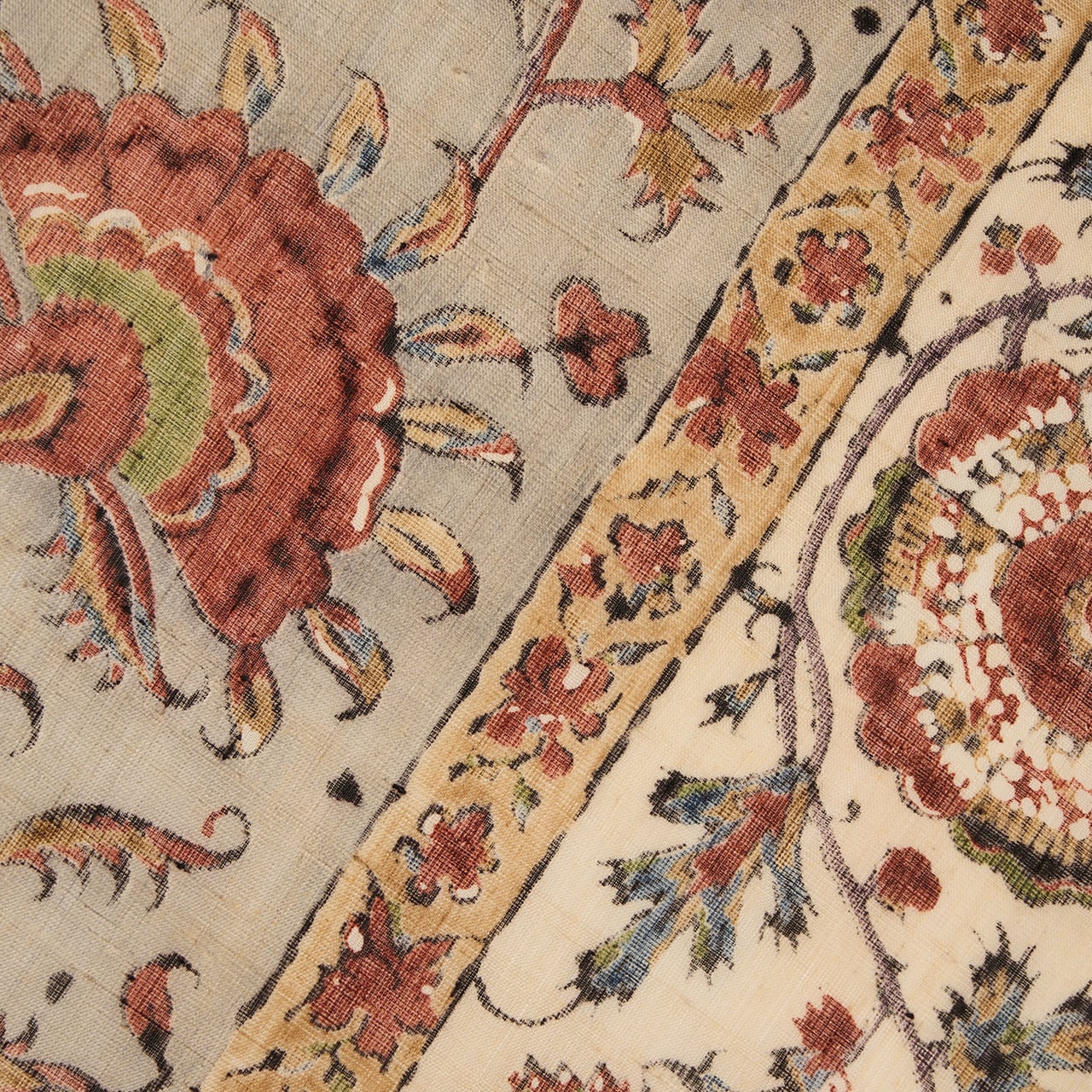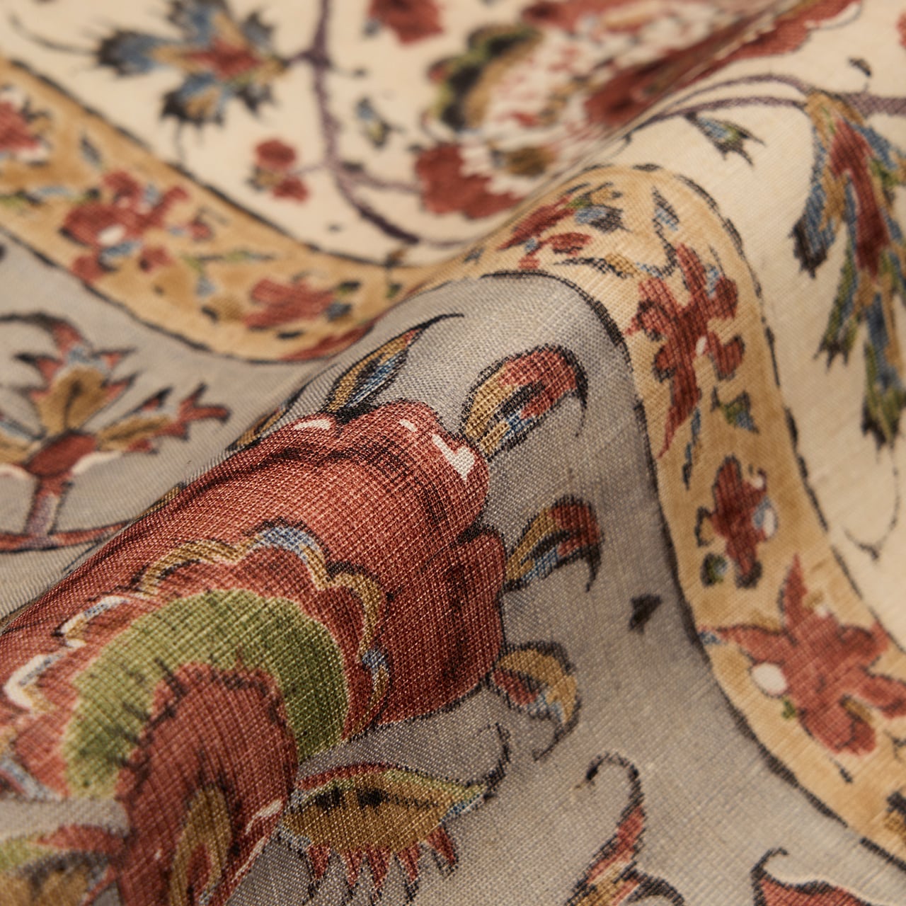 全体的に使われている紅鳶色のくすんだ赤茶色が古いインド茜を連想させるところもありますが、ペルシャ絨毯の模様などに見られる図案を参考にされたそうで、全体的に古色然とした重厚さもあります。
