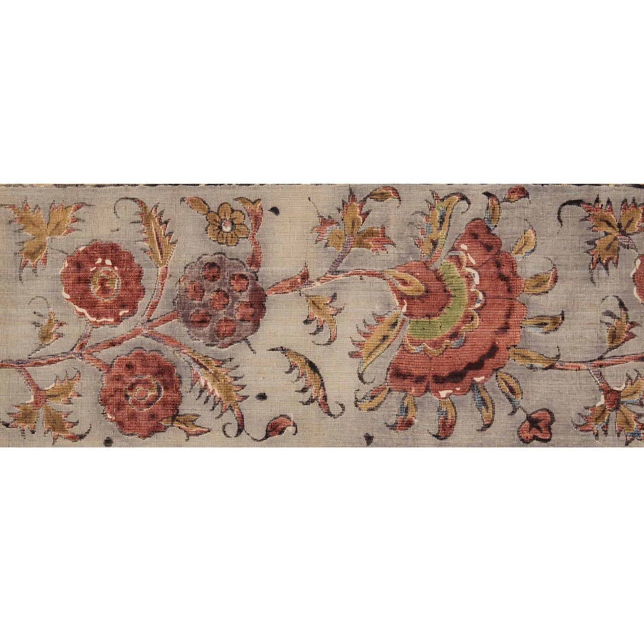 緯糸に節が見られ、そして少し張りのある質感の座繰りの灰白色の生紬の生地に、ほぼ2分割にされた左側が淡いグレー・利休白茶色で染められ、右側には飴色のボーダーが取られた中に小さなお花の模様が染められ、左右の大きな幅の部分にはそれぞれに大胆な調子の唐花模様が全面に描かれた、素敵な更紗模様の九寸名古屋帯です。