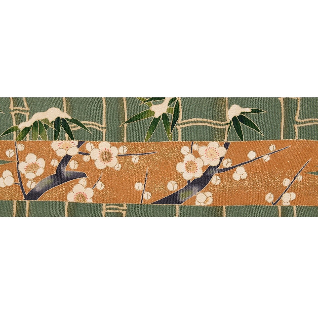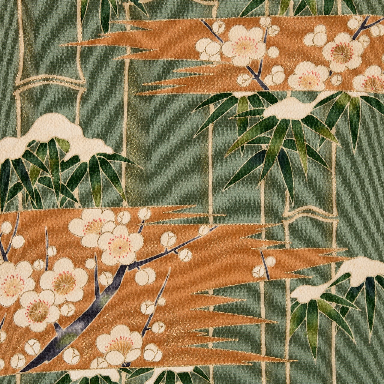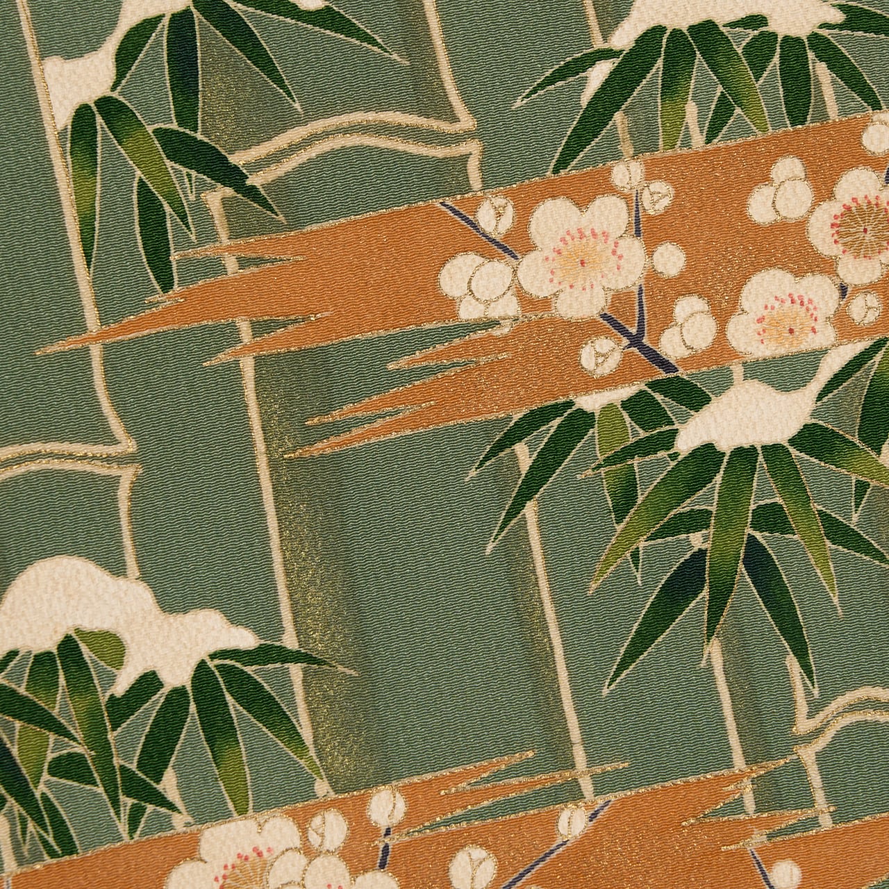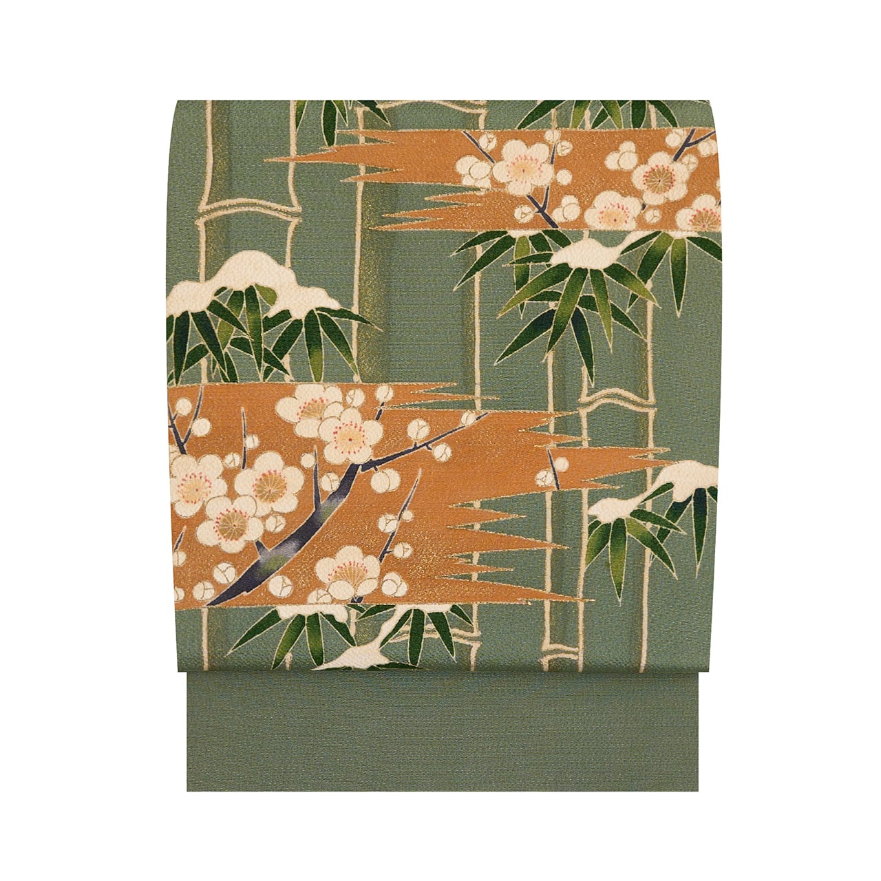 シボのあるしっかりとしたちりめんの生地が、少しだけ青味のある緑・青鈍色に染められ、お太鼓には何本かの太い幹の竹が亜麻色の輪郭で描かれ、葉には白い雪が積もっていて、それを背景にして冷たい空気を打ち破るような代赭色の霞が取られ、その中には白くふっくらとした花びらの綺麗な梅のお花が咲いているといった、早い春を思わせるような情景が手描きの友禅で描かれた、とても素晴らしい九寸名古屋帯です。