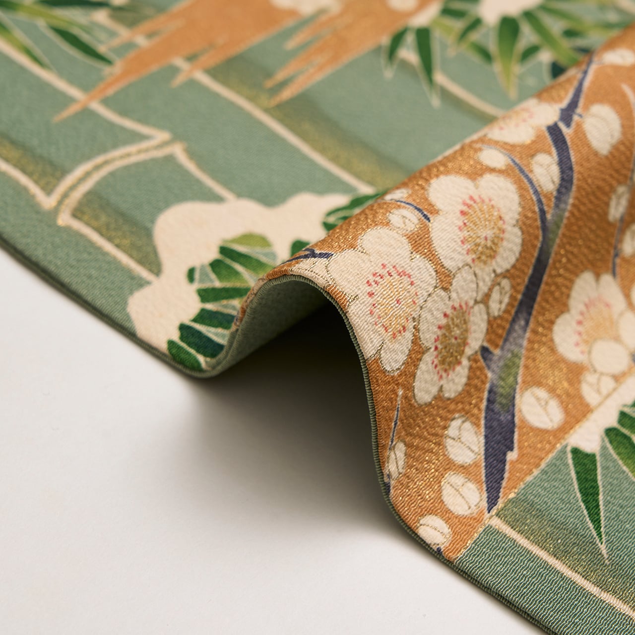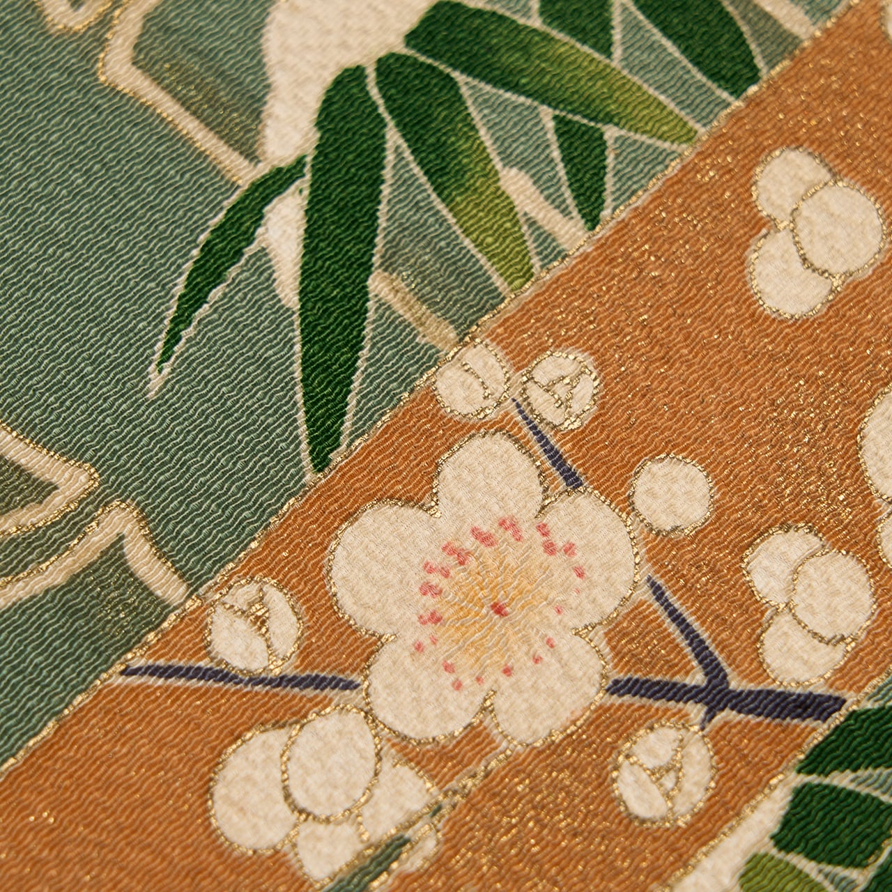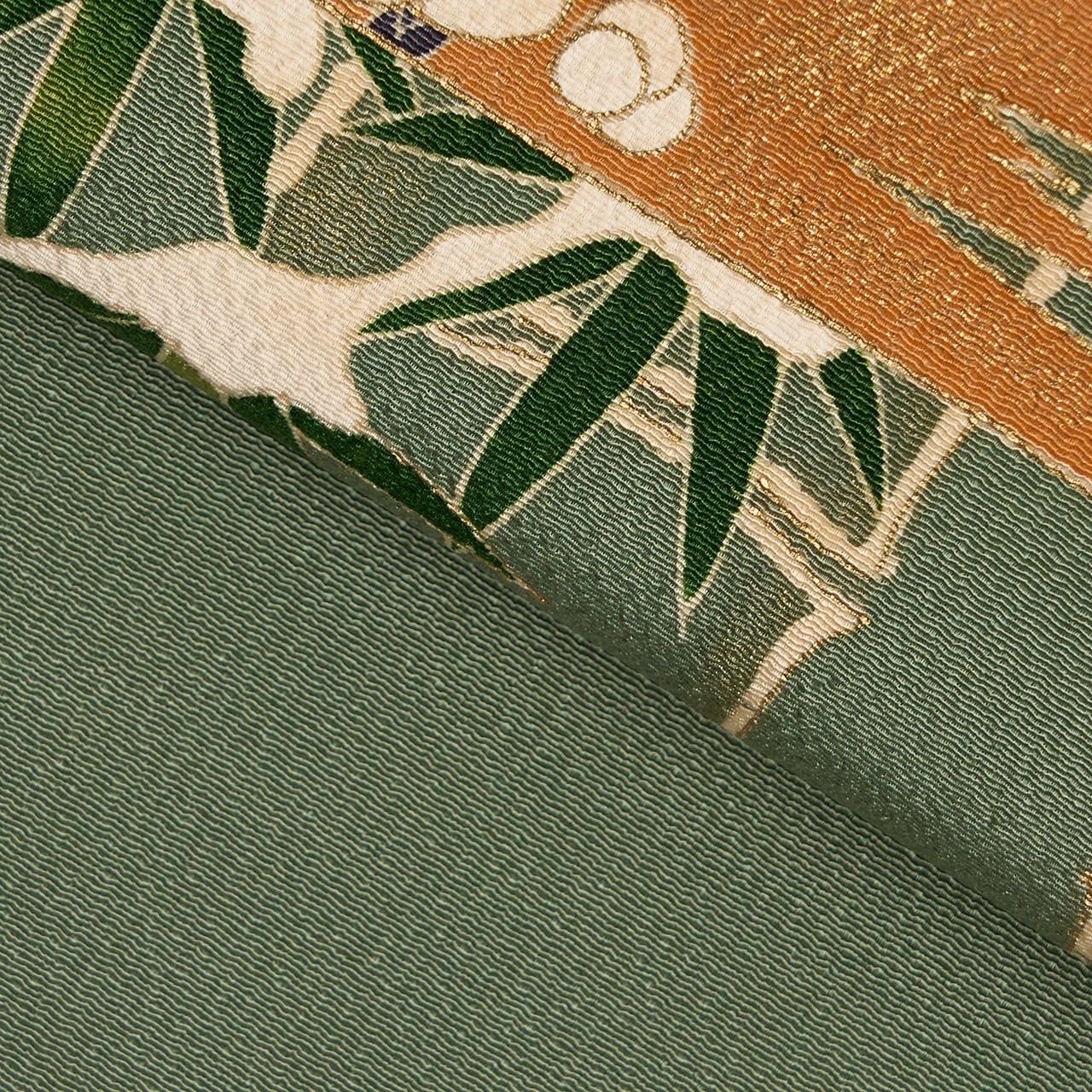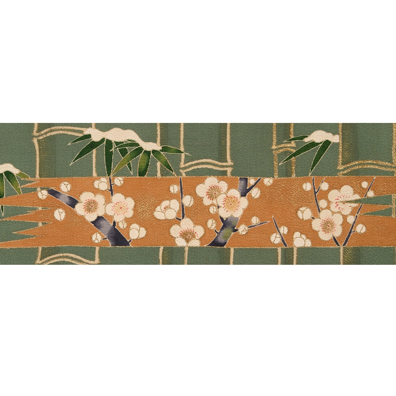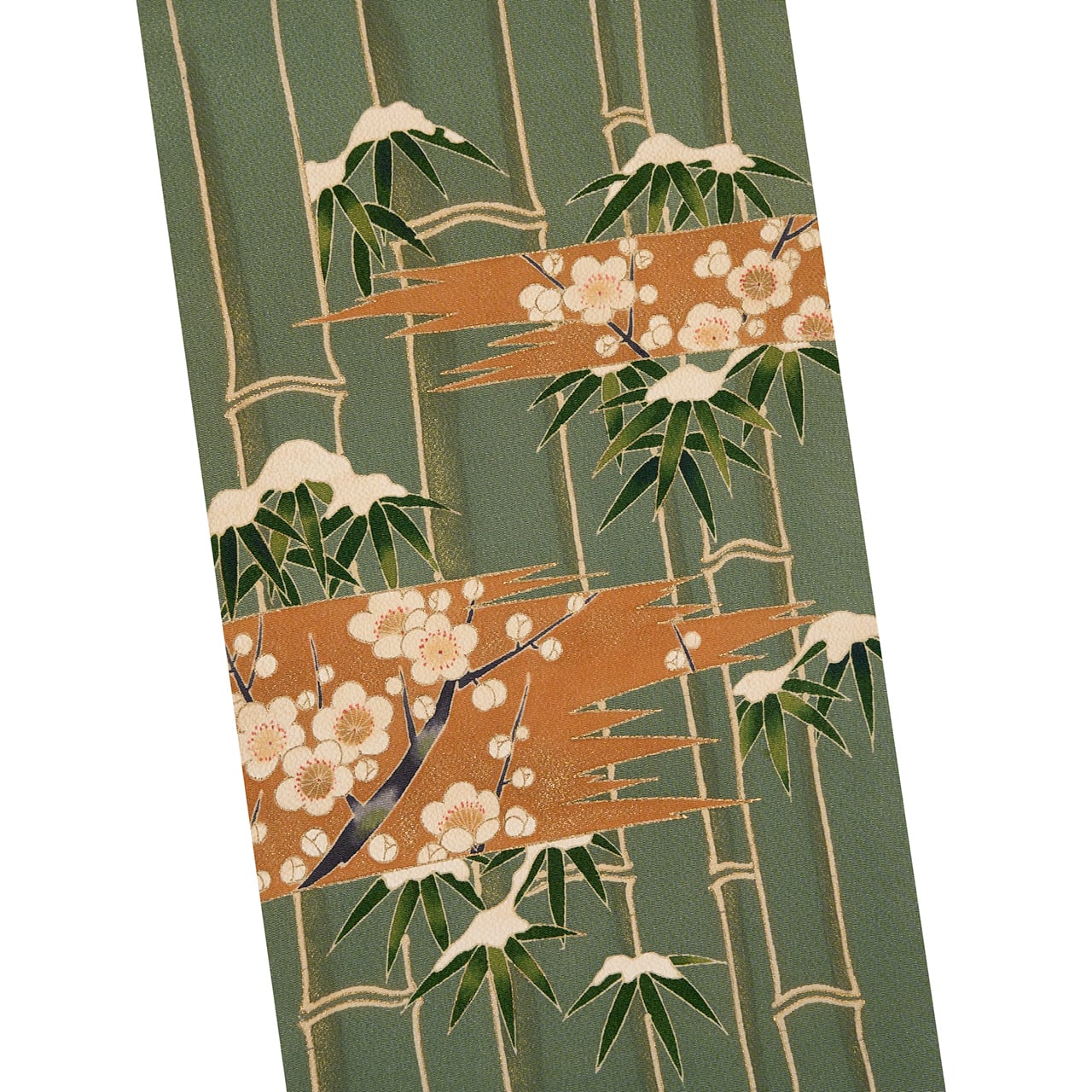 シボのあるしっかりとしたちりめんの生地が、少しだけ青味のある緑・青鈍色に染められ、お太鼓には何本かの太い幹の竹が亜麻色の輪郭で描かれ、葉には白い雪が積もっていて、それを背景にして冷たい空気を打ち破るような代赭色の霞が取られ、その中には白くふっくらとした花びらの綺麗な梅のお花が咲いているといった、早い春を思わせるような情景が手描きの友禅で描かれた、とても素晴らしい九寸名古屋帯です。