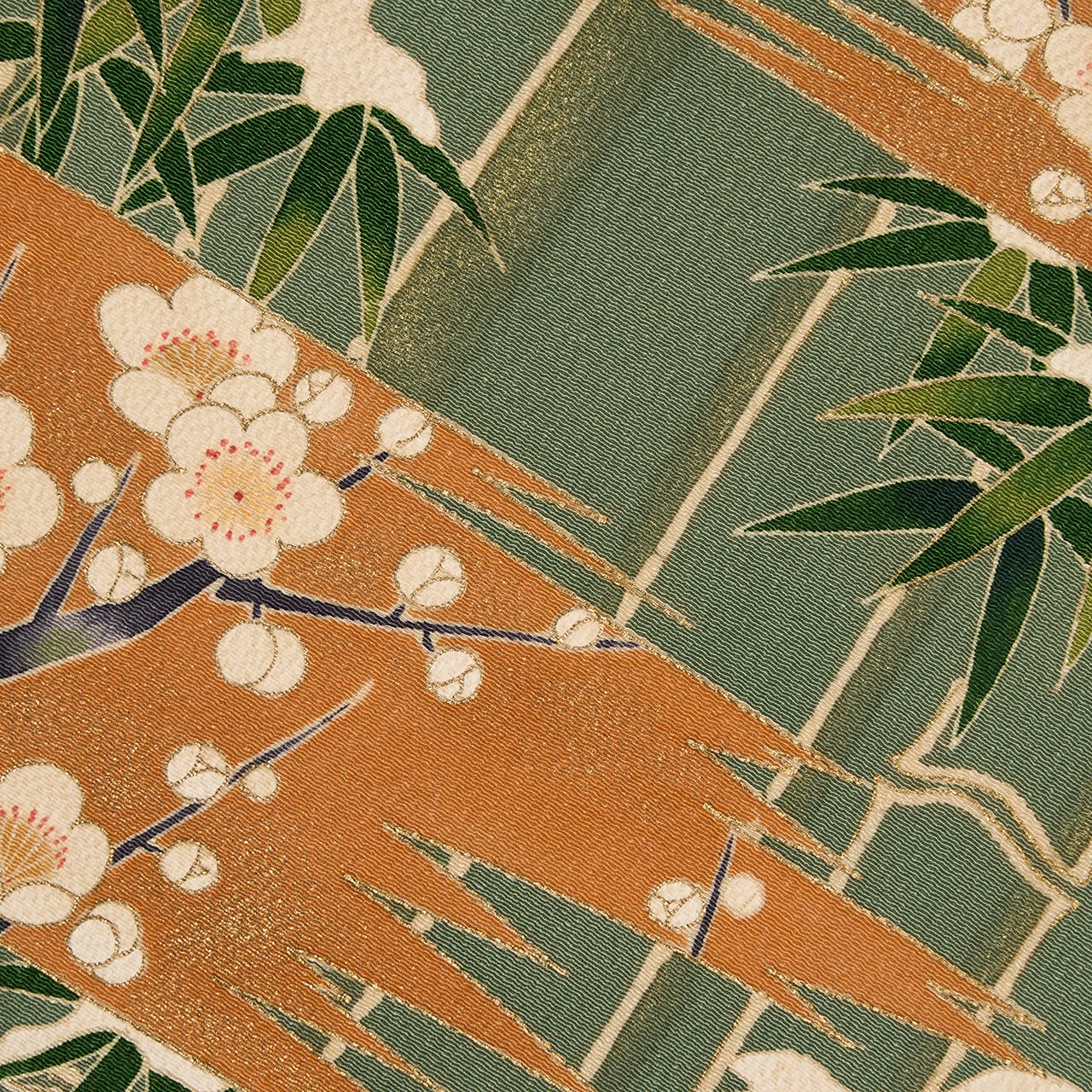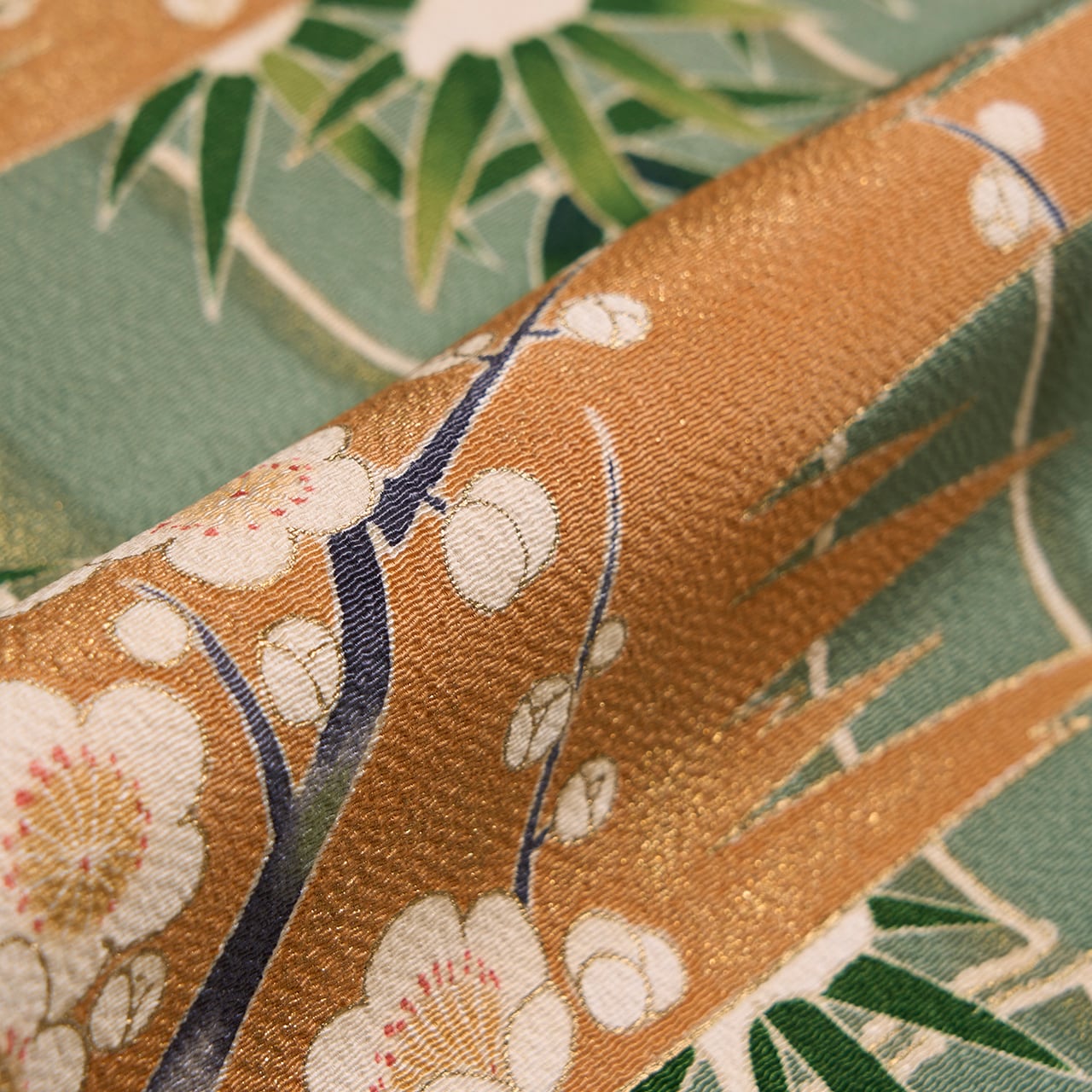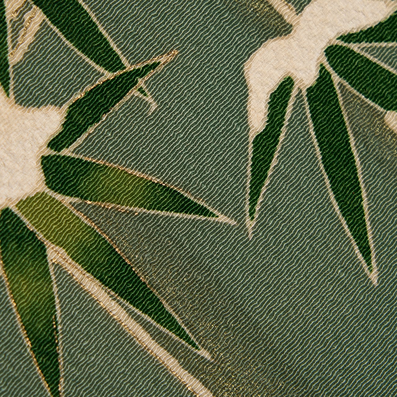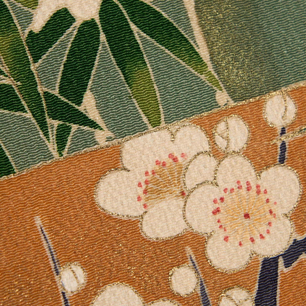 シボのあるしっかりとしたちりめんの生地が、少しだけ青味のある緑・青鈍色に染められ、お太鼓には何本かの太い幹の竹が亜麻色の輪郭で描かれ、葉には白い雪が積もっていて、それを背景にして冷たい空気を打ち破るような代赭色の霞が取られ、その中には白くふっくらとした花びらの綺麗な梅のお花が咲いているといった、早い春を思わせるような情景が手描きの友禅で描かれた、とても素晴らしい九寸名古屋帯です。