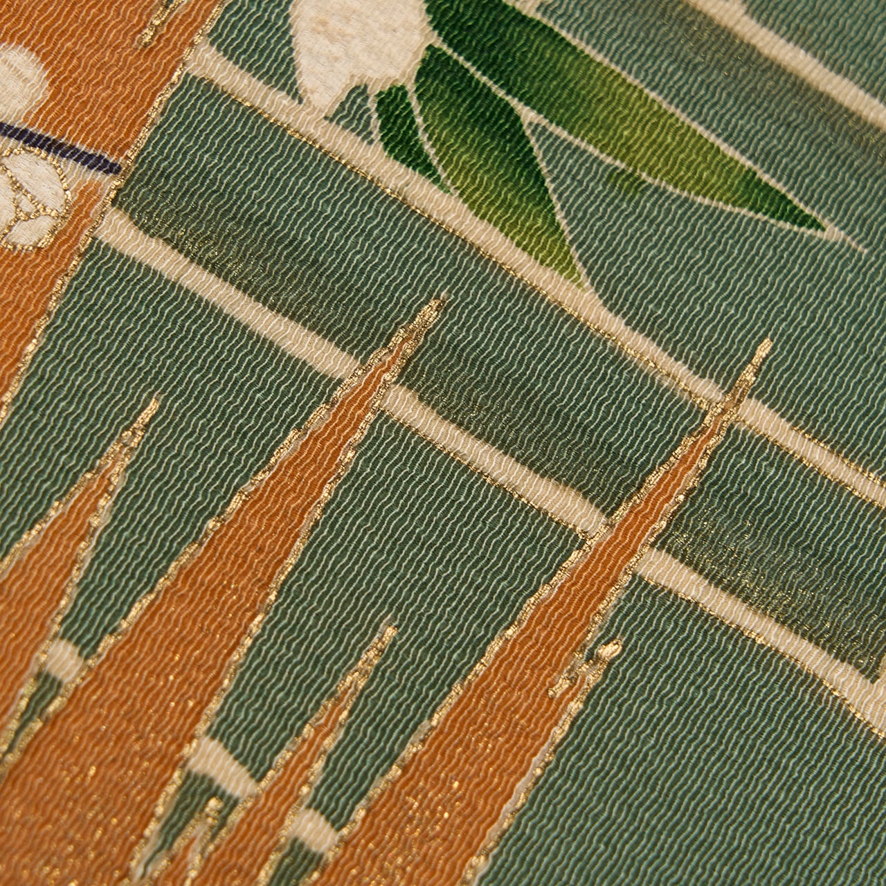構図や色使い、真糊でしっかりと描かれているところや、摺り金の加工が施されているところなどから、おそらく東京友禅の作家作品と思われます。