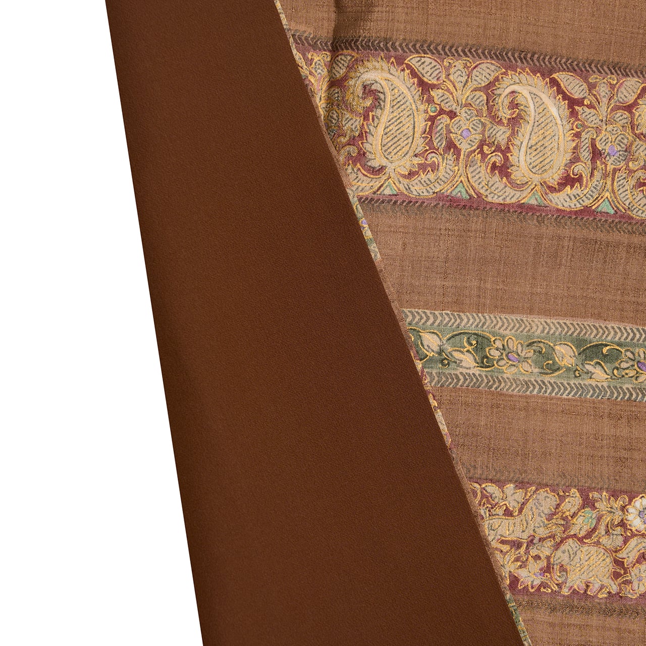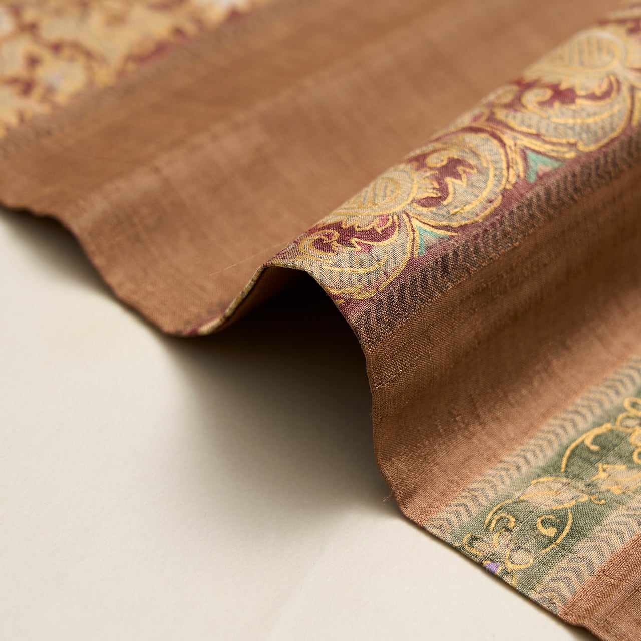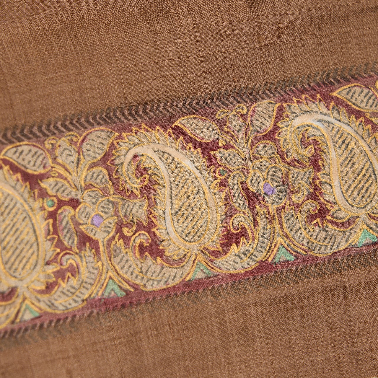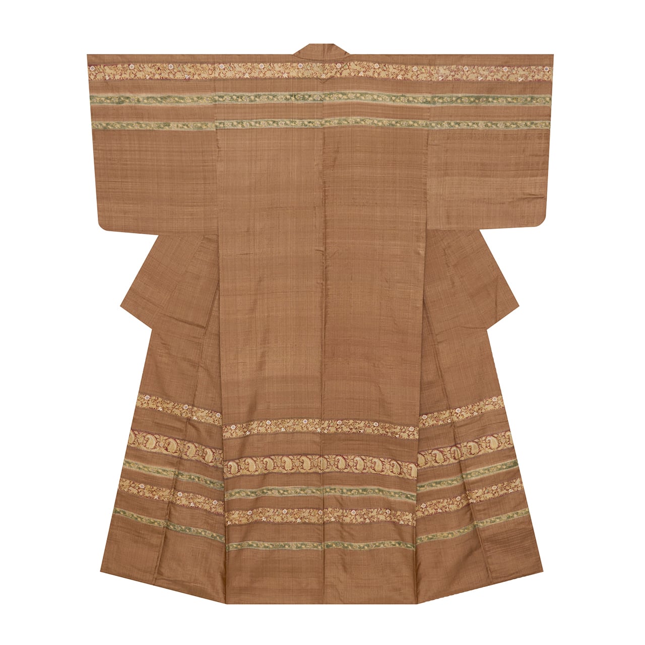 こちらは地の色が少し赤味のある薄茶・柿茶色に染められていて、上前から下前にぐるっとつながる裾周りと、肩から袖につながるようにいろいろな幅のボーダーが取られ、そのボーダーの中にはペイズリーのような木の葉のような模様、花唐草の模様、そして象やトラなどの動物が連続している模様が更紗調の手描きで描かれて、縁取りには金彩が施された、いわゆる金更紗模様の附下のお着物です。