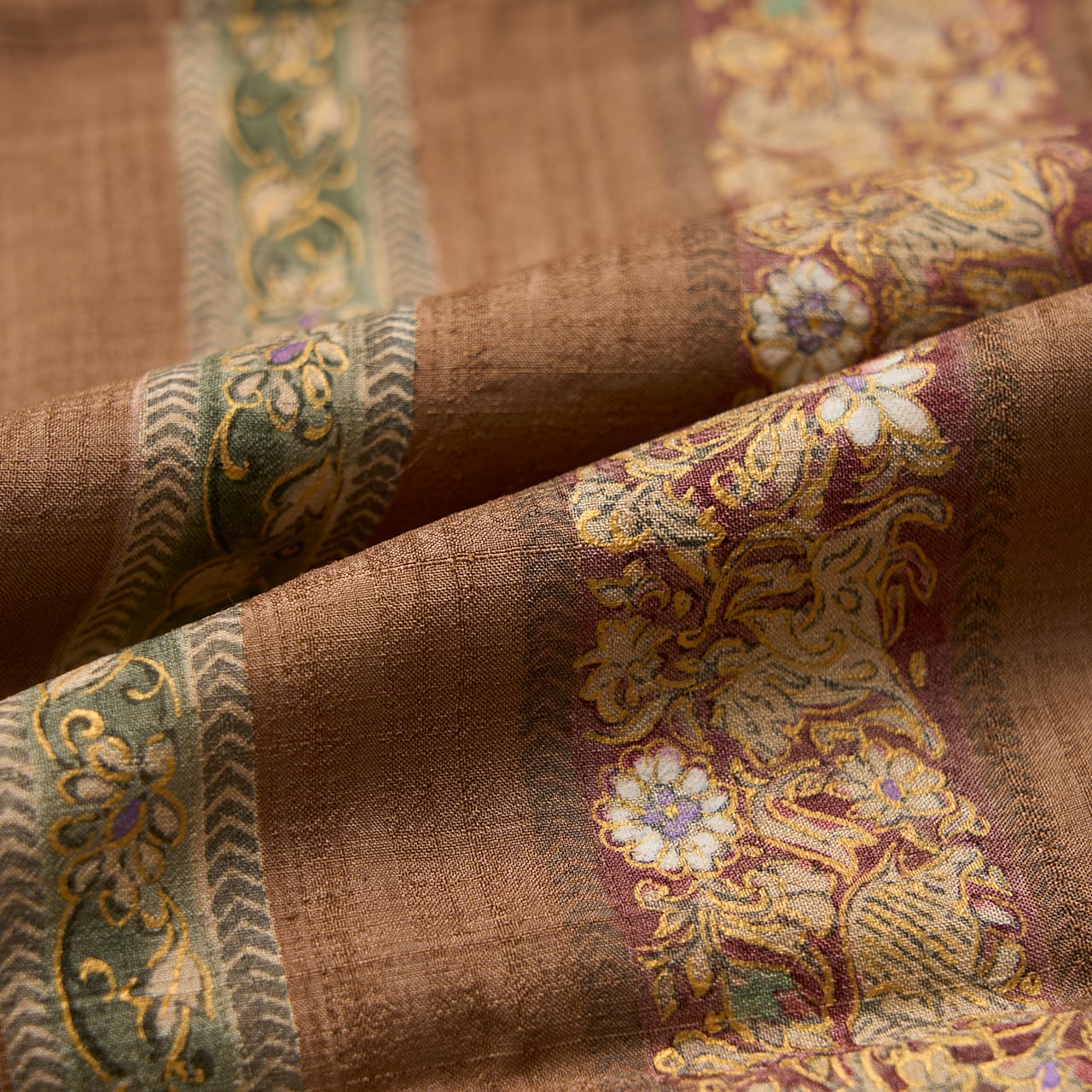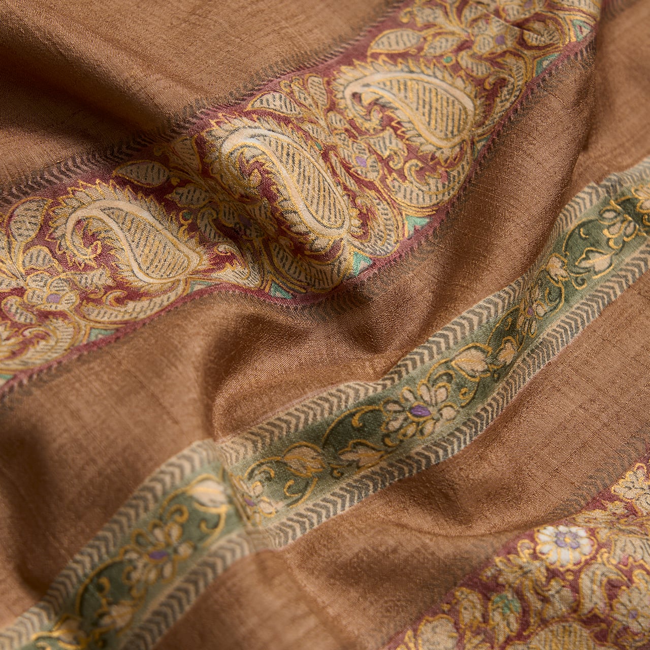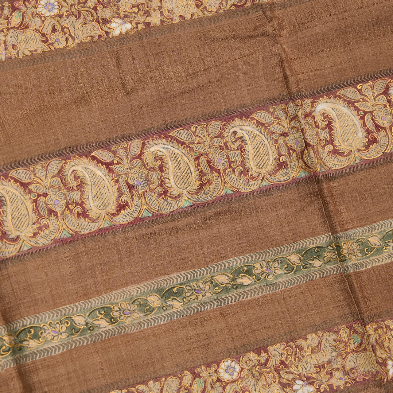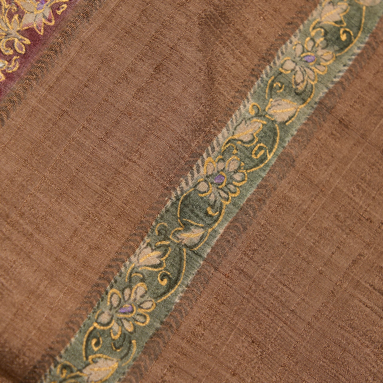 こちらは地の色が少し赤味のある薄茶・柿茶色に染められていて、上前から下前にぐるっとつながる裾周りと、肩から袖につながるようにいろいろな幅のボーダーが取られ、そのボーダーの中にはペイズリーのような木の葉のような模様、花唐草の模様、そして象やトラなどの動物が連続している模様が更紗調の手描きで描かれて、縁取りには金彩が施された、いわゆる金更紗模様の附下のお着物です。