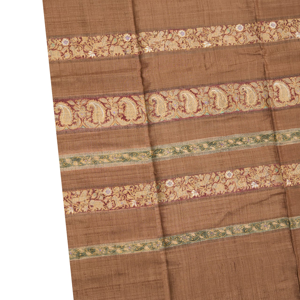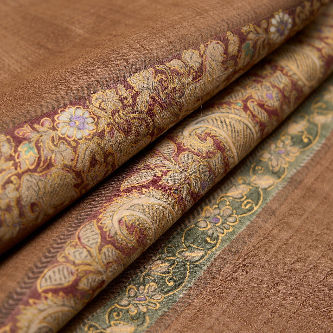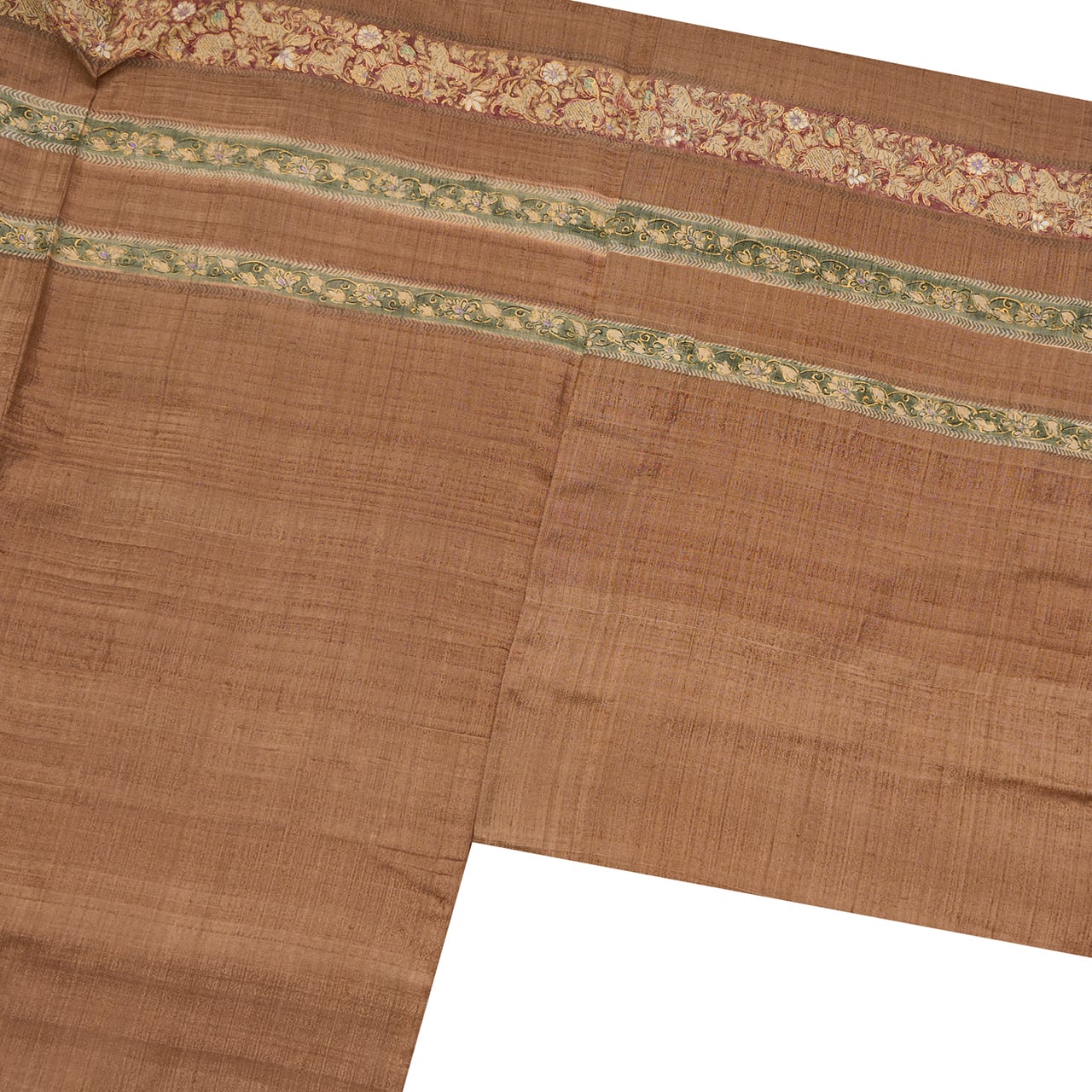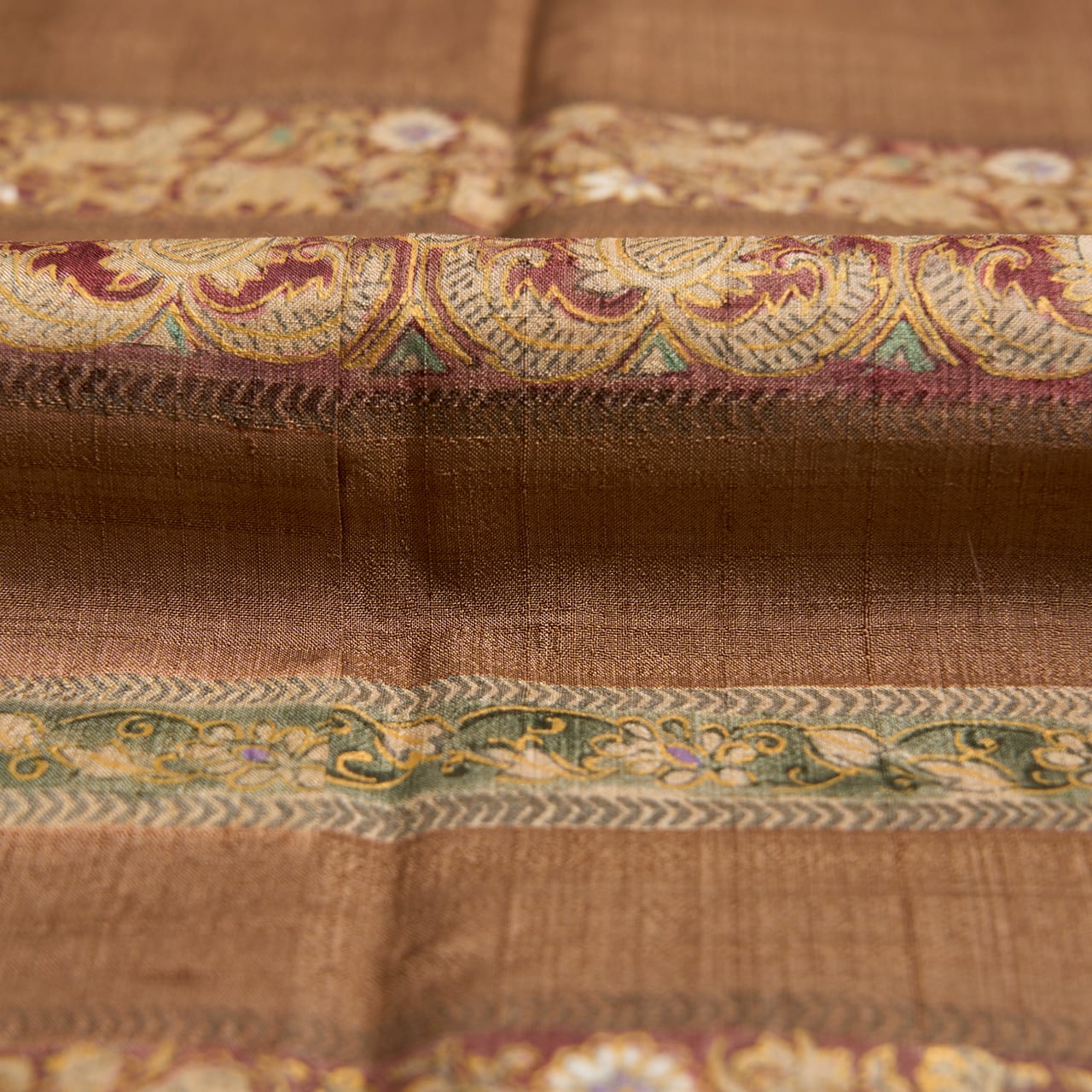 こちらは地の色が少し赤味のある薄茶・柿茶色に染められていて、上前から下前にぐるっとつながる裾周りと、肩から袖につながるようにいろいろな幅のボーダーが取られ、そのボーダーの中にはペイズリーのような木の葉のような模様、花唐草の模様、そして象やトラなどの動物が連続している模様が更紗調の手描きで描かれて、縁取りには金彩が施された、いわゆる金更紗模様の附下のお着物です。