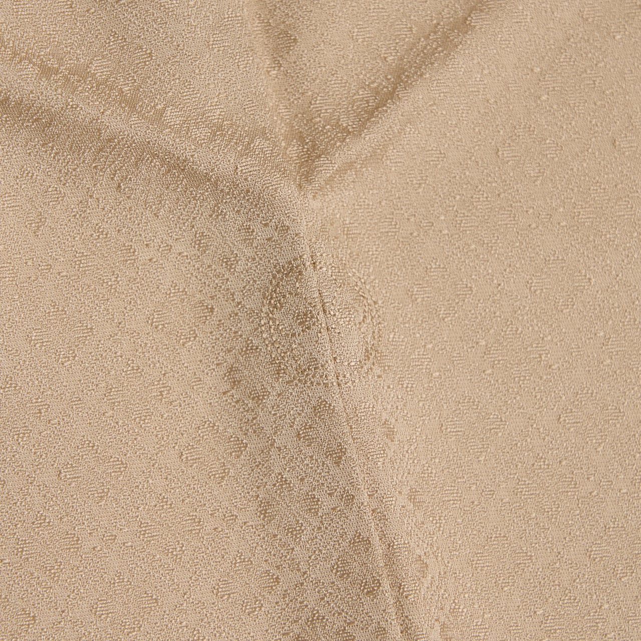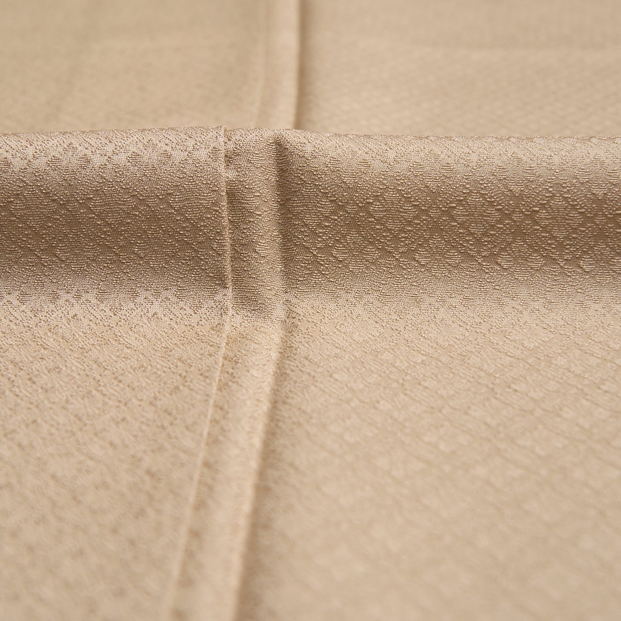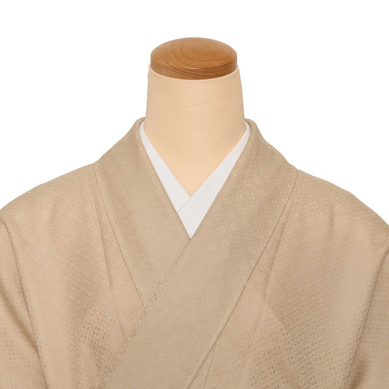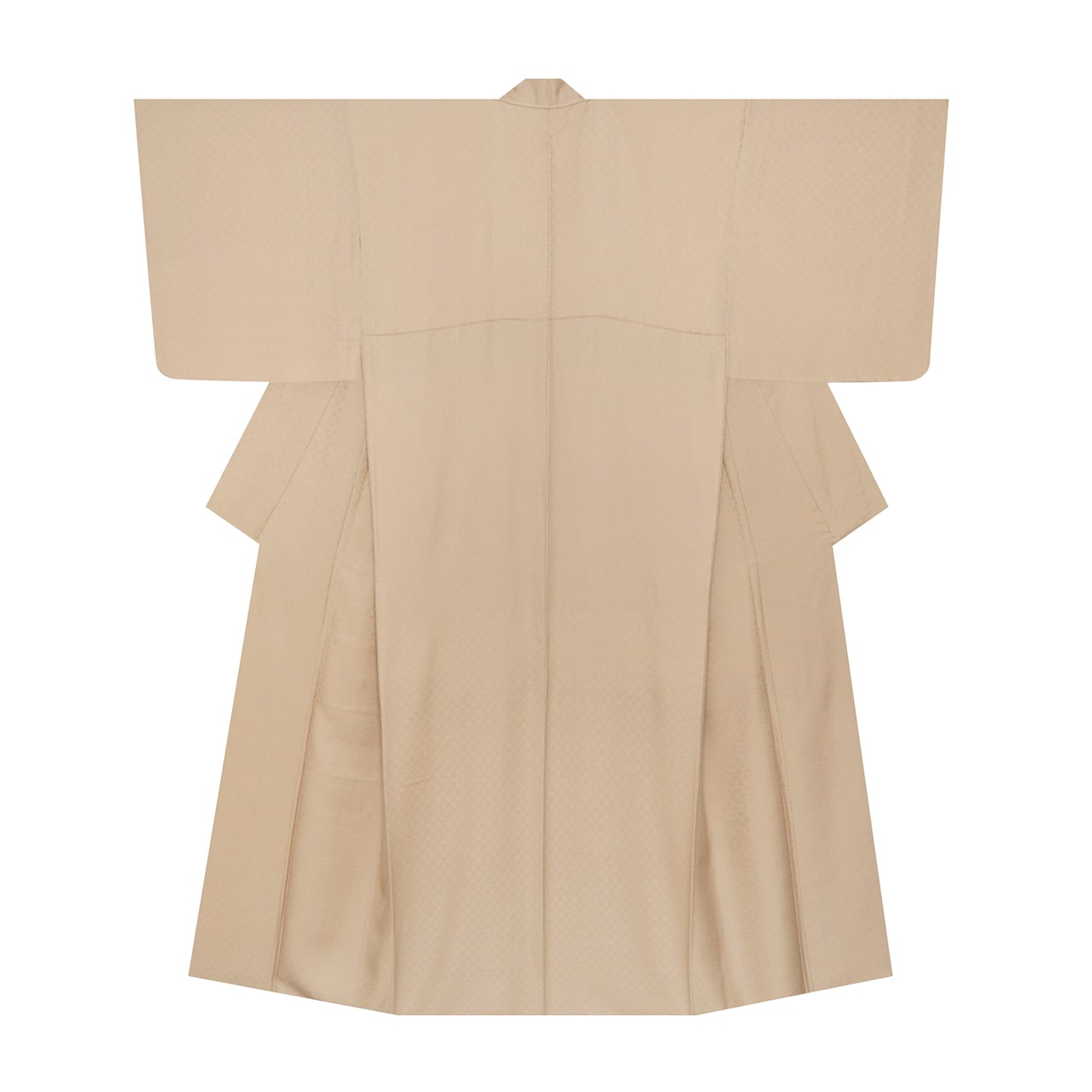 模様の一辺が1cmちょっとくらいの大きさの小葵文様が連続して織り込まれた紋意匠の生地が、淡く明るめのベージュ・亜麻色に染められた、有職文様ならではのとても気品の感じられる素敵な地紋無地のお着物です。