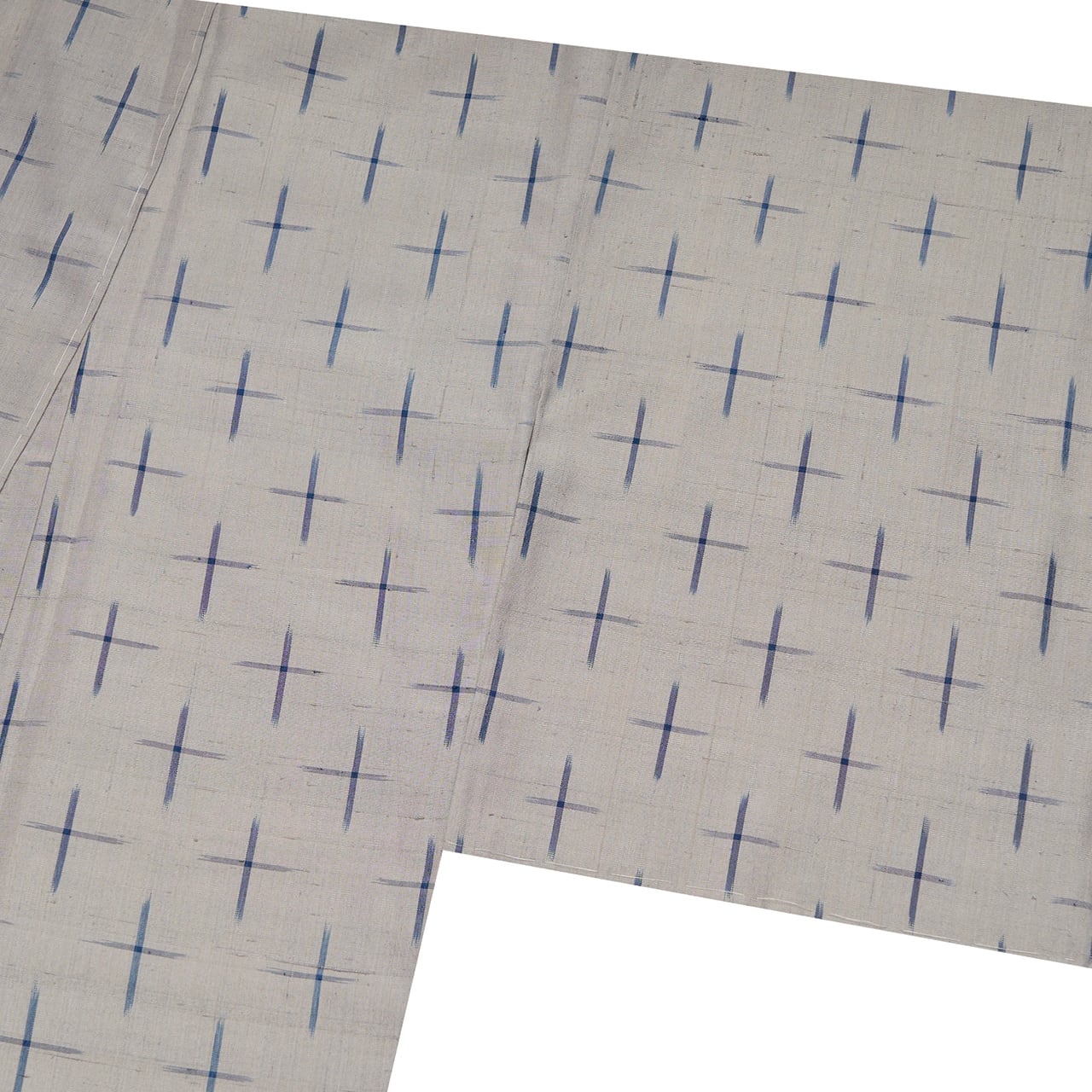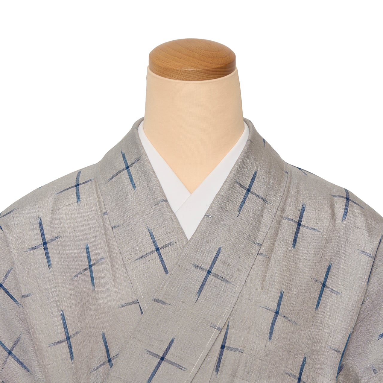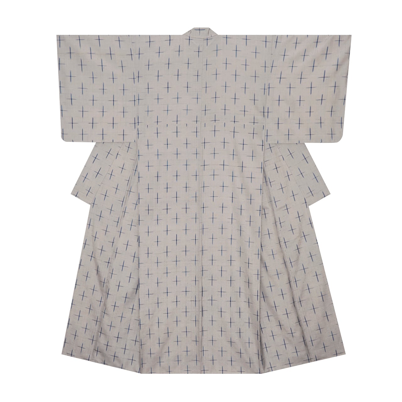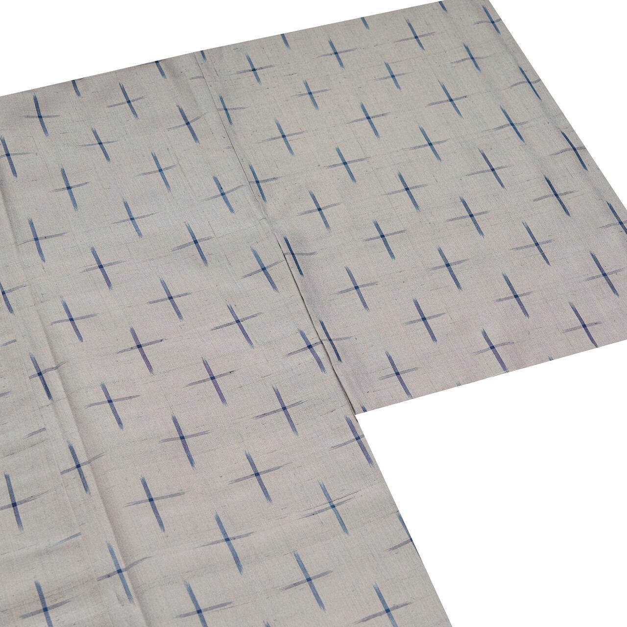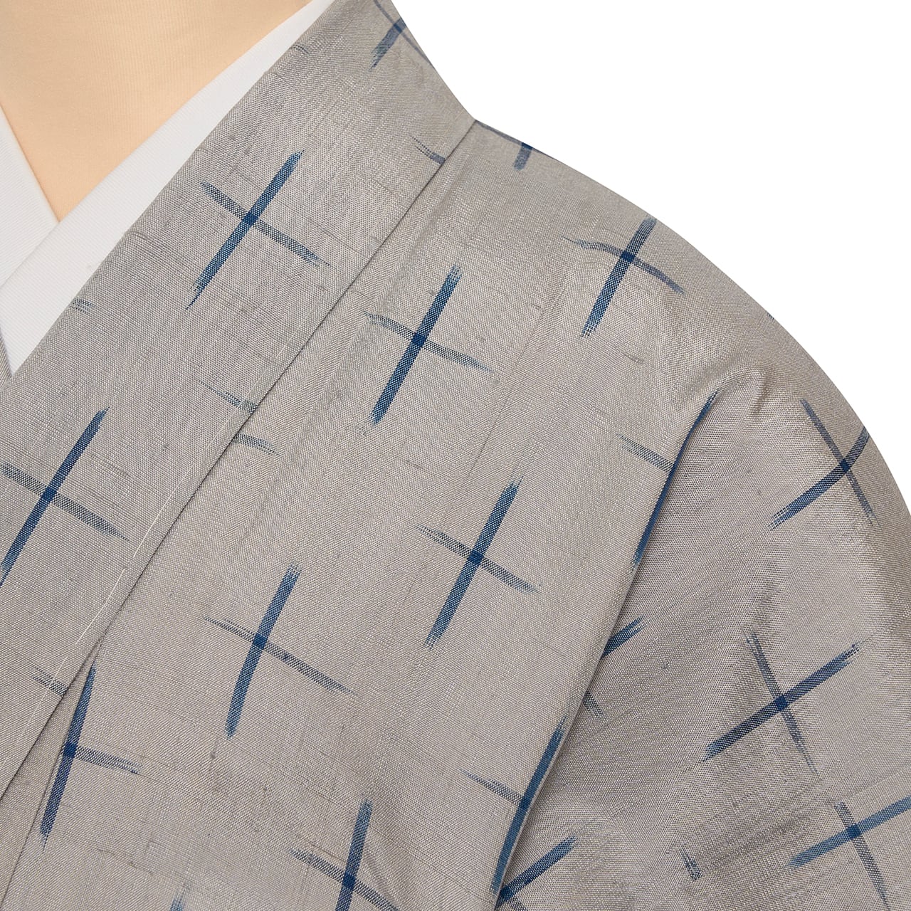 緯糸の節が味わい深く感じられる、座繰りのふっくらとしたシルバーのような少しだけ藍味のある爽やかなグレー・灰青色の地に、中くらいの大きさの藍で染められた十字絣が全体に織り出された、とてもスマートな印象の紬のお着物です。