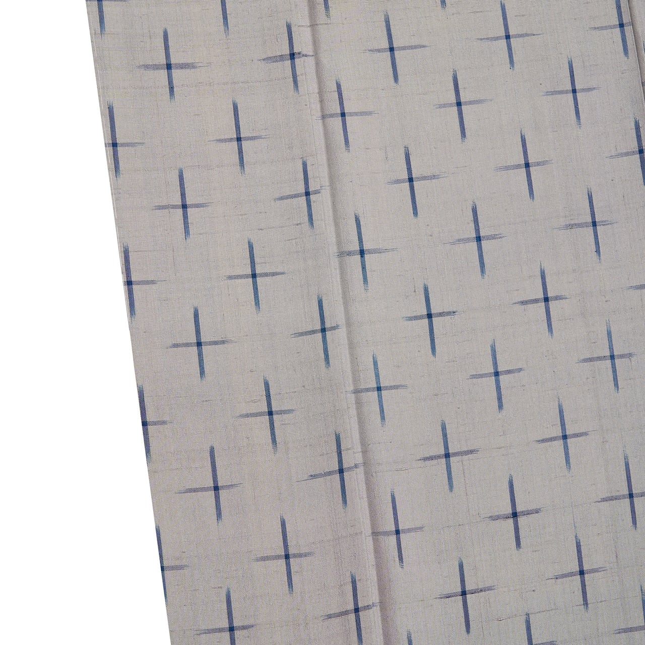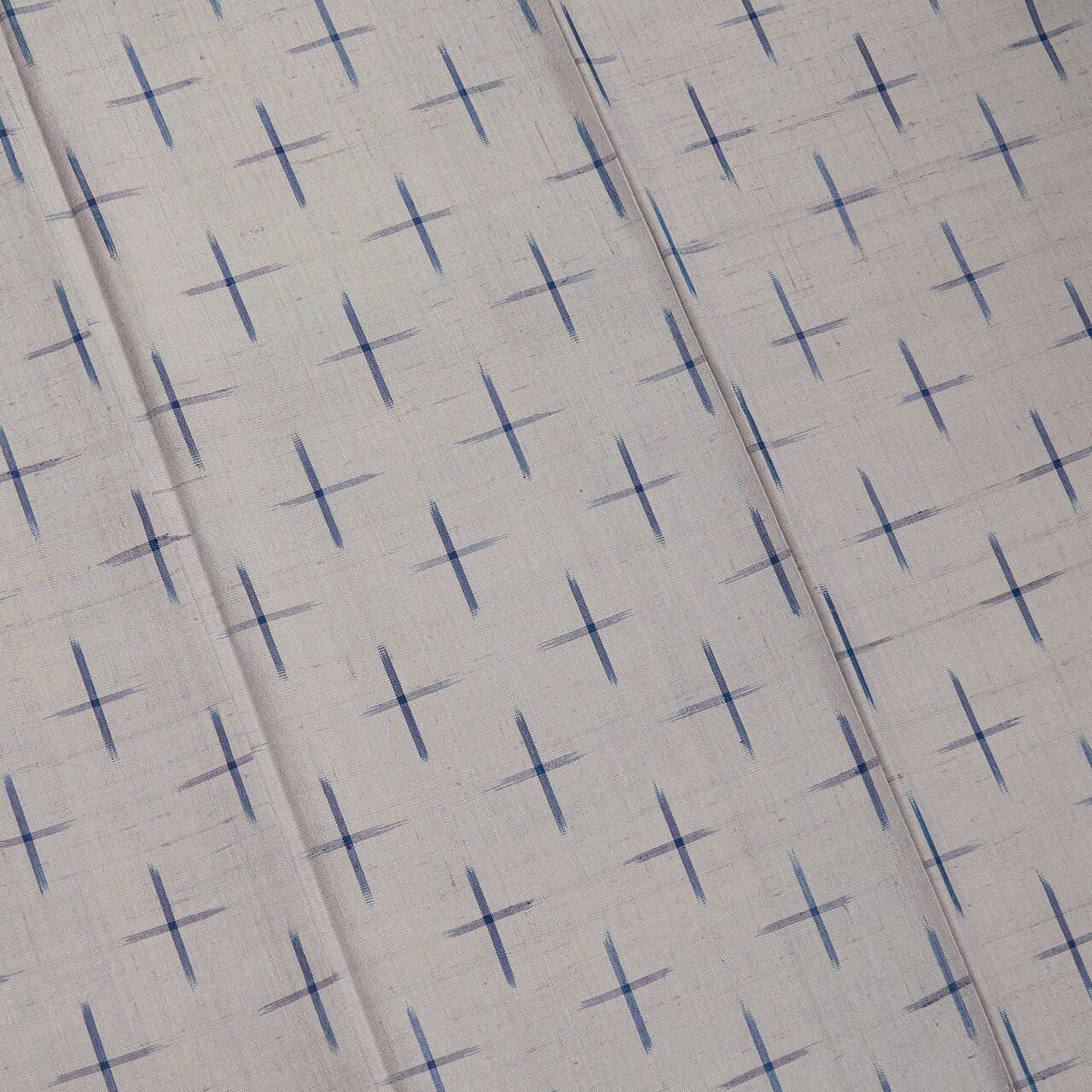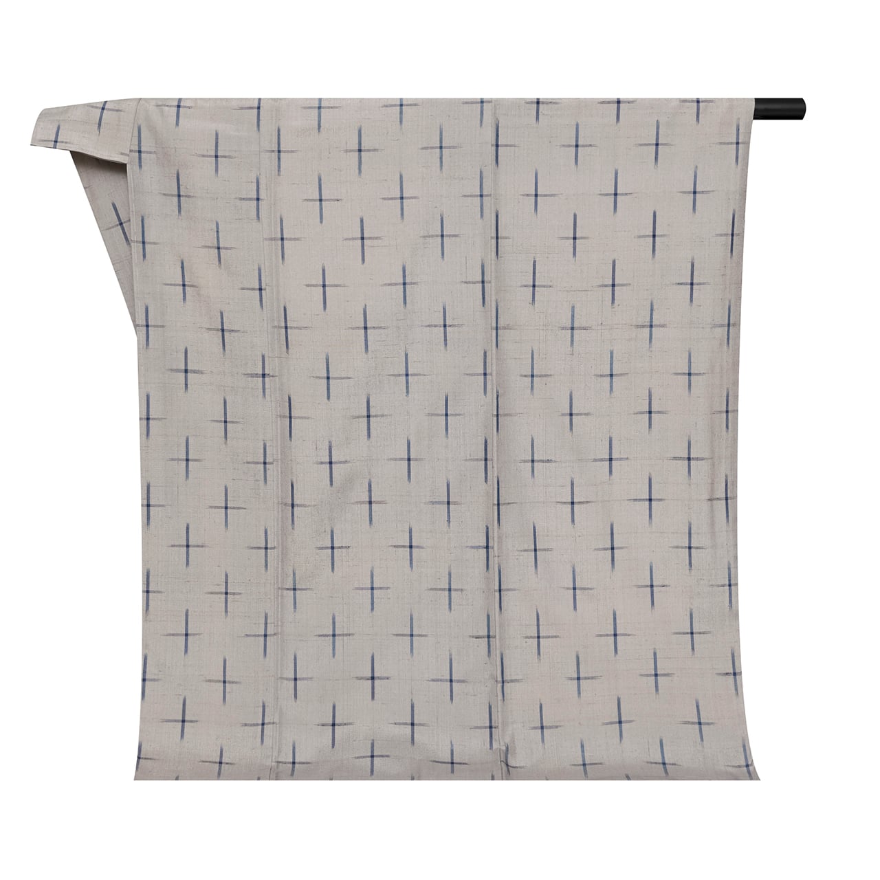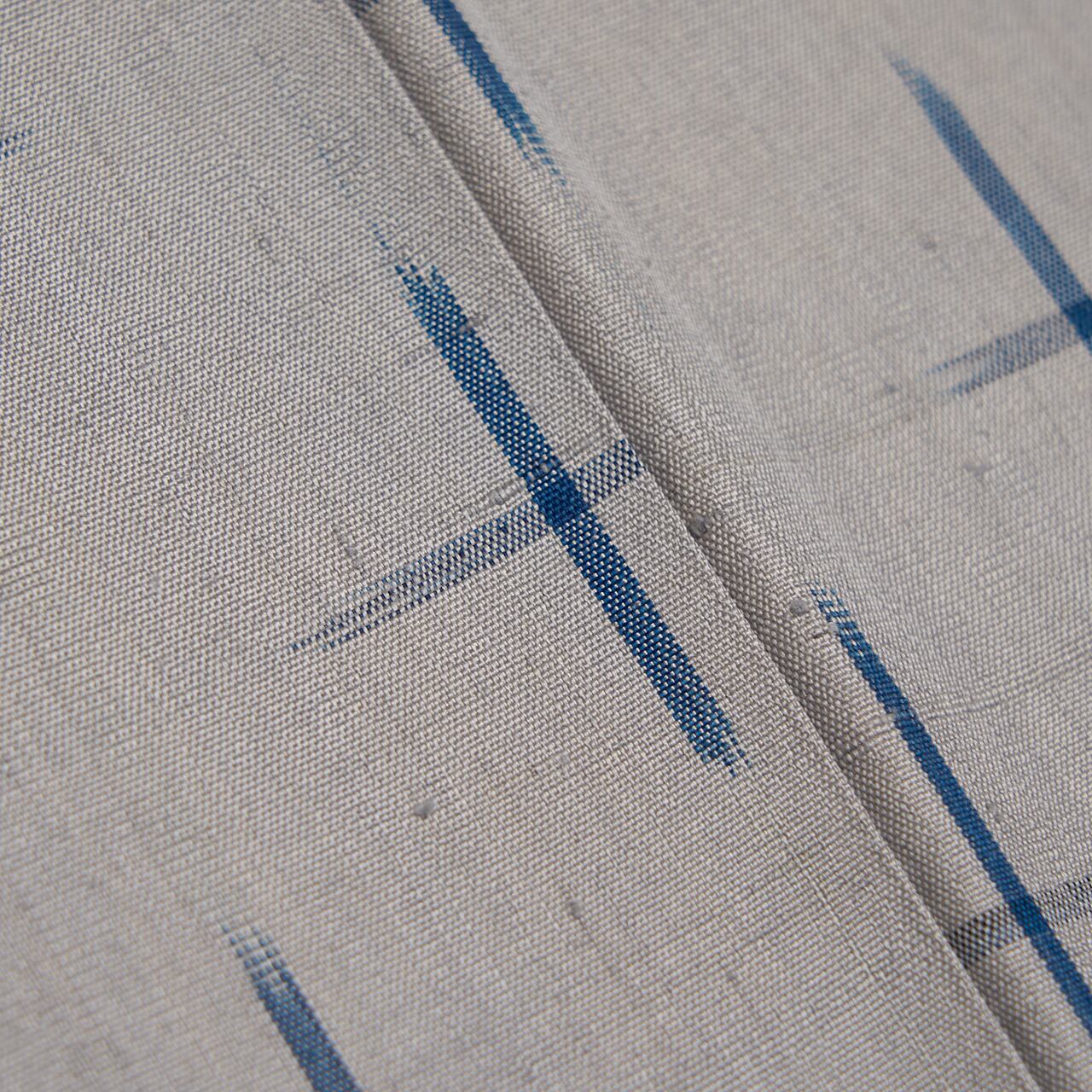緯糸の節が味わい深く感じられる、座繰りのふっくらとしたシルバーのような少しだけ藍味のある爽やかなグレー・灰青色の地に、中くらいの大きさの藍で染められた十字絣が全体に織り出された、とてもスマートな印象の紬のお着物です。