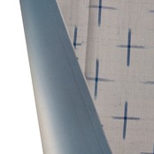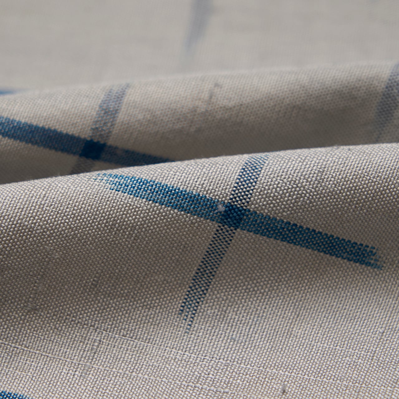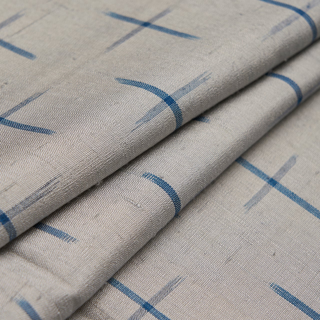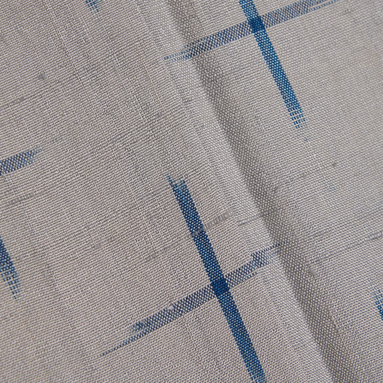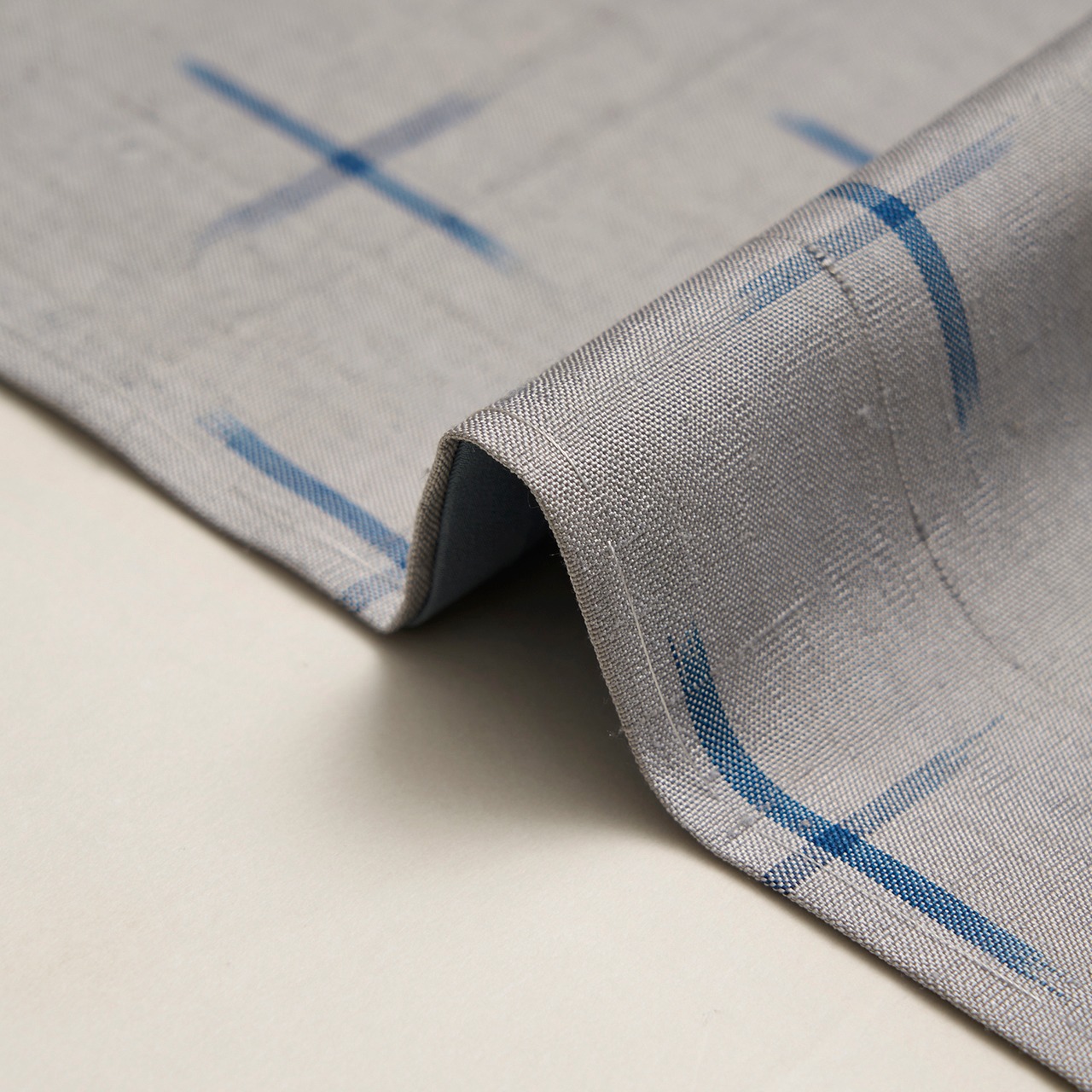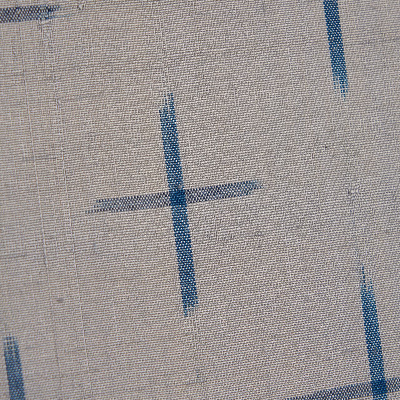緯糸の節が味わい深く感じられる、座繰りのふっくらとしたシルバーのような少しだけ藍味のある爽やかなグレー・灰青色の地に、中くらいの大きさの藍で染められた十字絣が全体に織り出された、とてもスマートな印象の紬のお着物です。