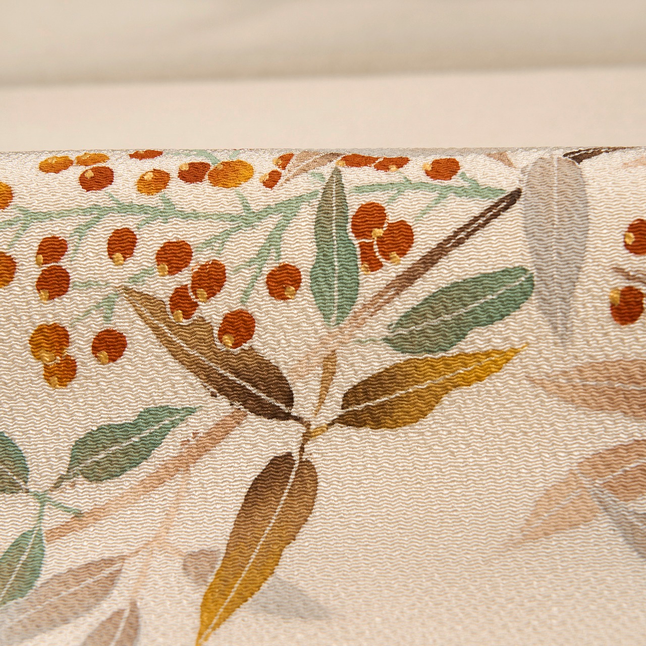少しシボのあるちりめんの生地が白汚しのような淡いベージュ・灰白色に染められ、お太鼓には手描きの友禅で、紅白の実をつけた南天の木がしなやかな枝ぶりで写実的に描かれた、素敵な九寸名古屋帯です。