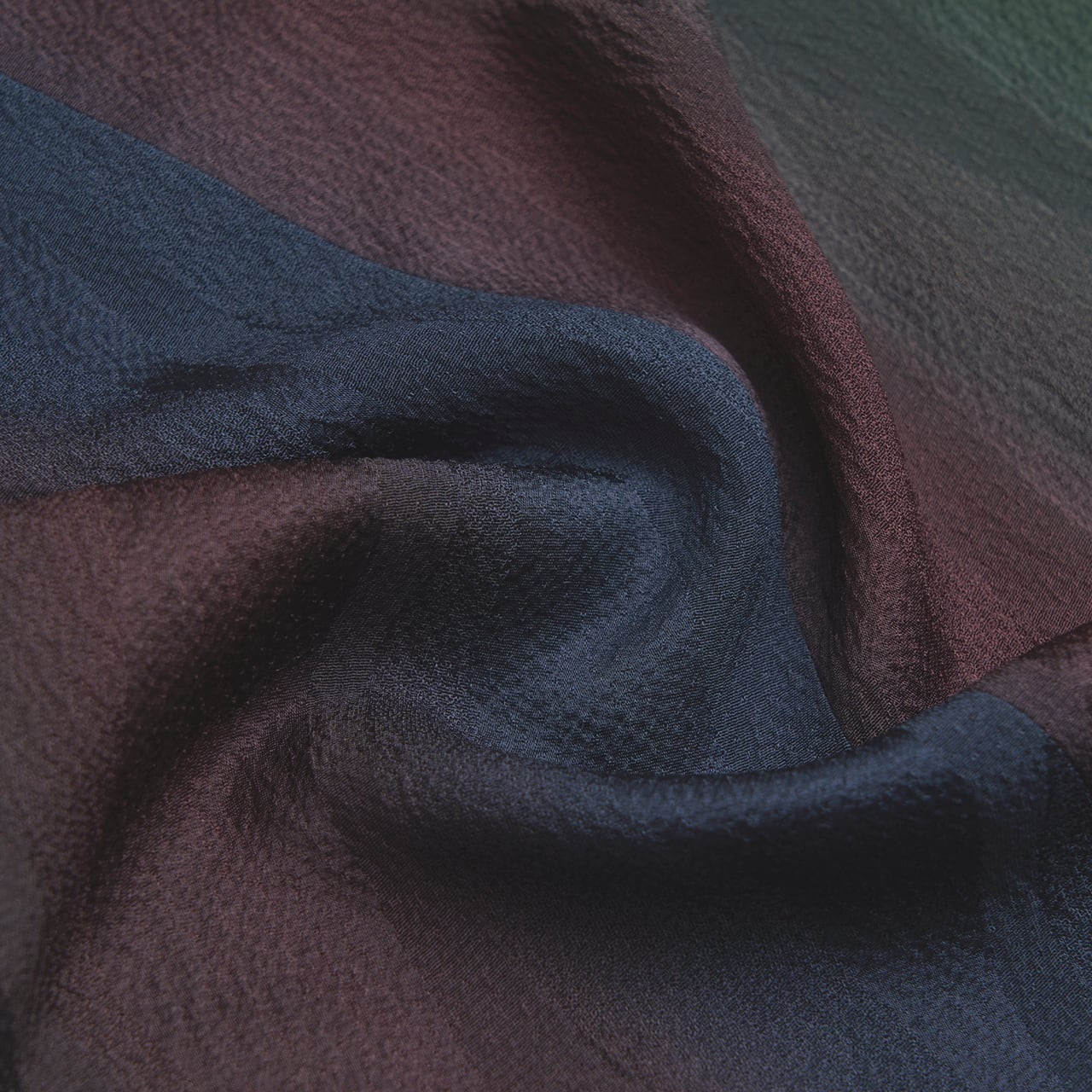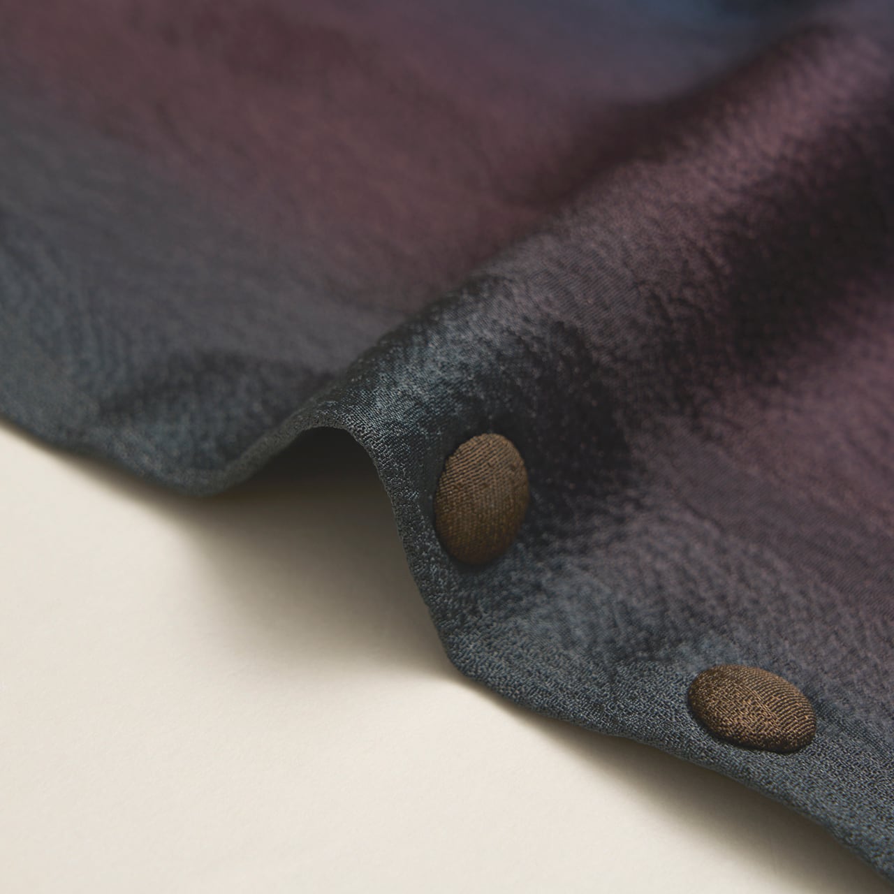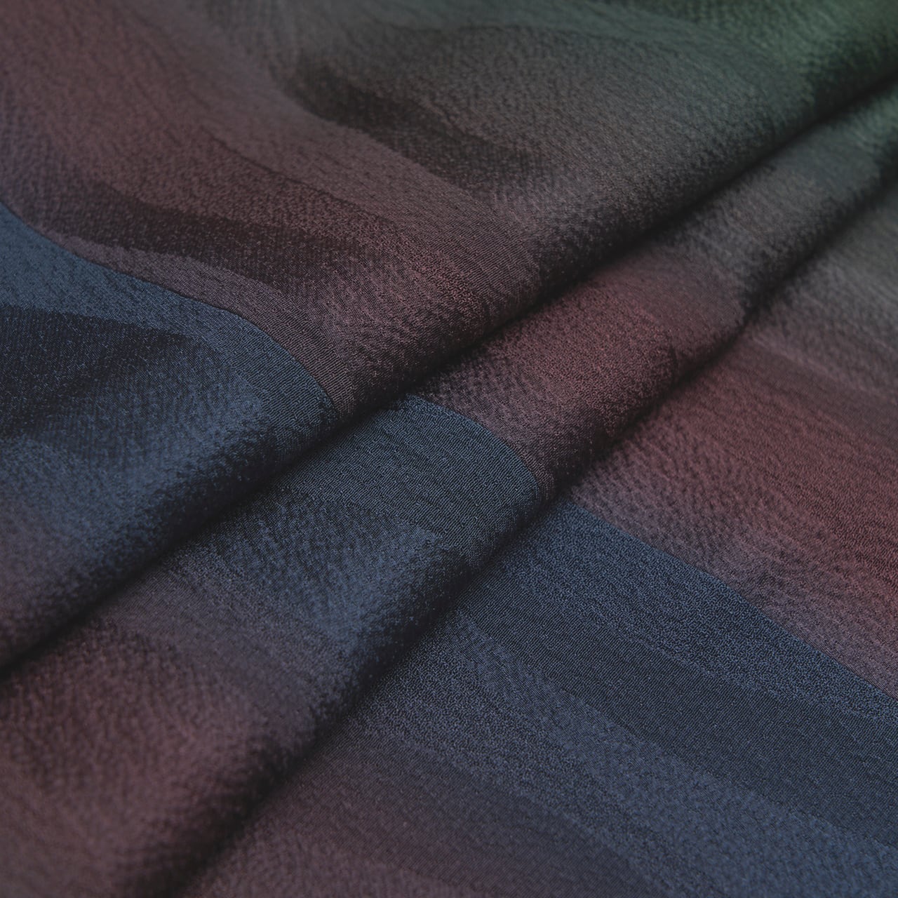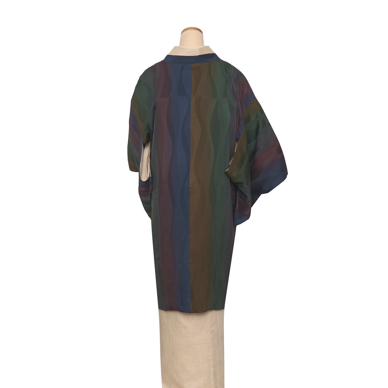 立涌の模様が織り出され、織りによって少し光沢のある部分があるような、シボのあるような軽やかな質感の生地が、天鵞絨色のくすんだ緑と暗紅色の赤紫、青褐色の藍の3色に暈しで染め分けられた、お洒落な雰囲気の千代田衿の長コートです。