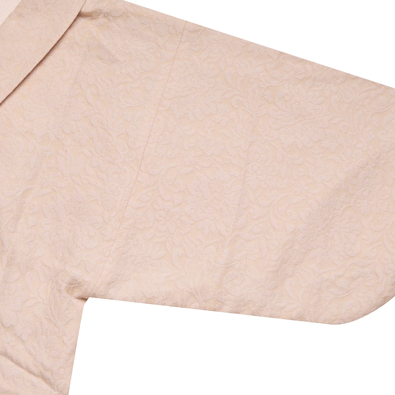 淡く優しいピンク・灰桜色のシルク40%・ウール60%の素材が、大胆な花唐草模様にふくれ織のようなジャガード織のように織り出された生地になっていて、その生地でつくられた防寒用にもお使いいただけるようなお洒落な長めのコートです。