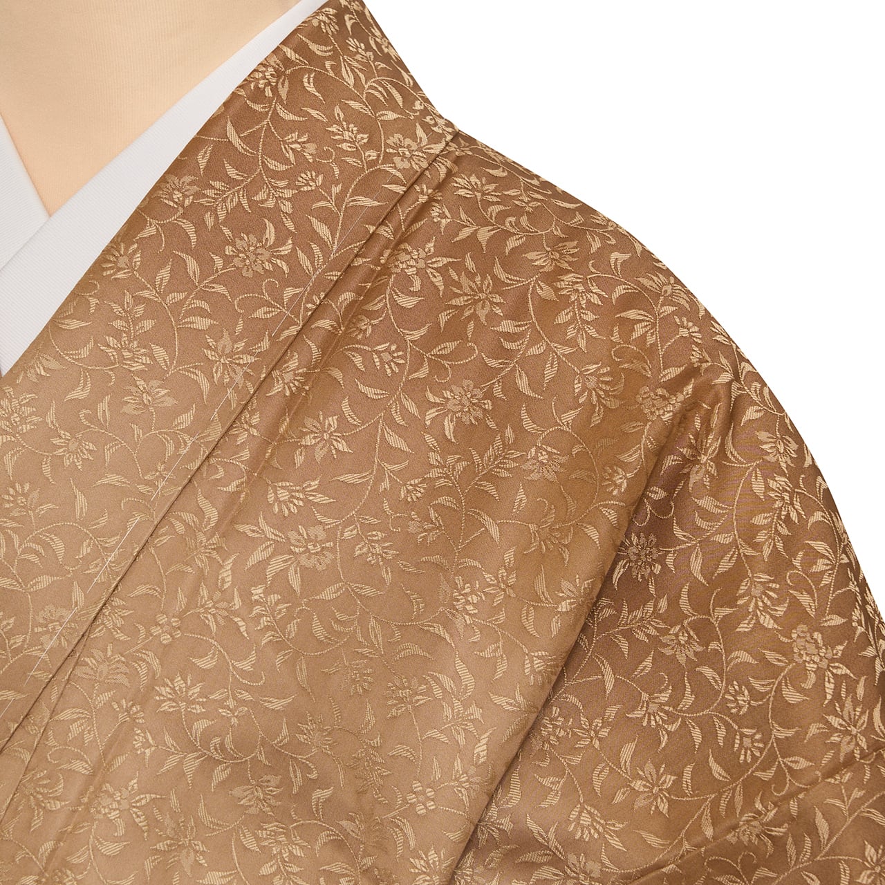 小ぶりの花唐草の地模様が黄金繭の糸でびっしりと織り出された薄卵色の生地の胸とひざの辺りに、白茶色の淡く明るいベージュ・白茶色の段が取られ、その上と一番裾はそれよりさらに濃く明るい茶・赭色に変わっていくといった、段暈し染めの絵羽となった訪問着附けの素敵なお着物です。
