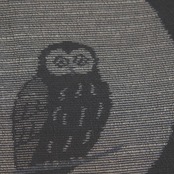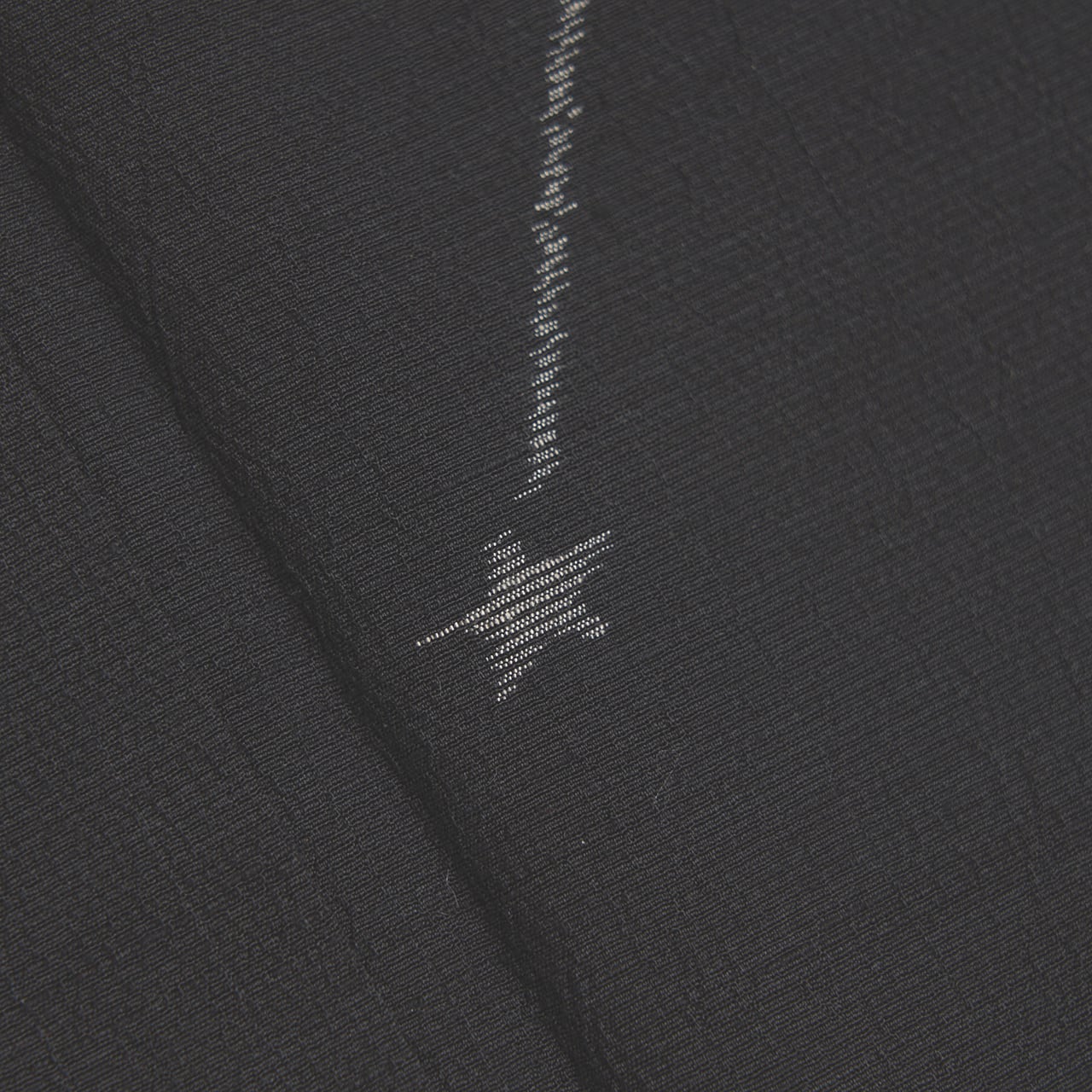 こちらは、真っ黒のちぢみの生地の肩口に夜のとばりが降りてきたような線が引かれ、それにたくさんの星が散りばめられ、上前には丸い月があって、その前にフクロウの姿が描かれ、下の方には2羽のうさぎが寄り添っている、情緒あふれる素敵な模様が織り出された素晴らしい作品です。
