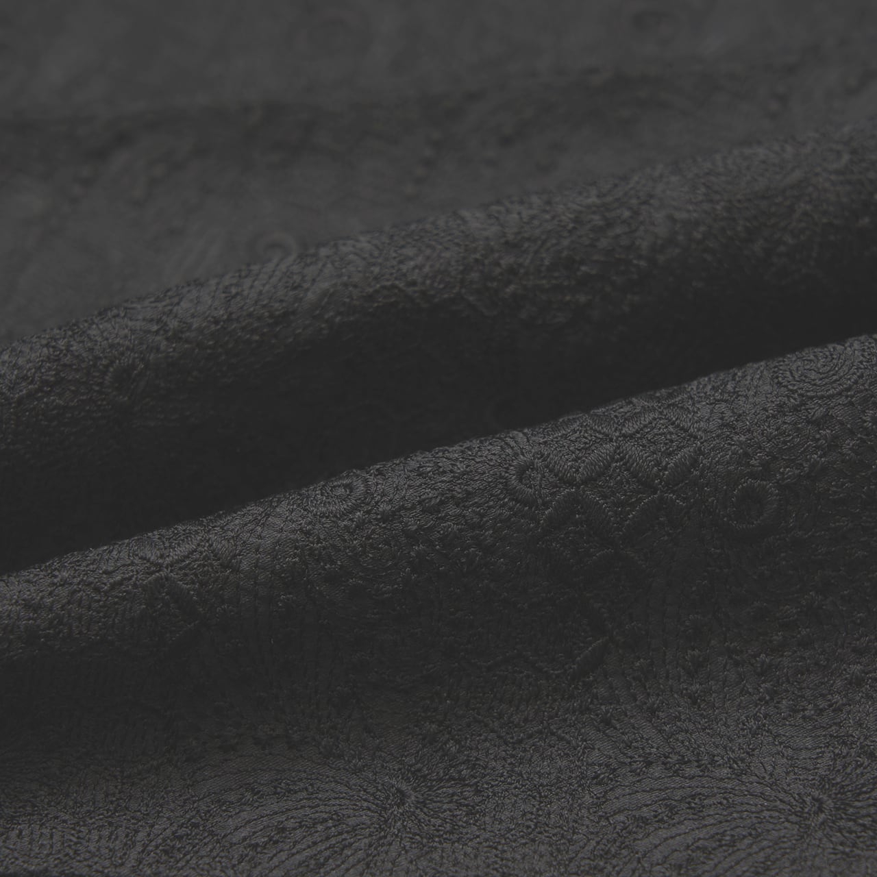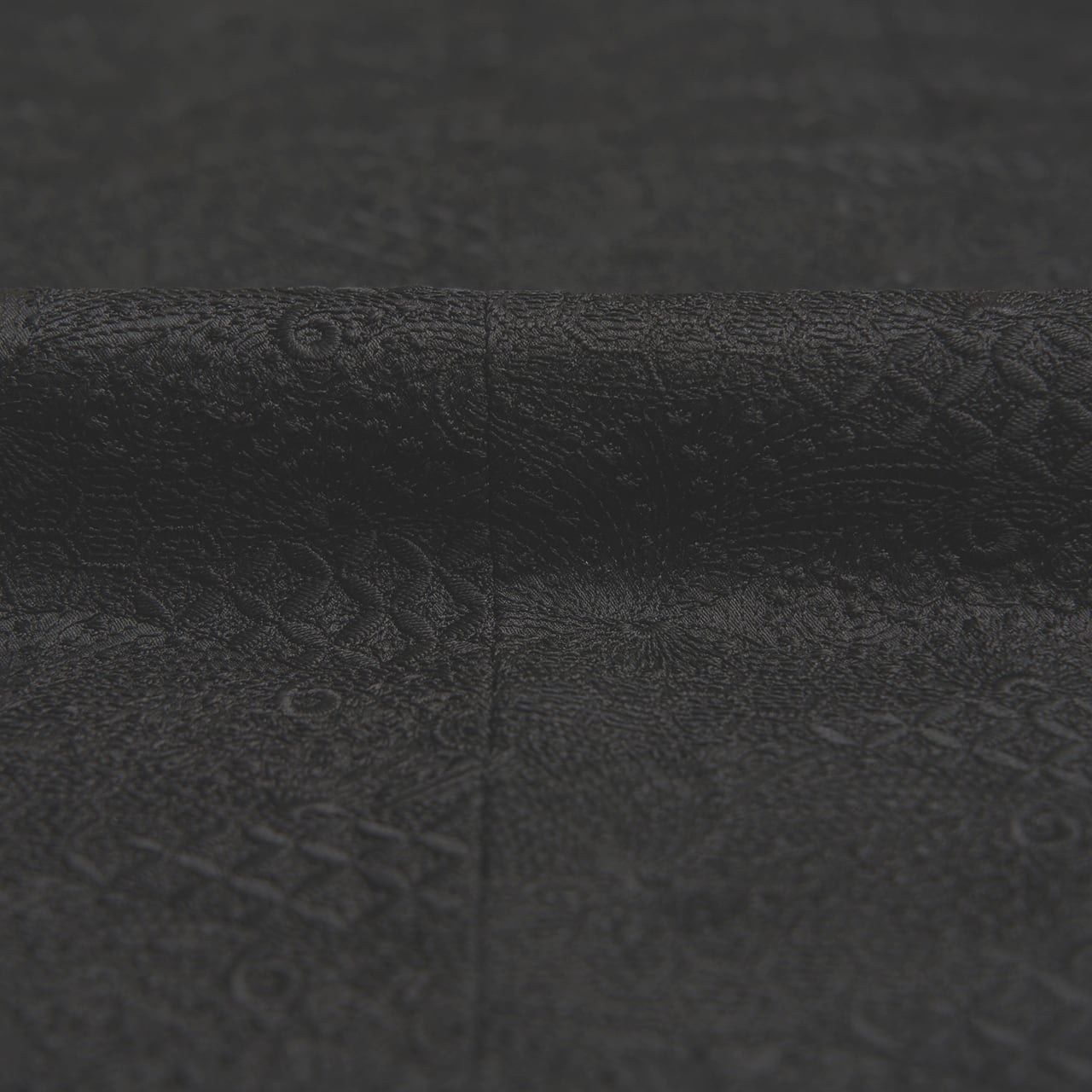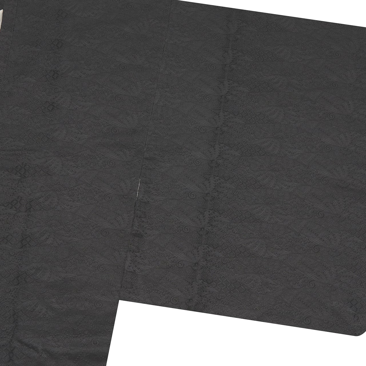 寿光織ならではのしっかりとした凹凸感のある黒の生地ですが、少し光沢のある質感となっていて、細かい七宝繋ぎと蝶々のような模様とが裂取りのように組み合わさって、複雑な変化のある表情となった高級感のある道行コートです。