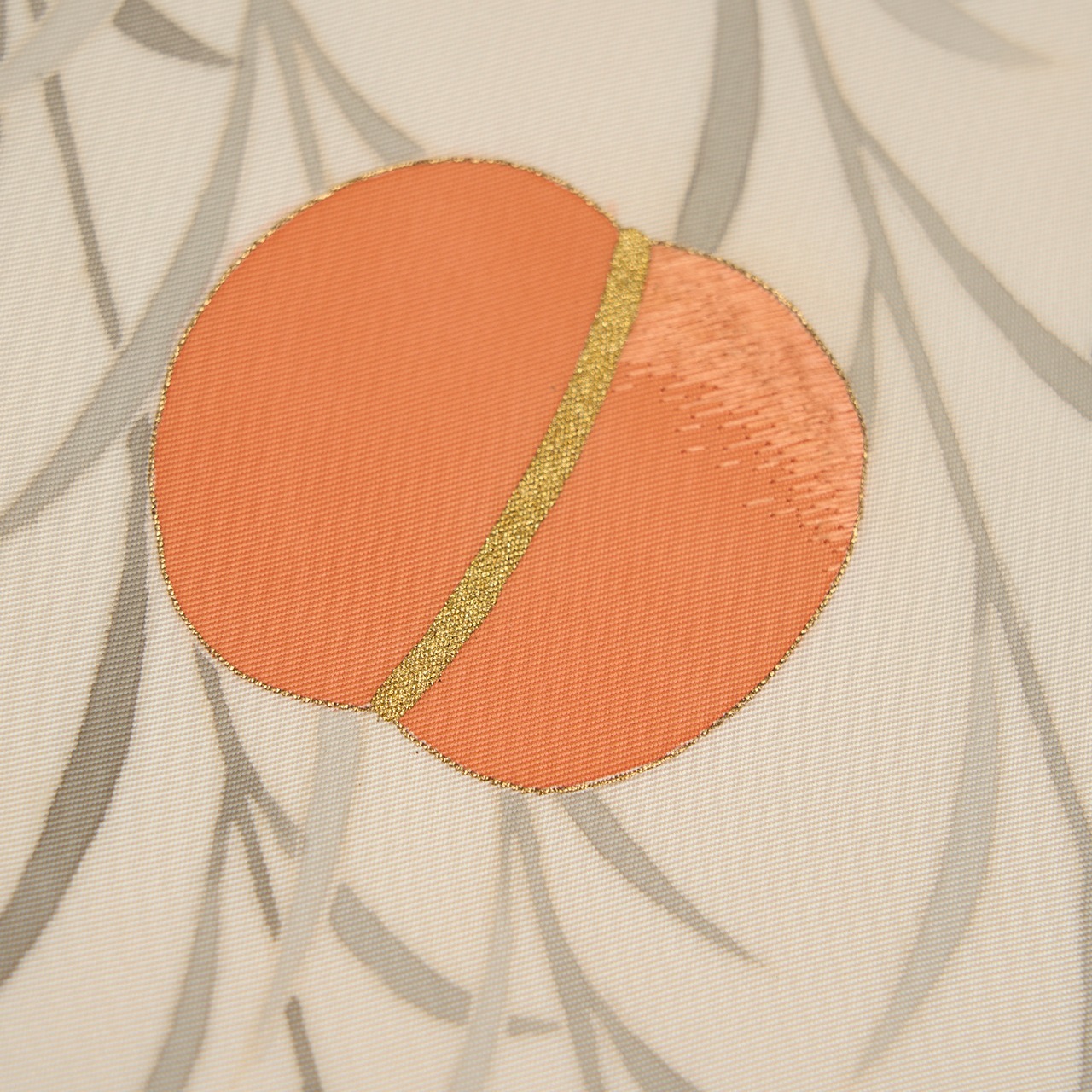 しっかりとした質感の象牙色の塩瀬の生地のお太鼓に、枝垂れる柳の枝が墨書きのようなタッチで銀鼠色の濃淡で描かれ、それを背景にして蹴鞠の毬が鴇色や伽羅色、珊瑚朱色などで描かれて手刺繍も加えられた、格調高さのある素敵な九寸名古屋帯です。