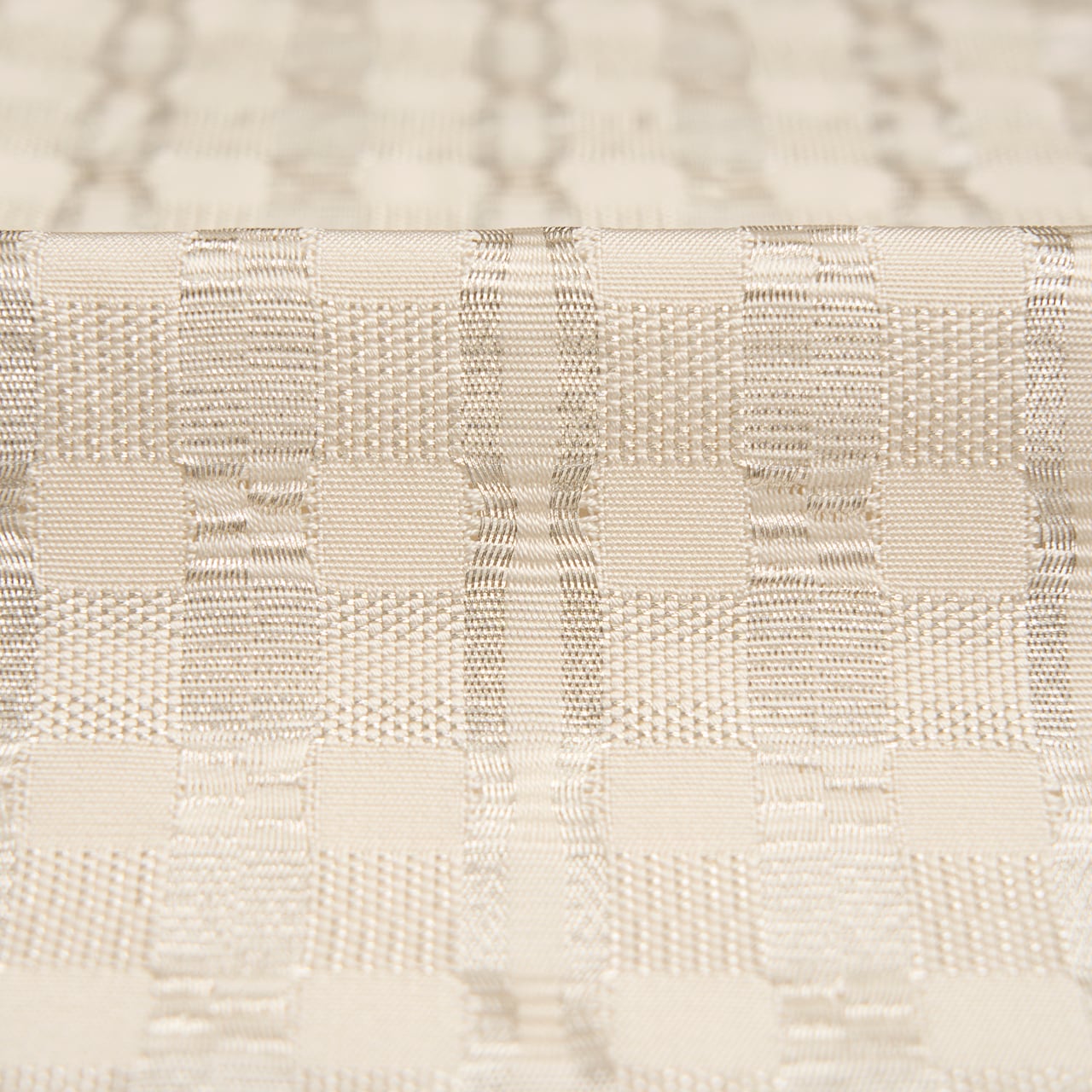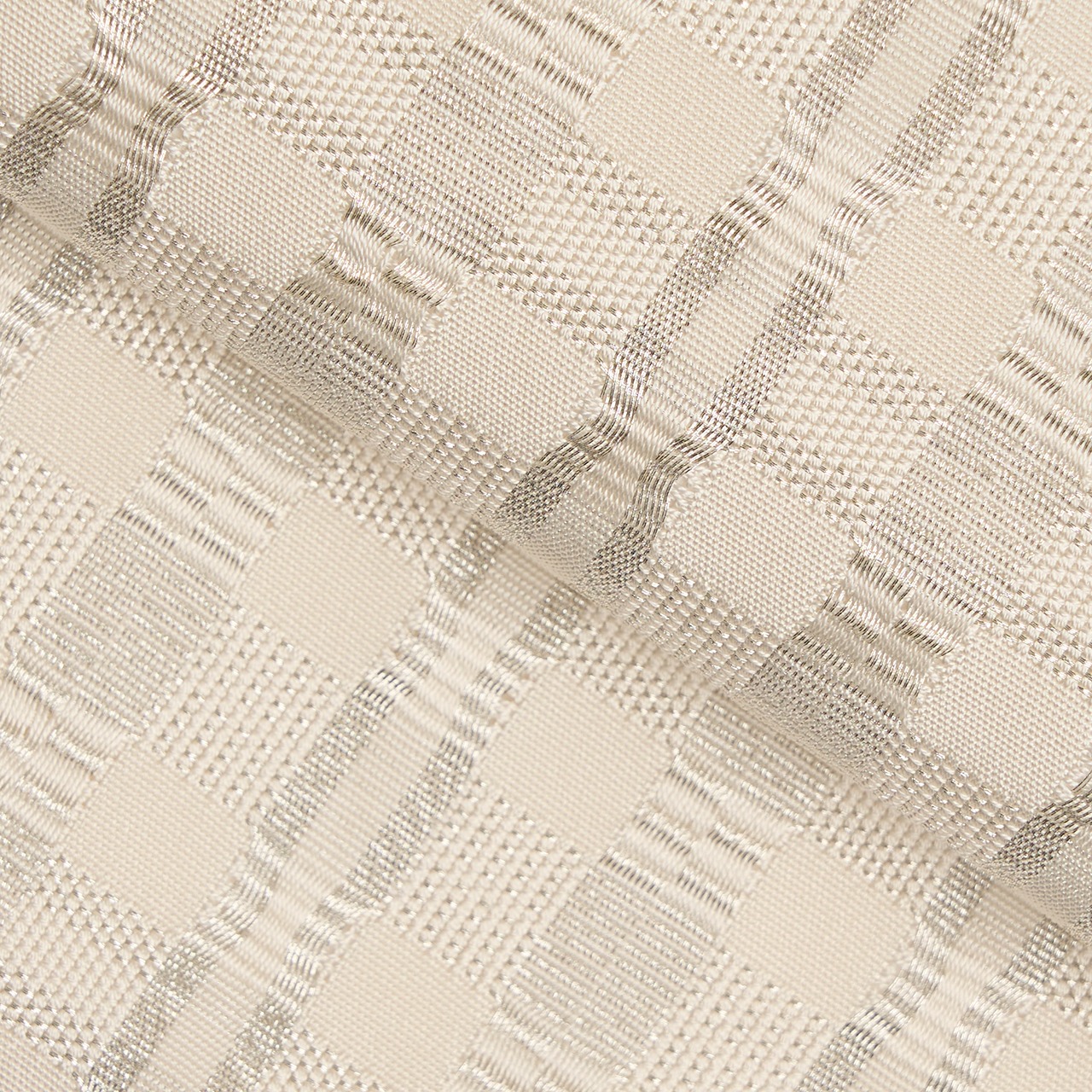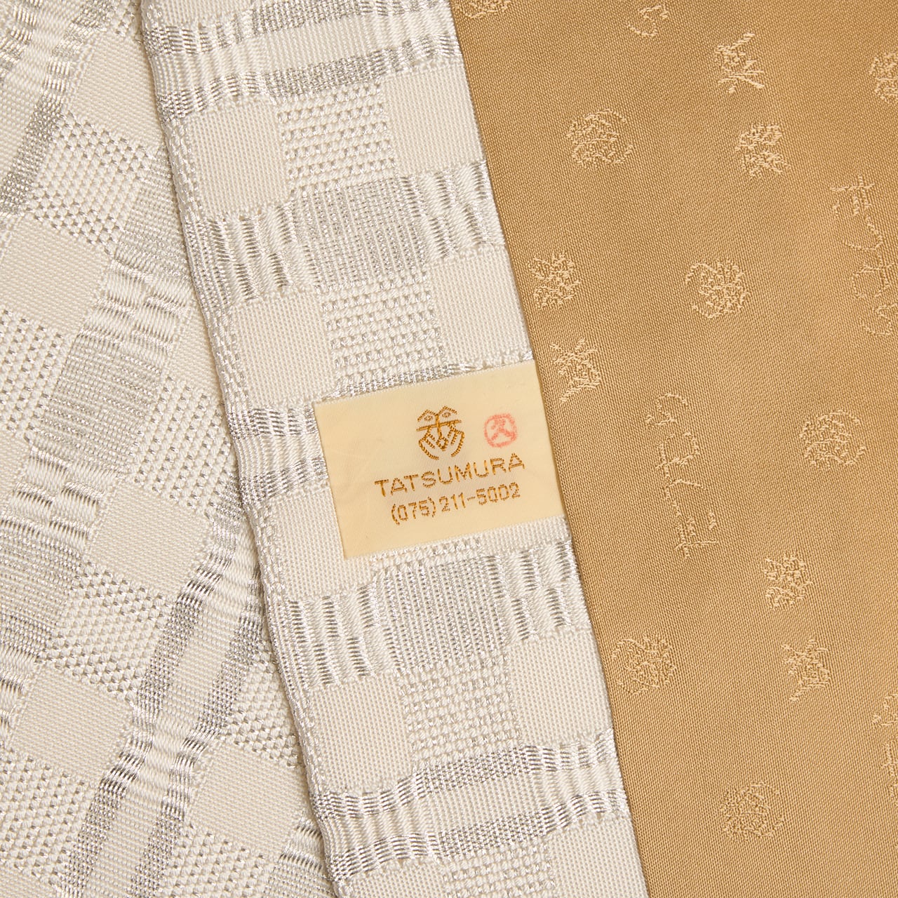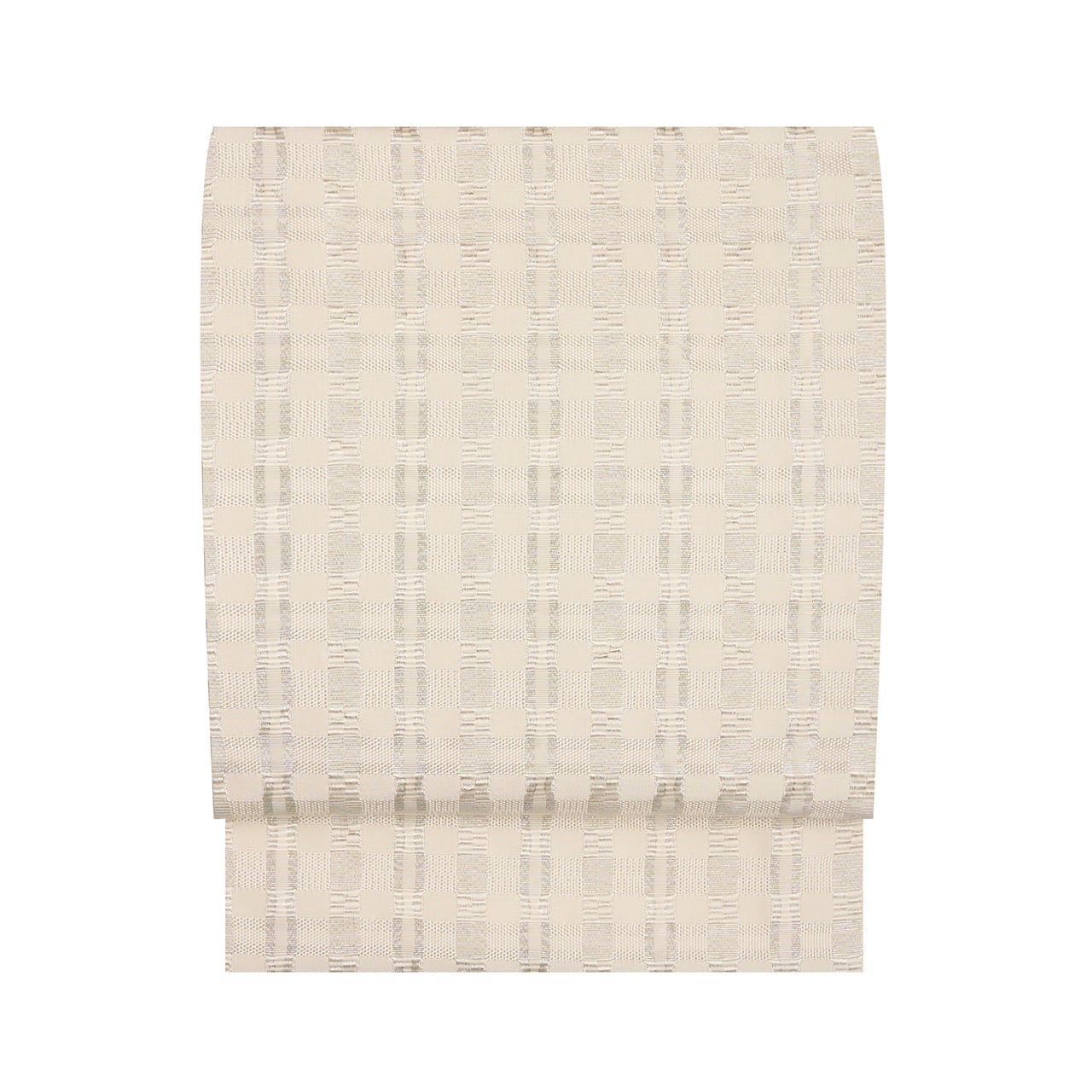 しなやかな象牙色の地に、銀糸で吉野格子の模様が織り出された、とてもすっきりとした格調の高さのある龍村美術織物さんの開名古屋帯です。