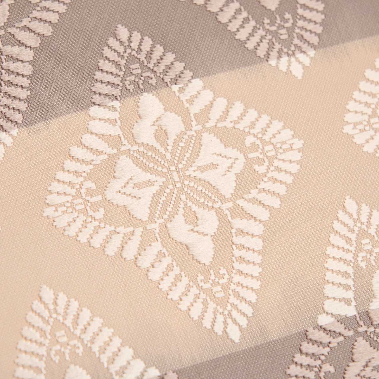 細い糸をたくさん使って織られたシャリっとした質感の練色の地に、桔梗鼠色の段が取られ、花びらに取り囲まれた菱文様が錦で織られた、品格のある有職文様のお洒落な全通の袋帯です。