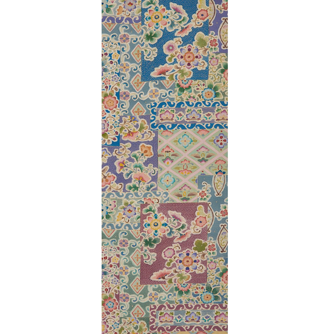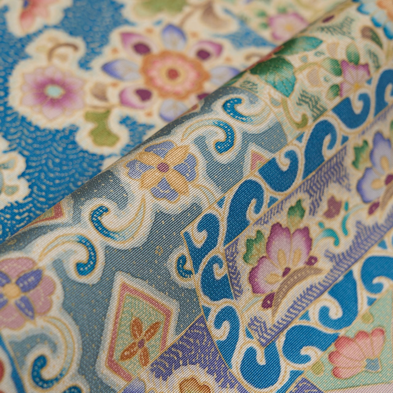 群馬200の糸を使用して富岡製糸場で織られた、上質な塩瀬の生地のタレとお太鼓の返りが緑味のあるグレー・青鈍色に染められ、お太鼓は藍鼠色にいろいろな四角が裂取りのように並べられて、熨斗目花色や鳩羽色の紫、緑青色、暗紅色などに染められ、様々なデザインの唐花模様や花菱の模様などが手描きの友禅で色とりどりに華やかに、そして細やかに描かれた、気品の感じられるような素敵な九寸名古屋帯です。