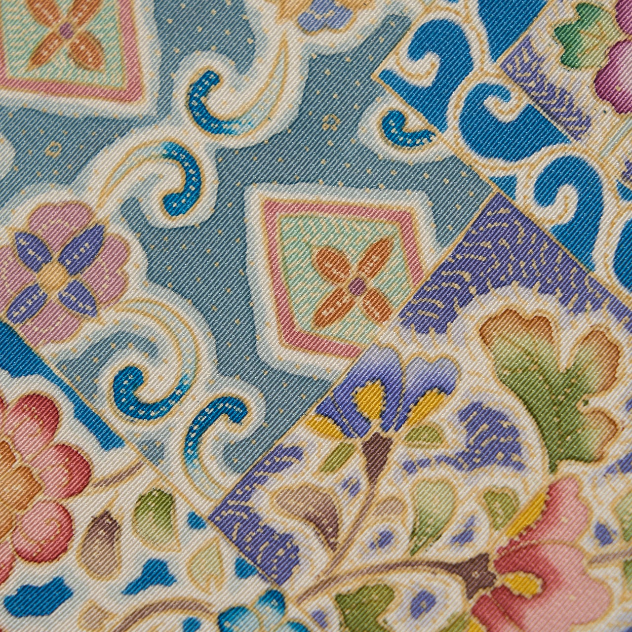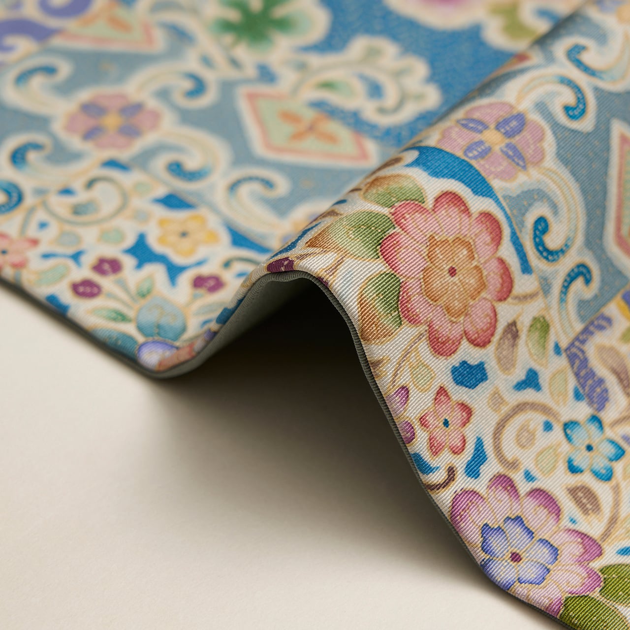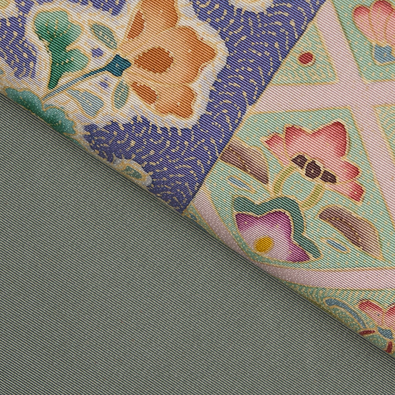 パステルトーンでまとめられた更紗の模様は、とても上品な佇まいとなっていて、手描きの友禅で染められたことで繊細さのある美しさとなっています。