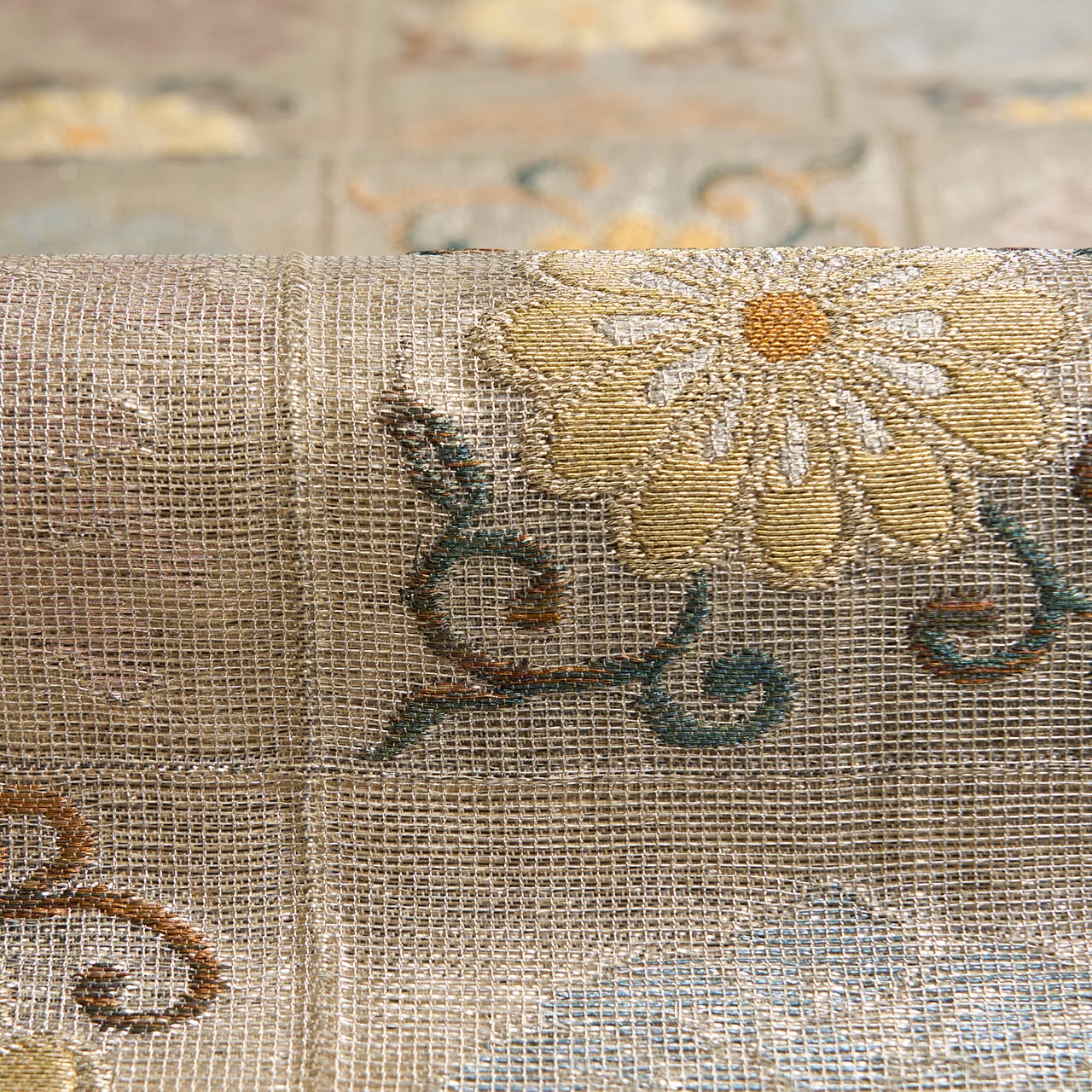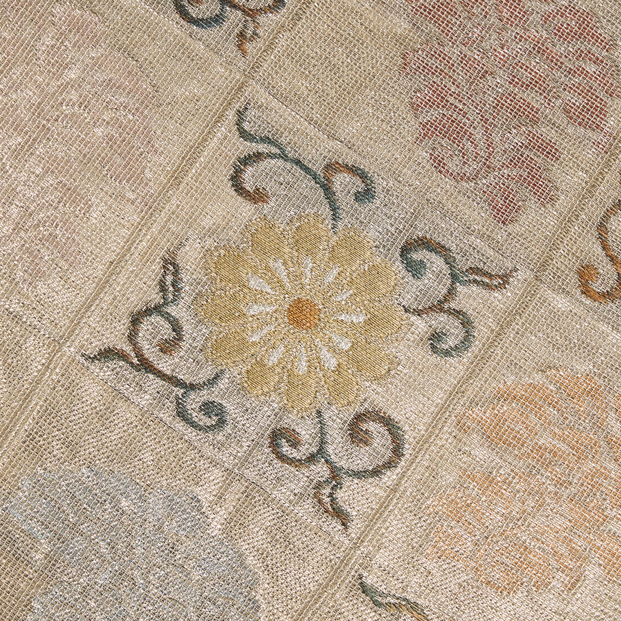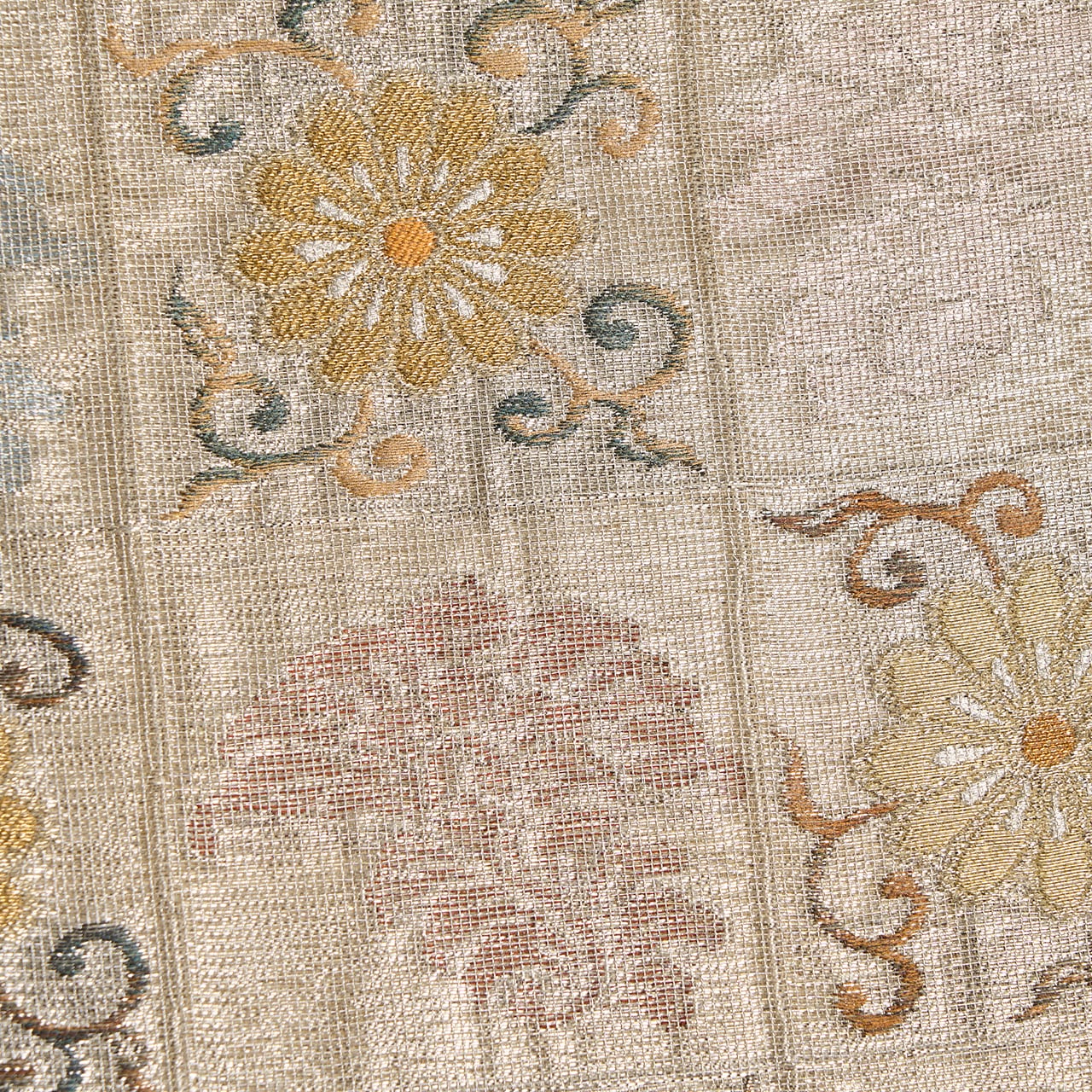 タイトルの通り、菊唐草や鶏頭などの有職華文が見事に多色で織り出されていますが、その土台となる部分の織りは、二重、三重の紋紗のような複雑な組織になっており、どうやって織られたのでしょうと、じっと見ているだけでもため息の出るような複雑さと同時に美しさが共存しています。
