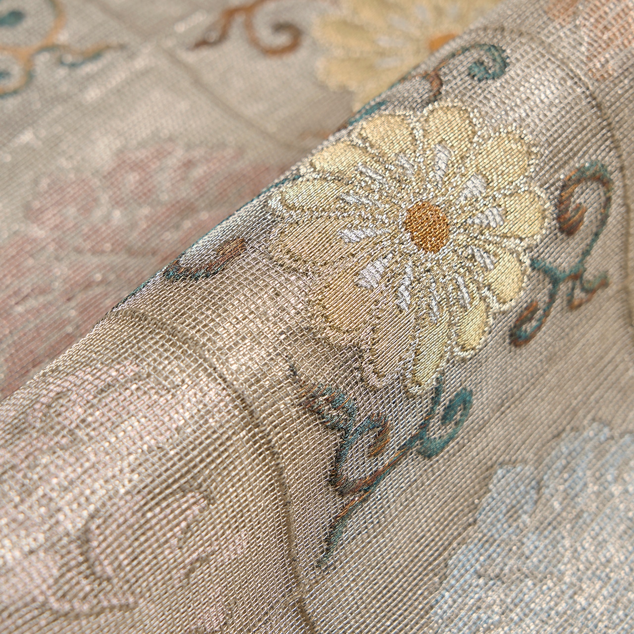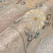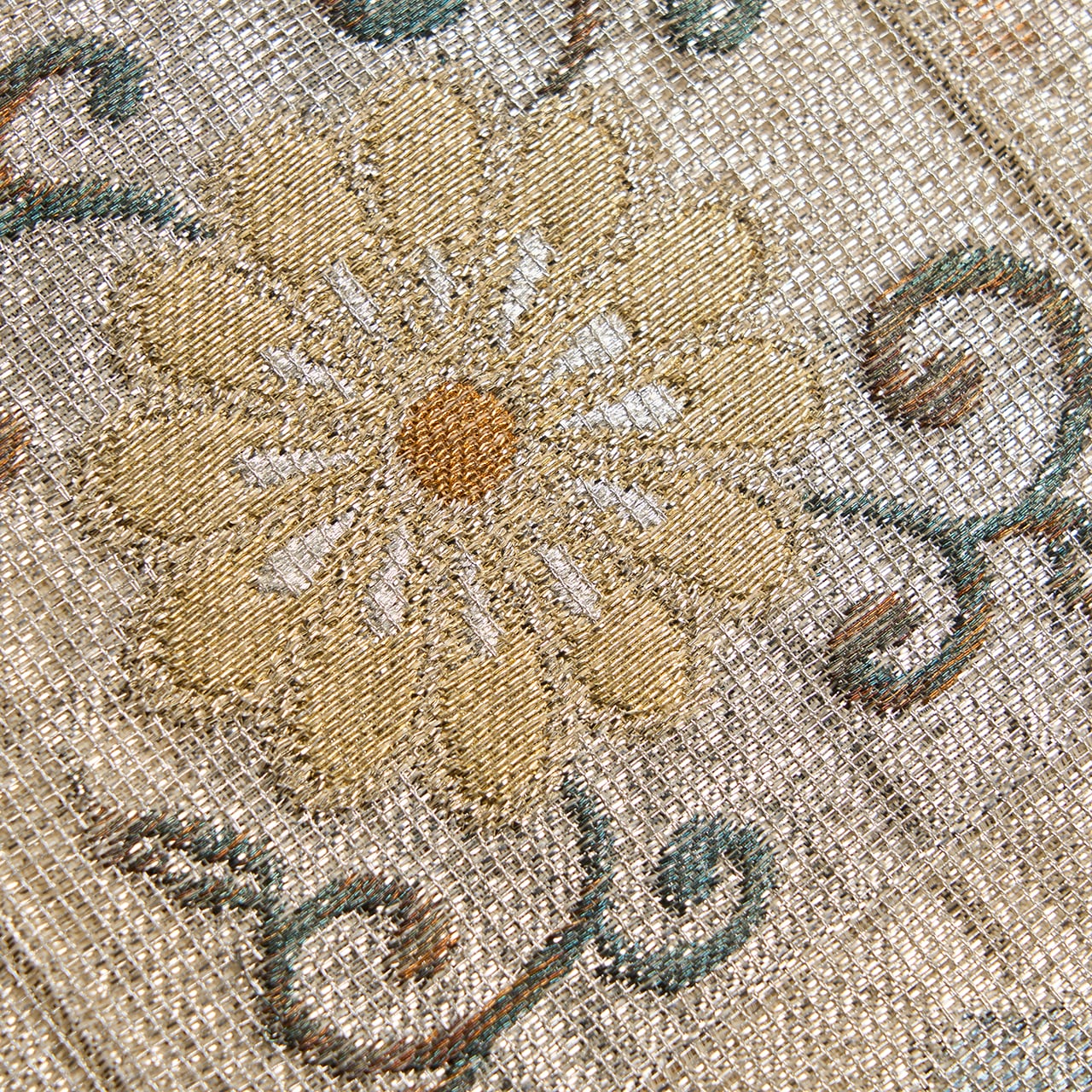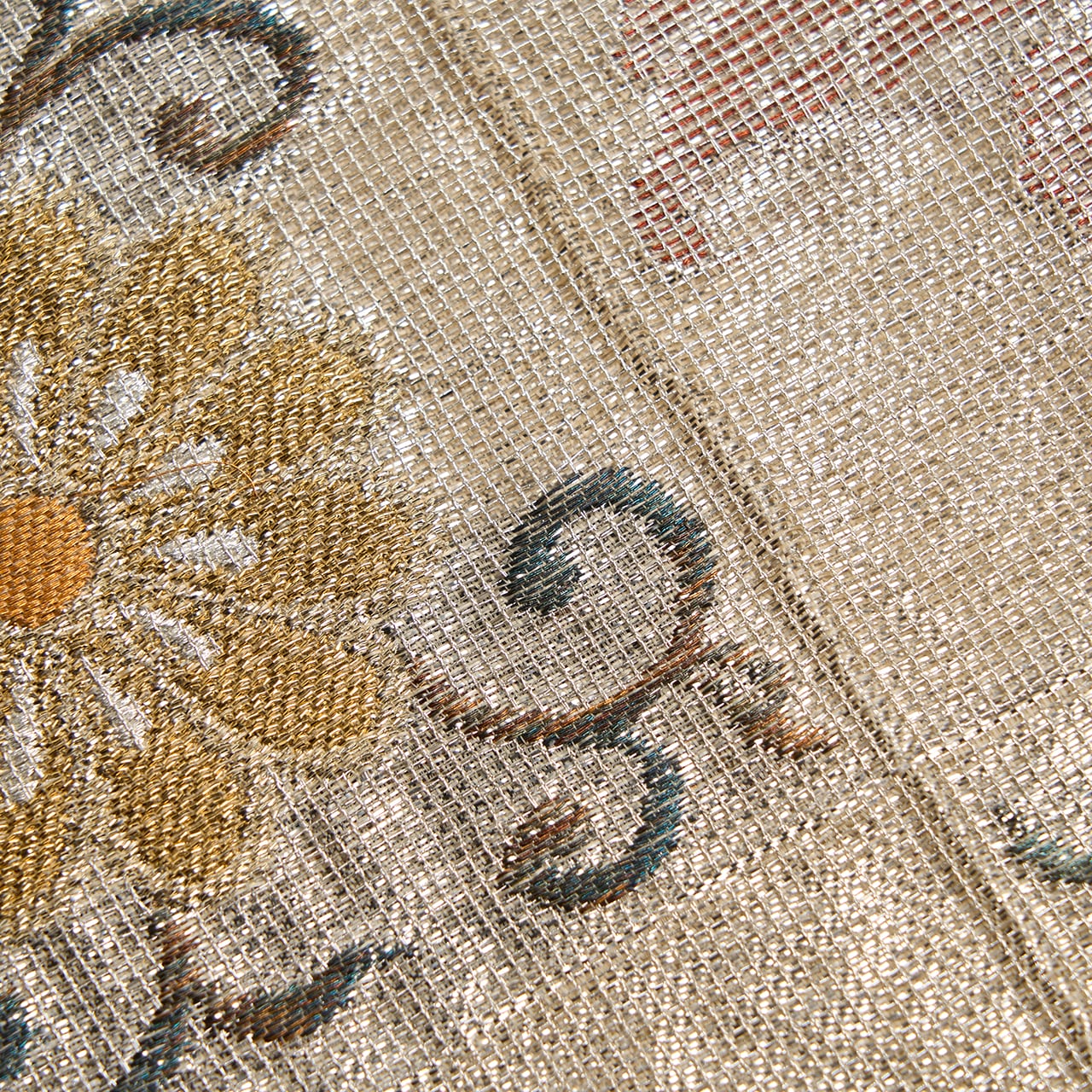 銀色の光沢のある地の織りに、パステルトーンのような繊細な色使いも魅力的で、全体に上質さがにじみ出ているような希少性の高い大変おすすめの逸品です。
