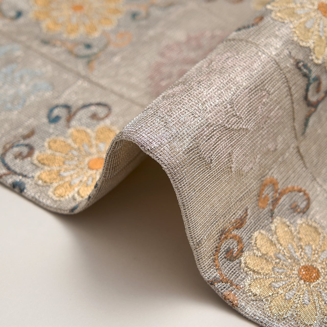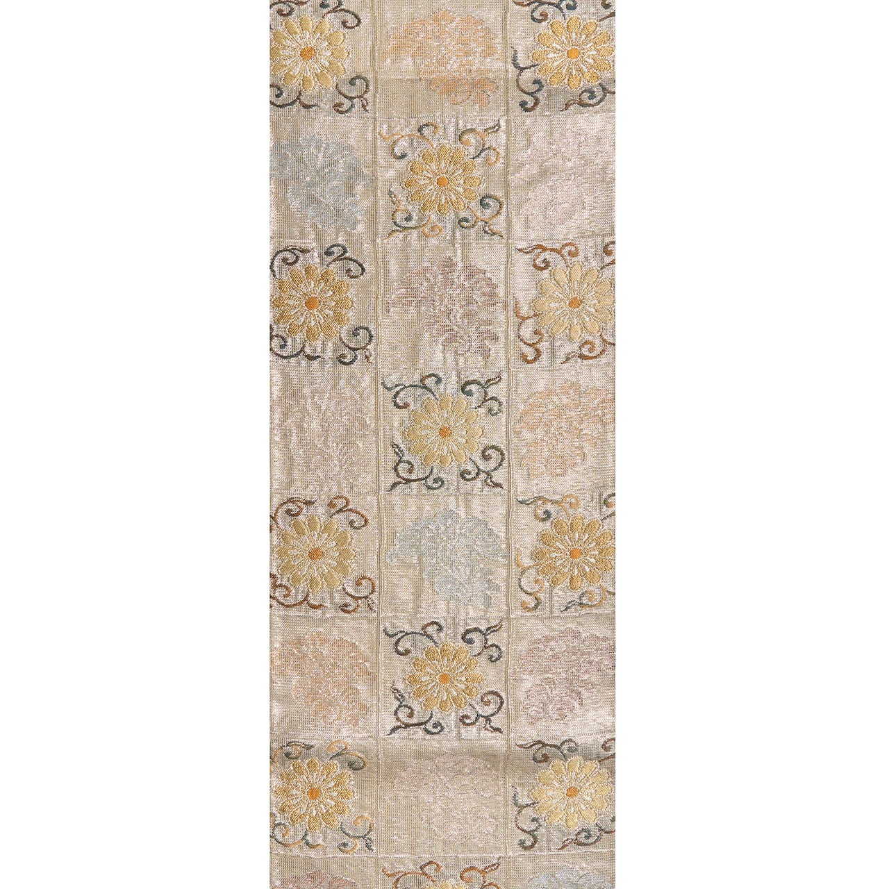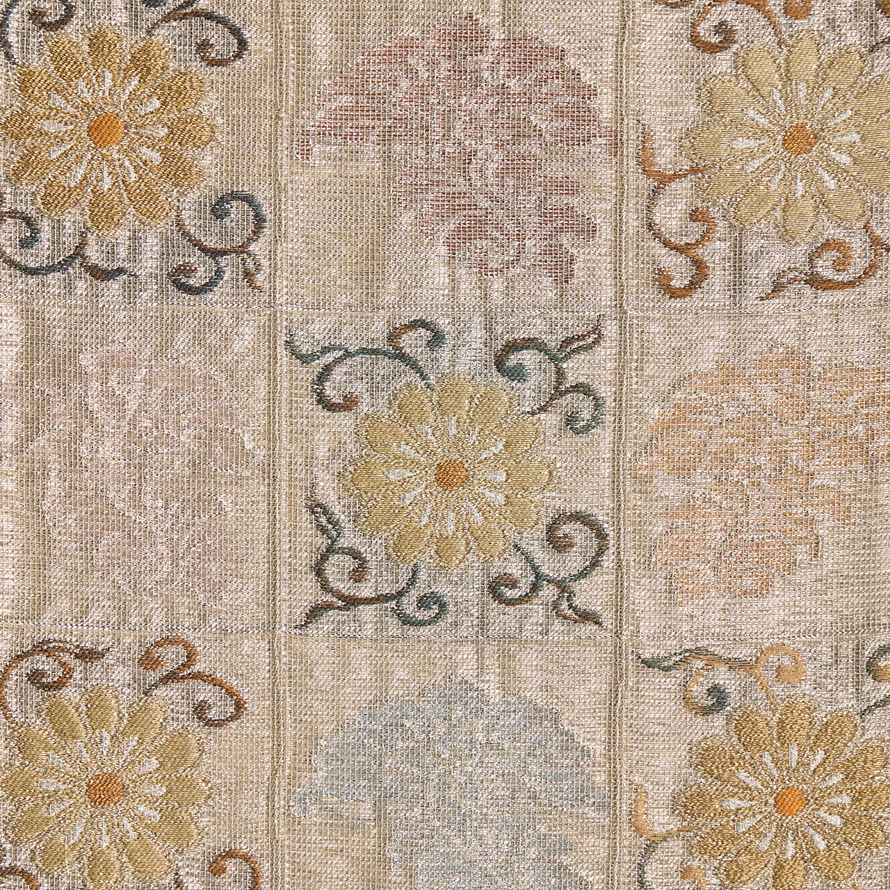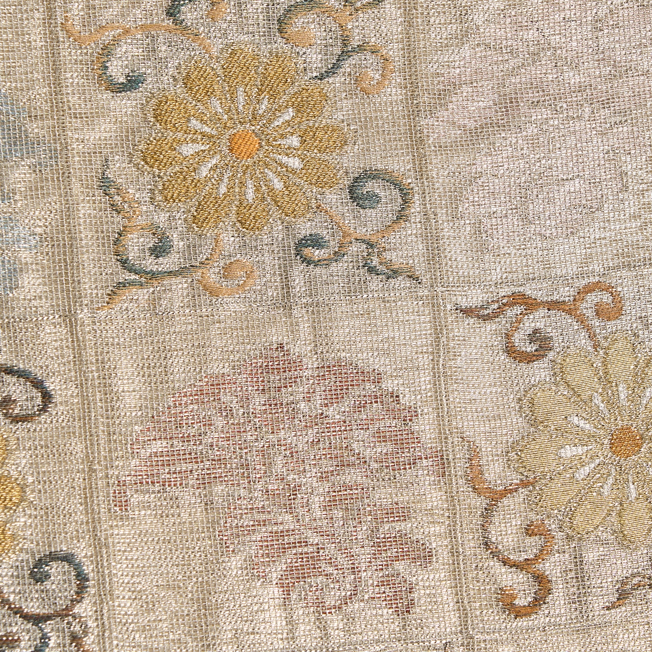 銀色の光沢のある地の織りに、パステルトーンのような繊細な色使いも魅力的で、全体に上質さがにじみ出ているような希少性の高い大変おすすめの逸品です。