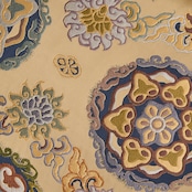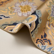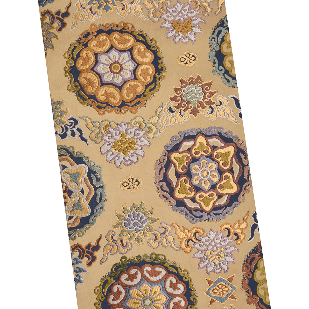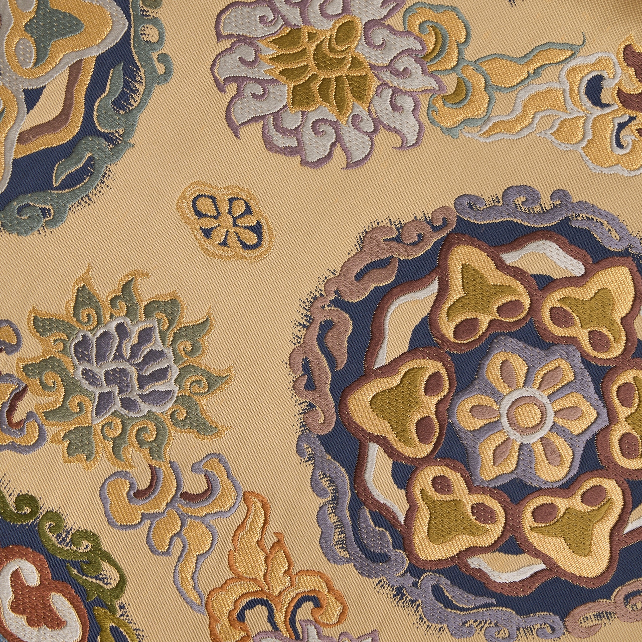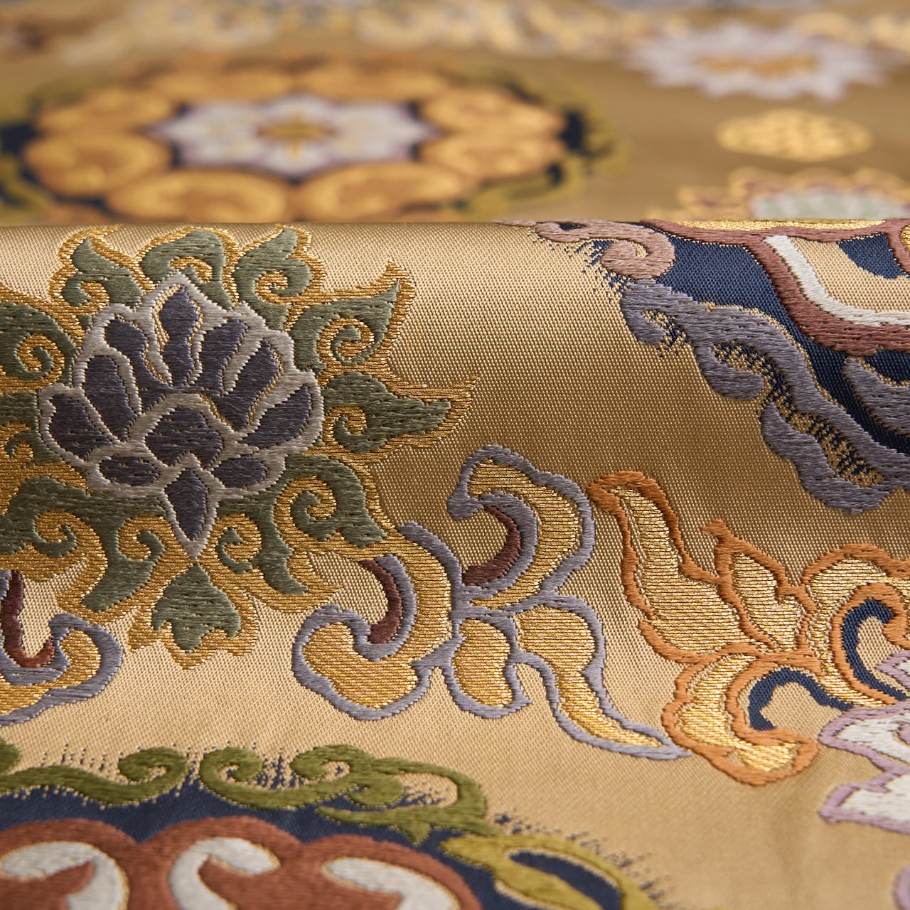 宝相華文と呼ばれる文様で、正倉院に収蔵されている琵琶の撥面や天蓋の刺繍垂飾、漆絵蒔絵などにもこの文様が描かれていることからも、古くに日本に伝わって来たようで、連続する植物文様に華麗な花の文様があしらわれていて、実在する植物ではなく、想像上のものといわれています。