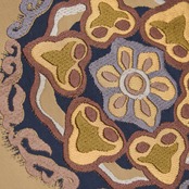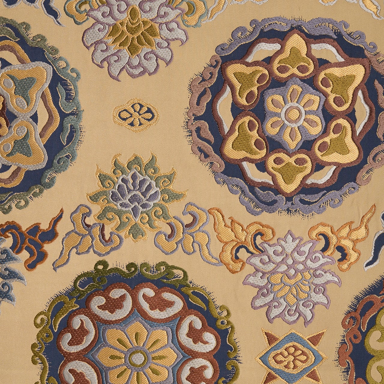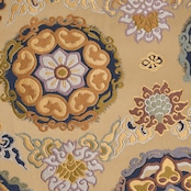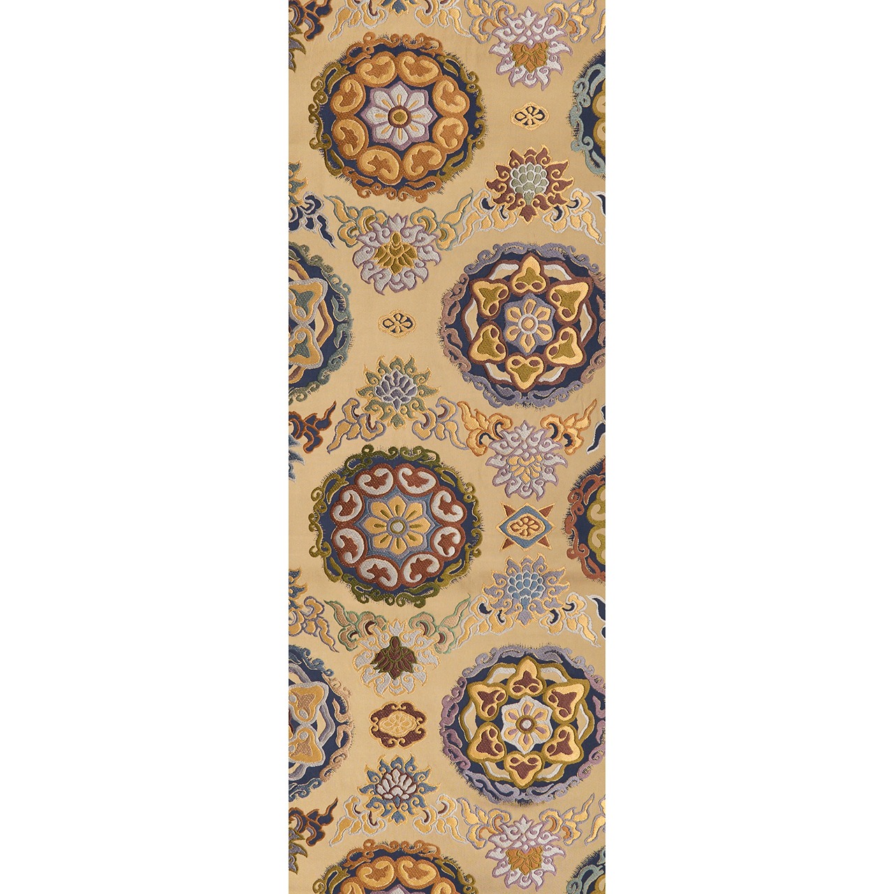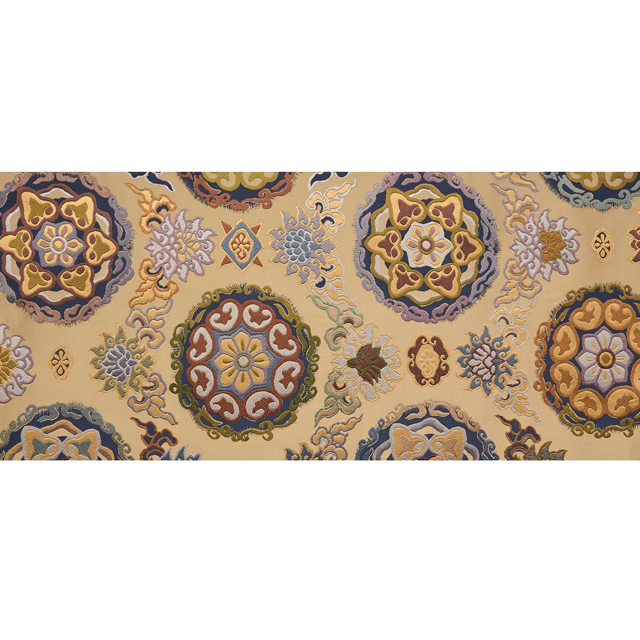 宝相華文と呼ばれる文様で、正倉院に収蔵されている琵琶の撥面や天蓋の刺繍垂飾、漆絵蒔絵などにもこの文様が描かれていることからも、古くに日本に伝わって来たようで、連続する植物文様に華麗な花の文様があしらわれていて、実在する植物ではなく、想像上のものといわれています。