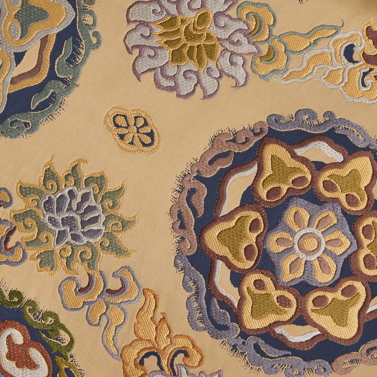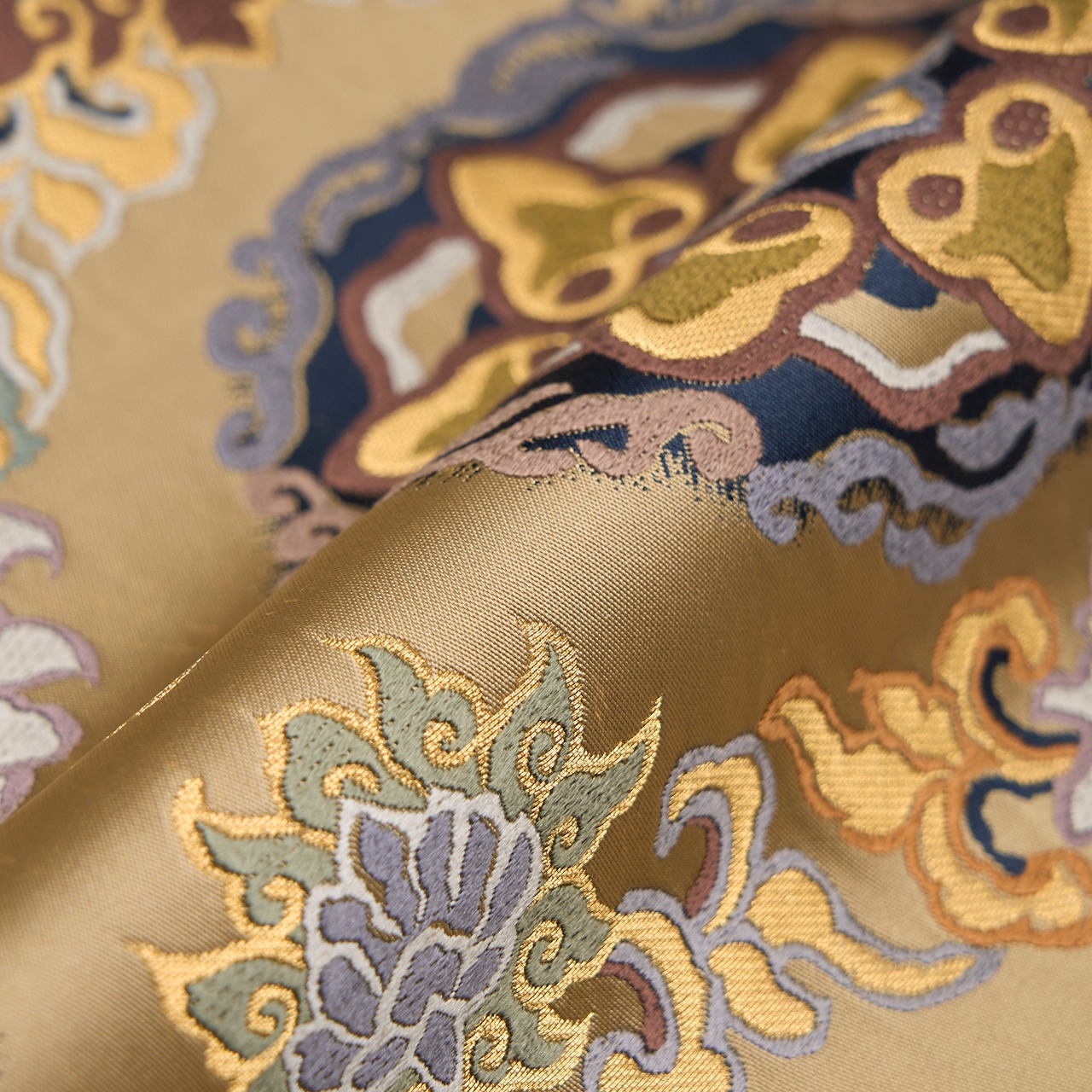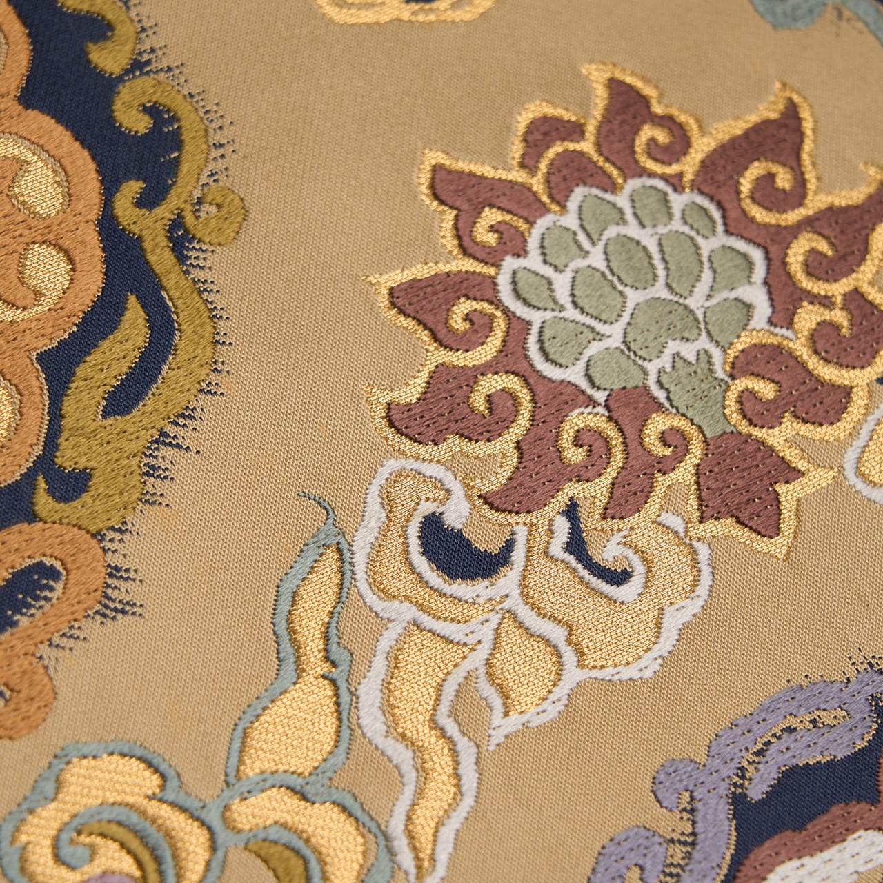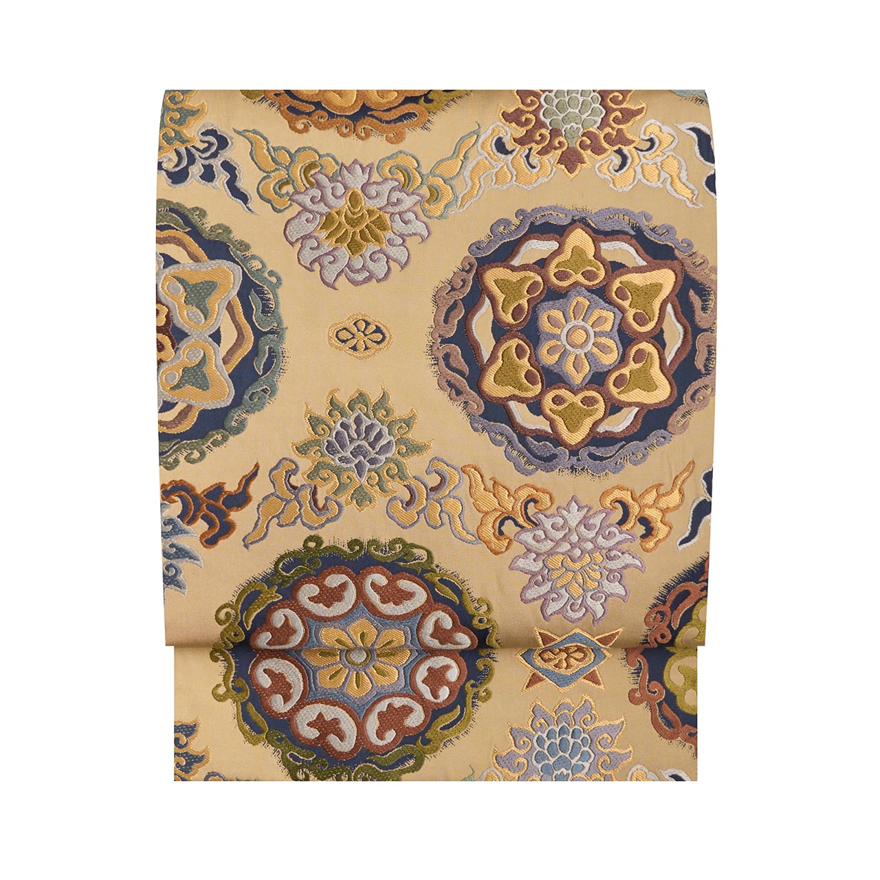 その格調高さのある宝相華文様が、黒を含めたメリハリのあるような色使いで織り出され、くっきりとした存在感のある帯となっています。