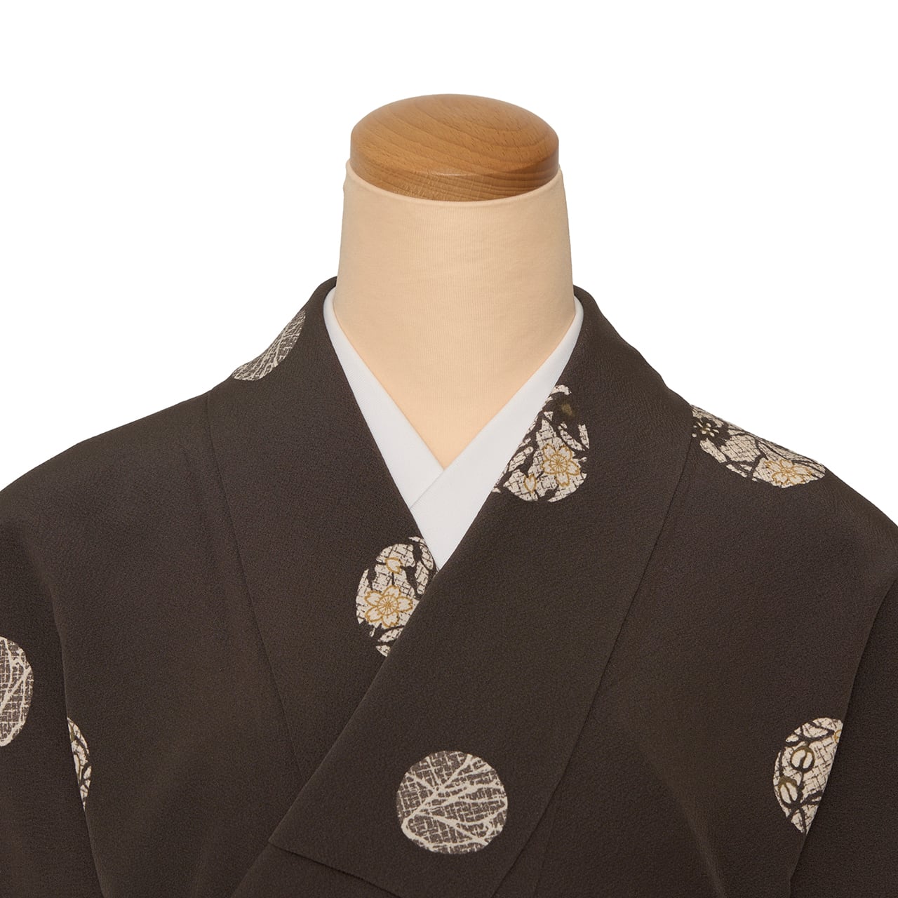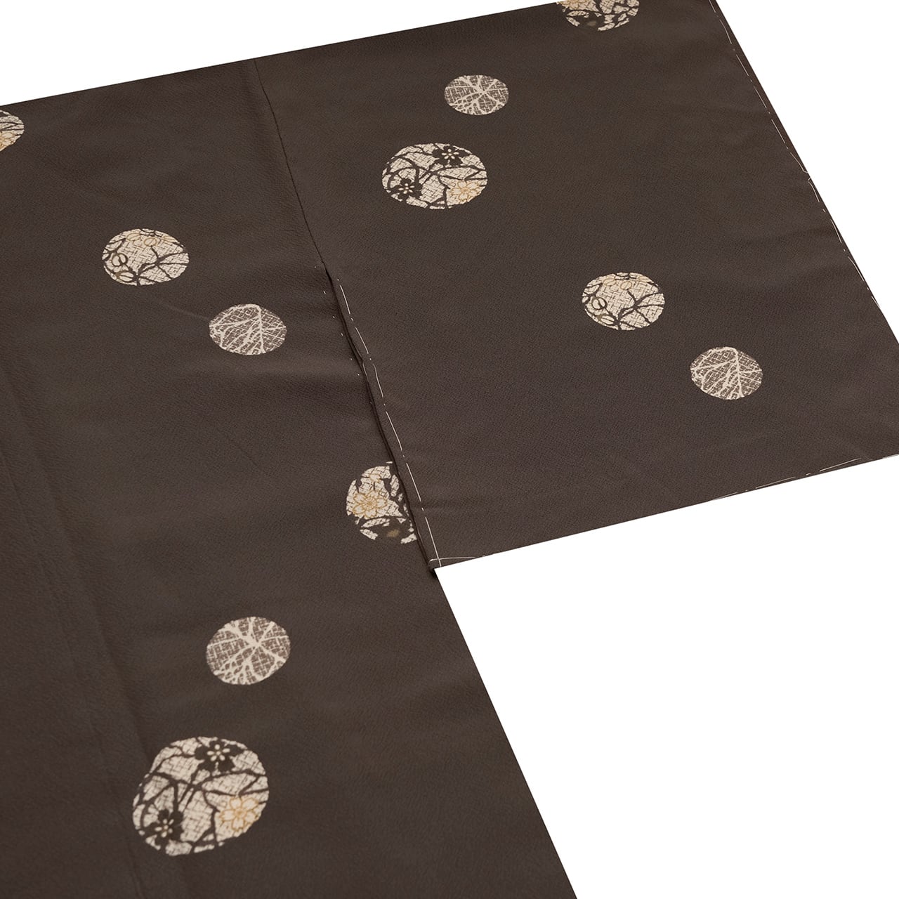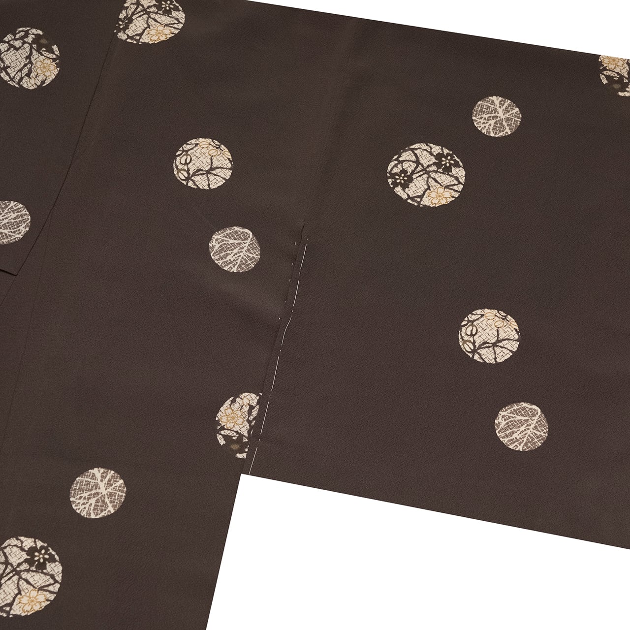 シックな色使いが洒落ていて、流れるような配置の丸紋のバランスもとても良く、リズミカルな雰囲気の素敵なお着物となっています。