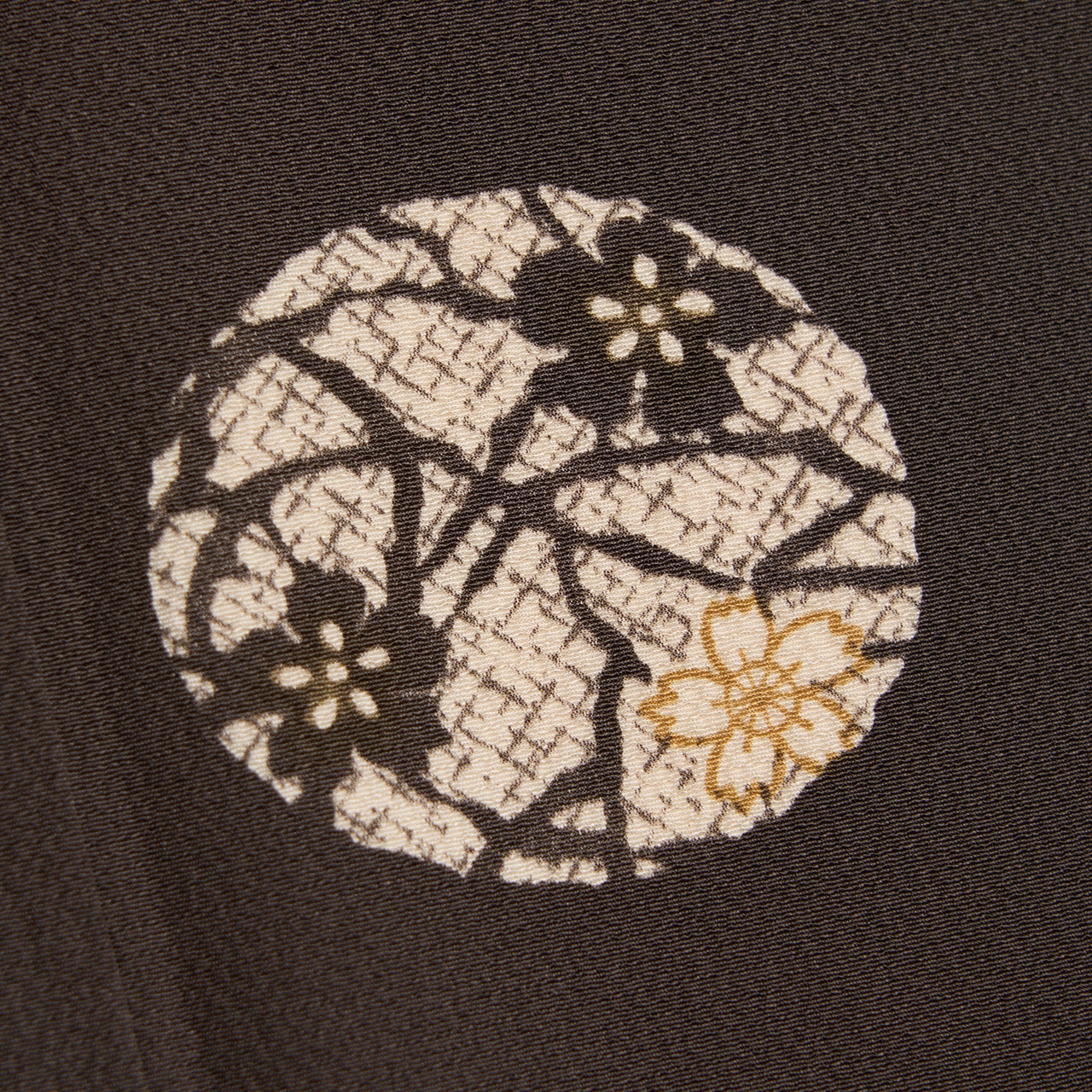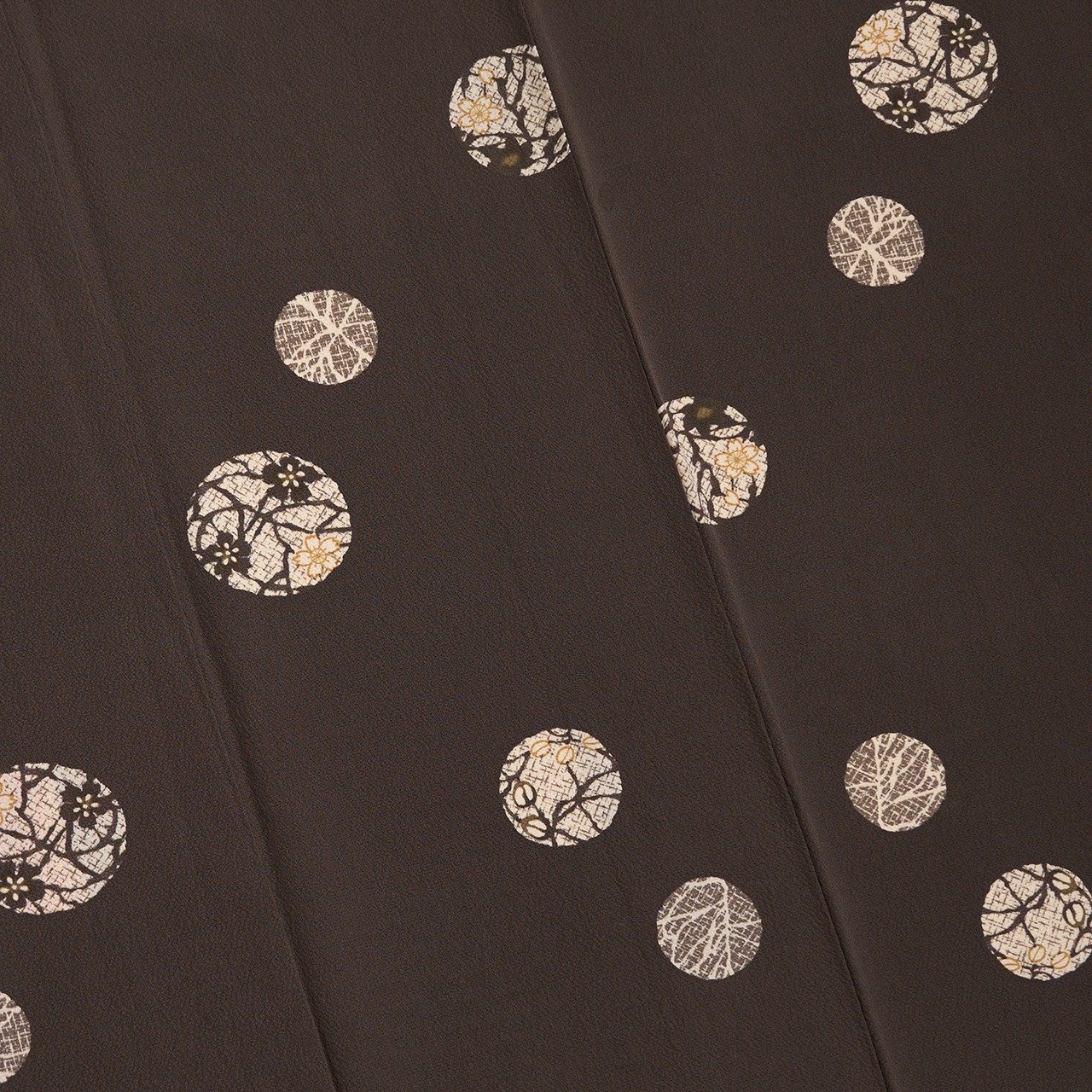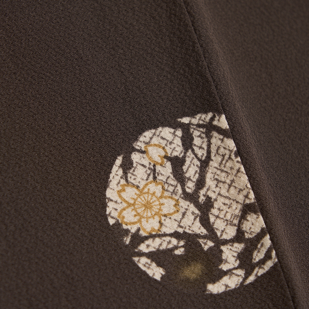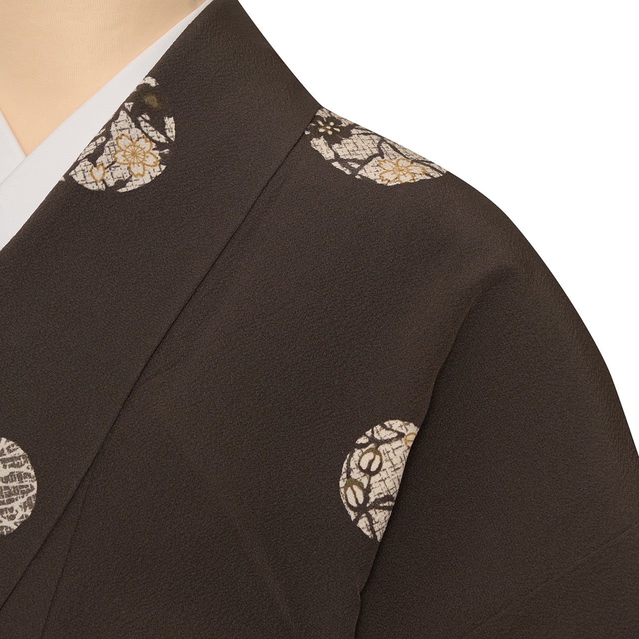 少しだけグレー味の感じられる焦げ茶・黒橡色のしっかりとした一越ちりめんの生地に、大小の丸が染め抜かれた中に、江戸鼠色の薄茶の線で格子が染められたものや、煤色の地に白で格子が入れられたものなどがあって、それに桜のお花や萩の葉などが染められた、モノトーン的なお洒落な雰囲気の小紋のお着物です。
