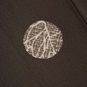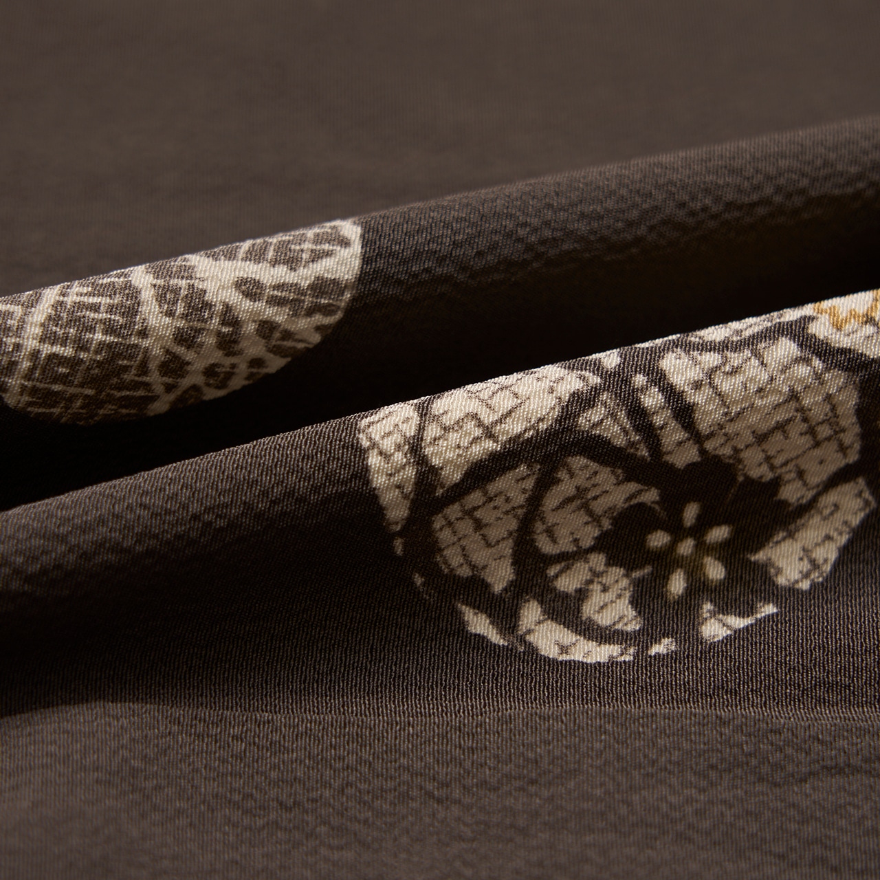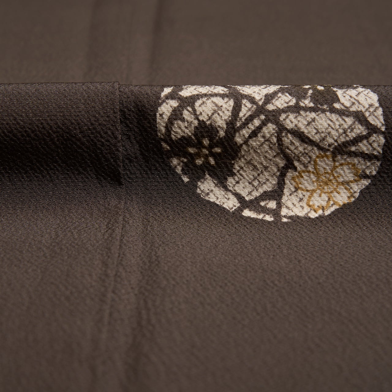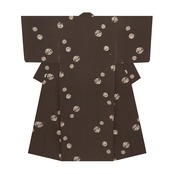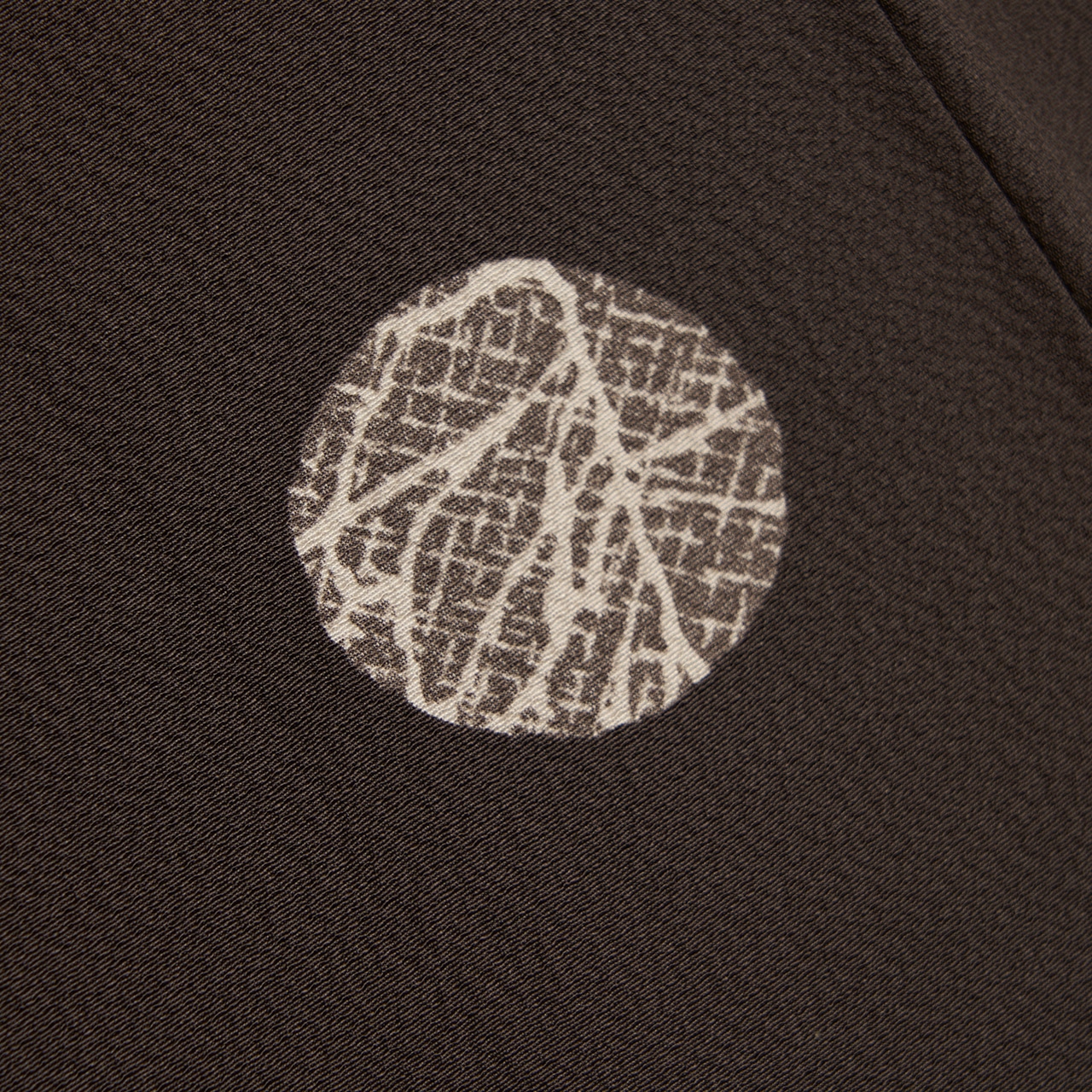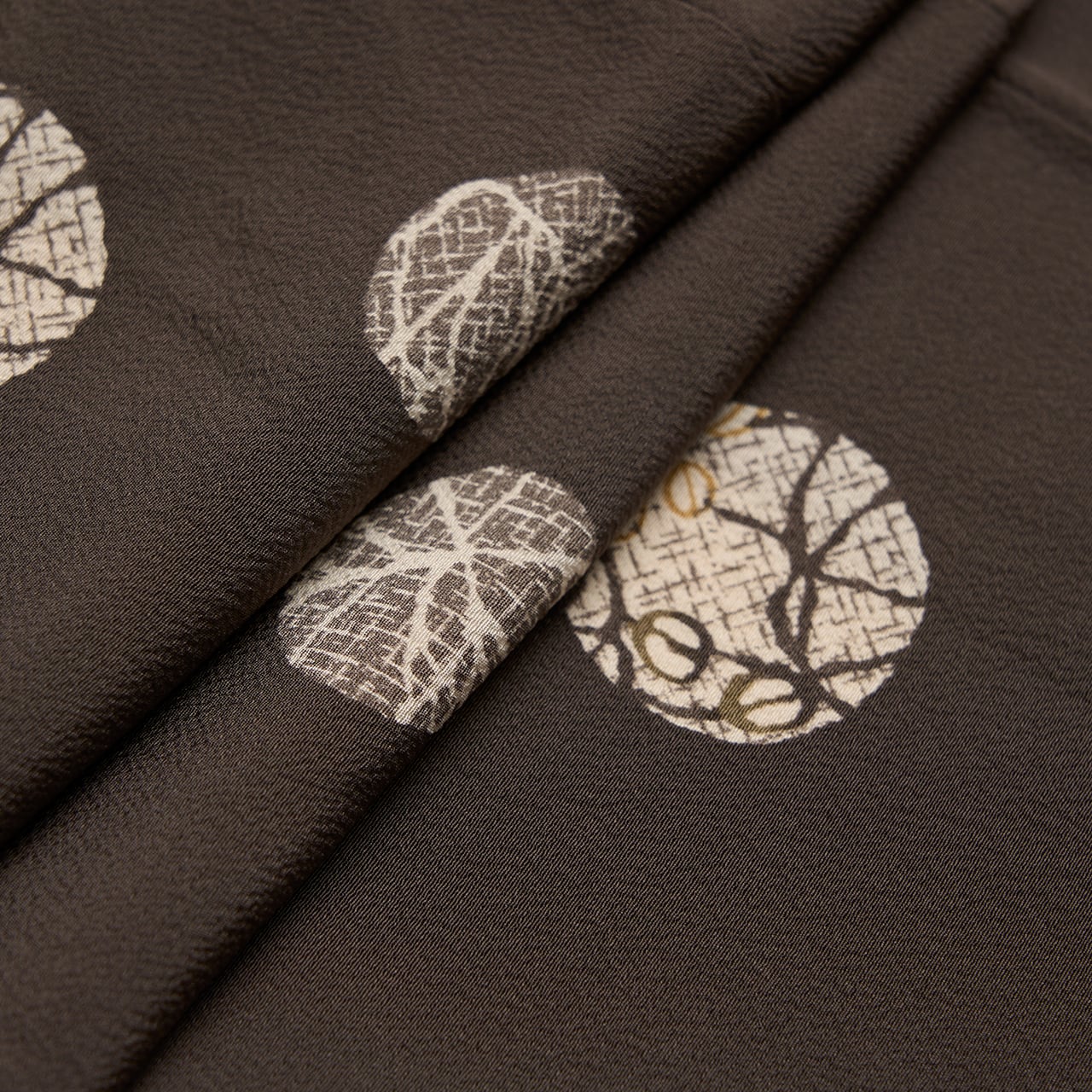 少しだけグレー味の感じられる焦げ茶・黒橡色のしっかりとした一越ちりめんの生地に、大小の丸が染め抜かれた中に、江戸鼠色の薄茶の線で格子が染められたものや、煤色の地に白で格子が入れられたものなどがあって、それに桜のお花や萩の葉などが染められた、モノトーン的なお洒落な雰囲気の小紋のお着物です。