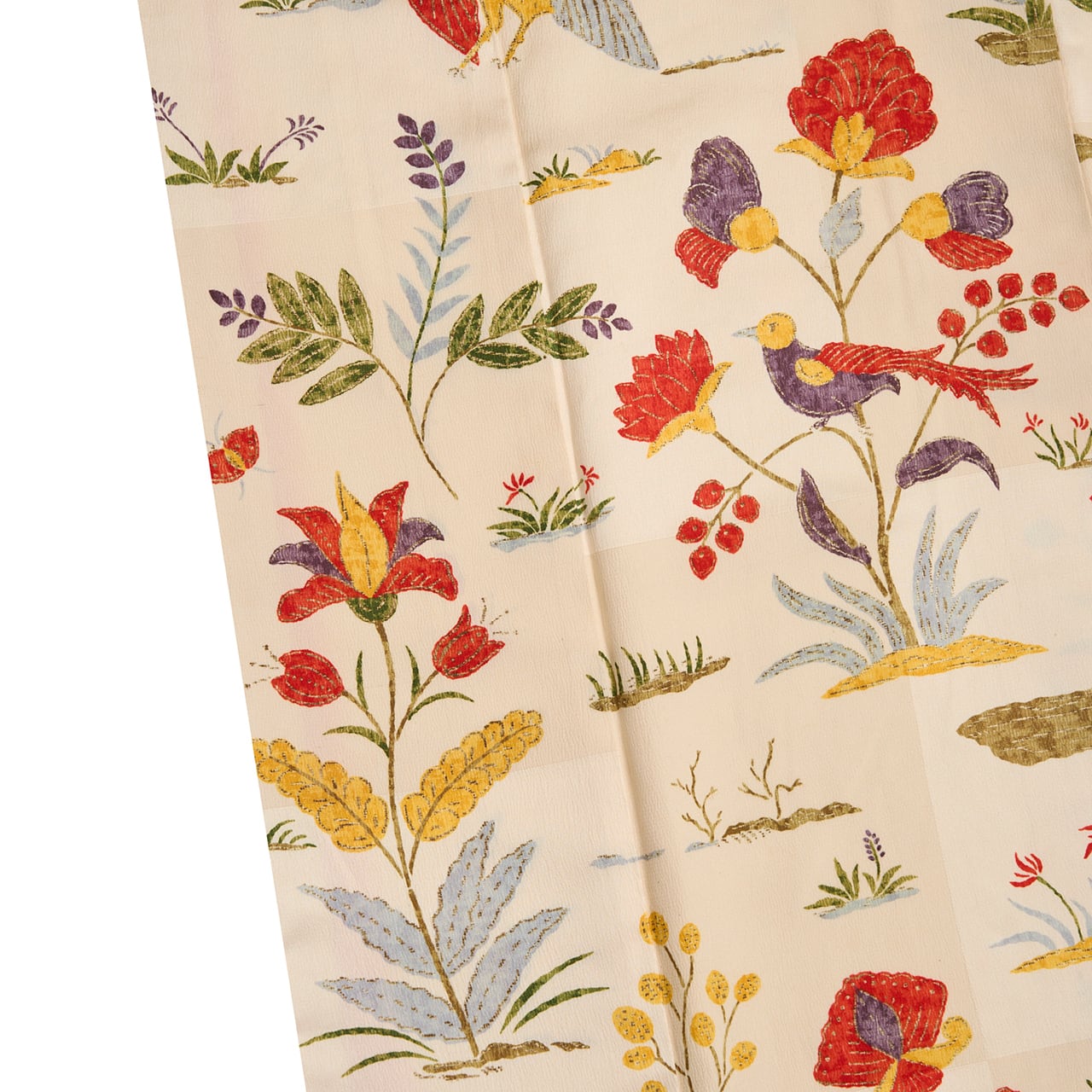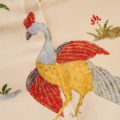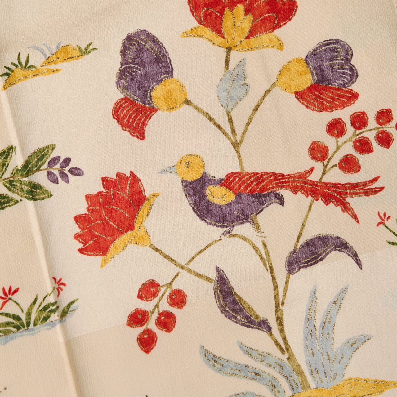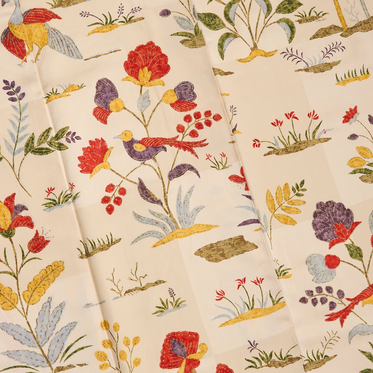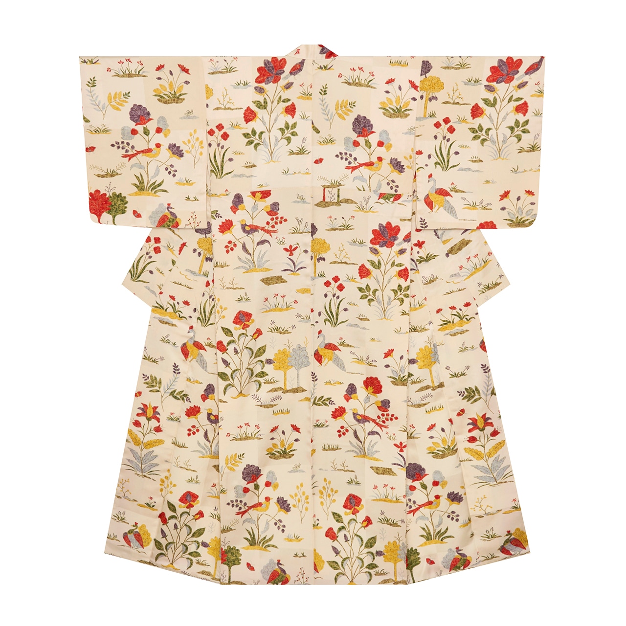 大きな市松取りの地模様のある紋意匠の象牙色の生地に、いろいろな大小のペルシャ花文のような草花が描かれ、そこにとまっている尾の長い鳥、傍らに佇んでいる孔雀の姿があって、小さな蝶々が飛び交っているといった楽園のような風景が、カラフルな摺型友禅で描かれた一方附の小紋のお着物です。