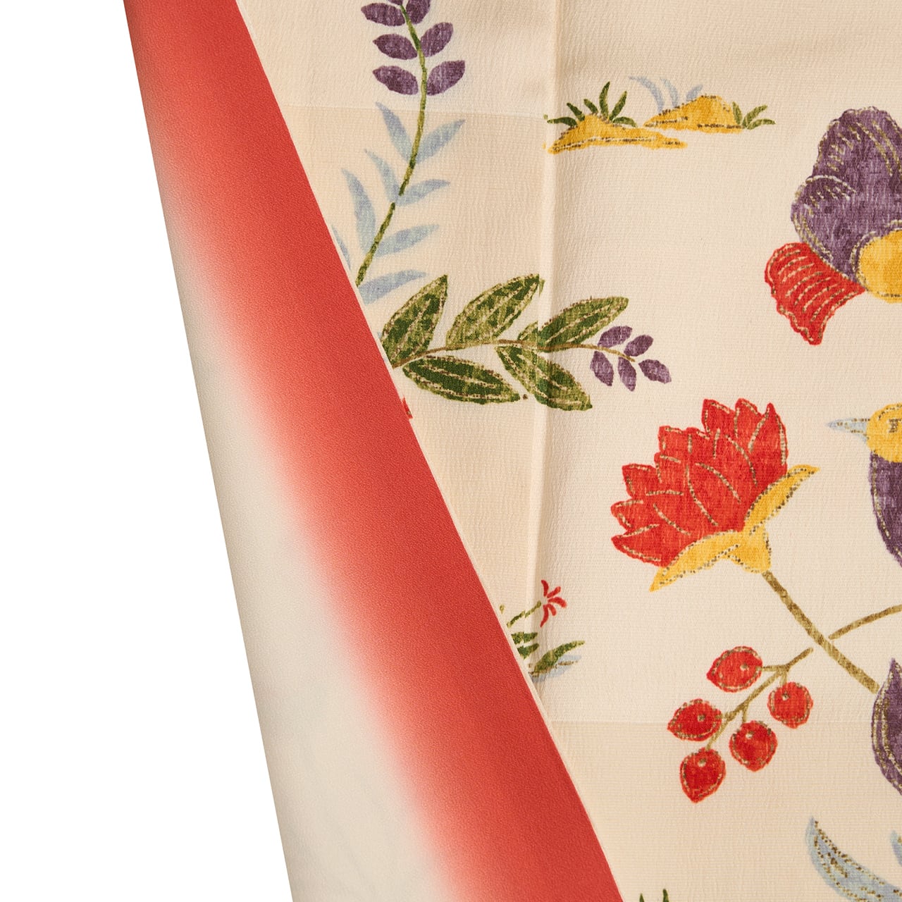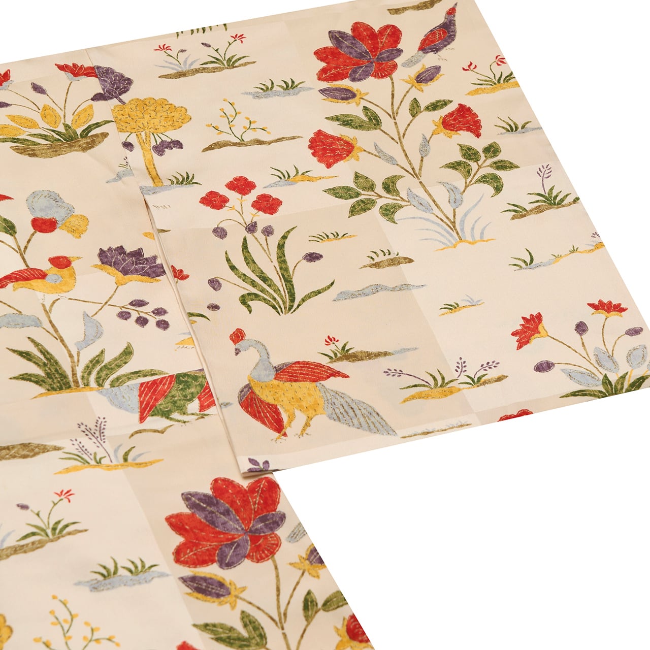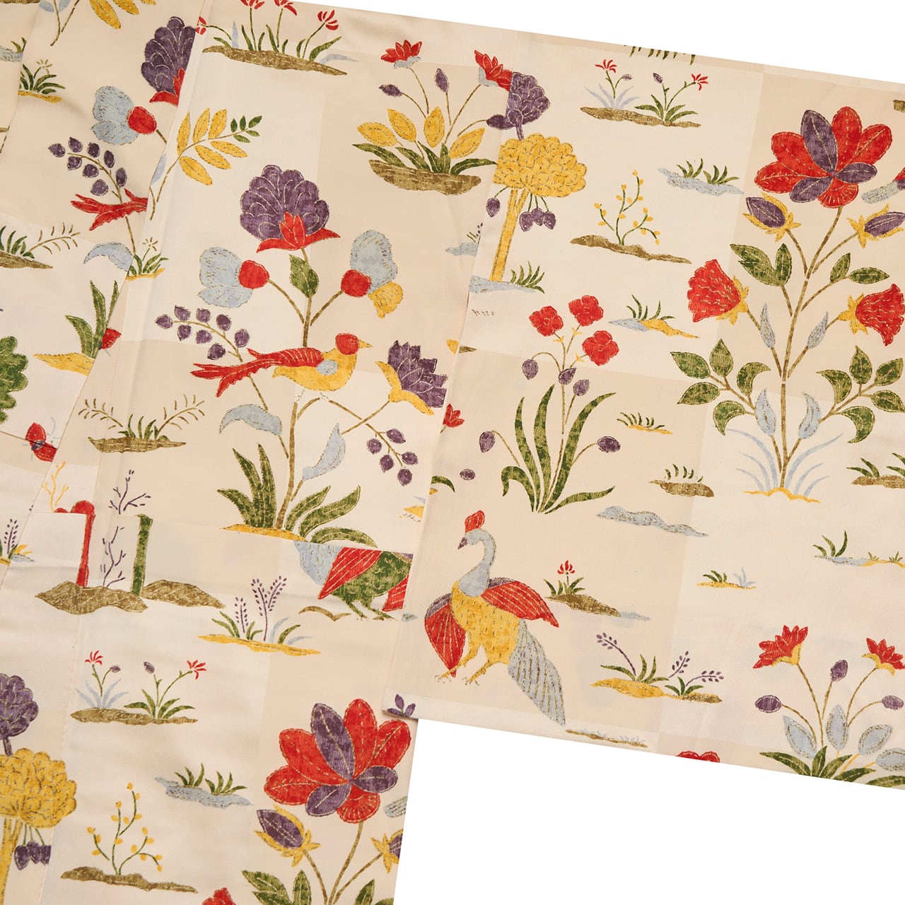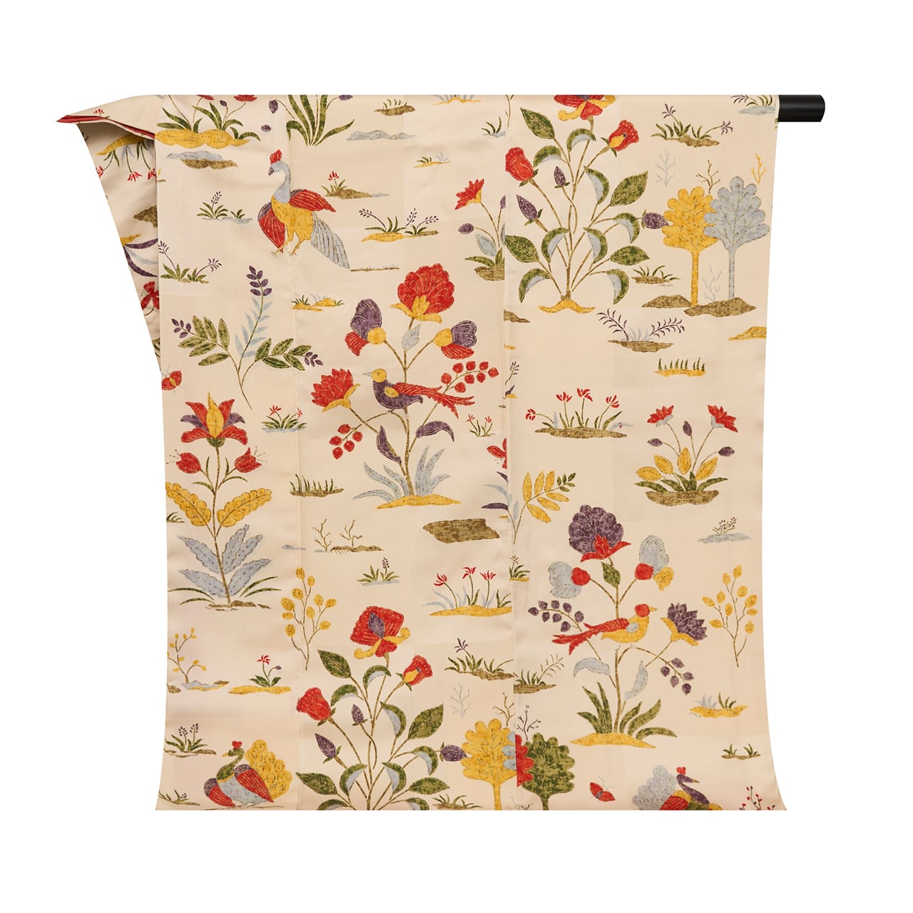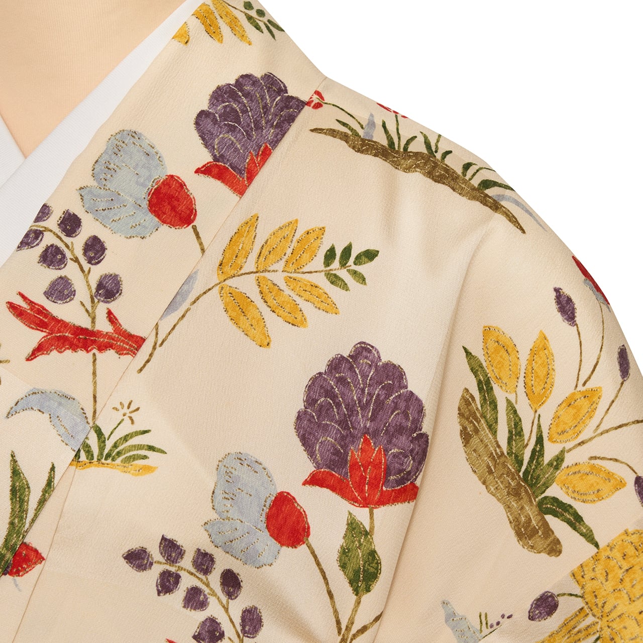 大きな市松取りの地模様のある紋意匠の象牙色の生地に、いろいろな大小のペルシャ花文のような草花が描かれ、そこにとまっている尾の長い鳥、傍らに佇んでいる孔雀の姿があって、小さな蝶々が飛び交っているといった楽園のような風景が、カラフルな摺型友禅で描かれた一方附の小紋のお着物です。