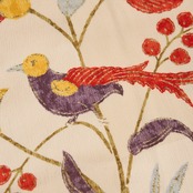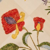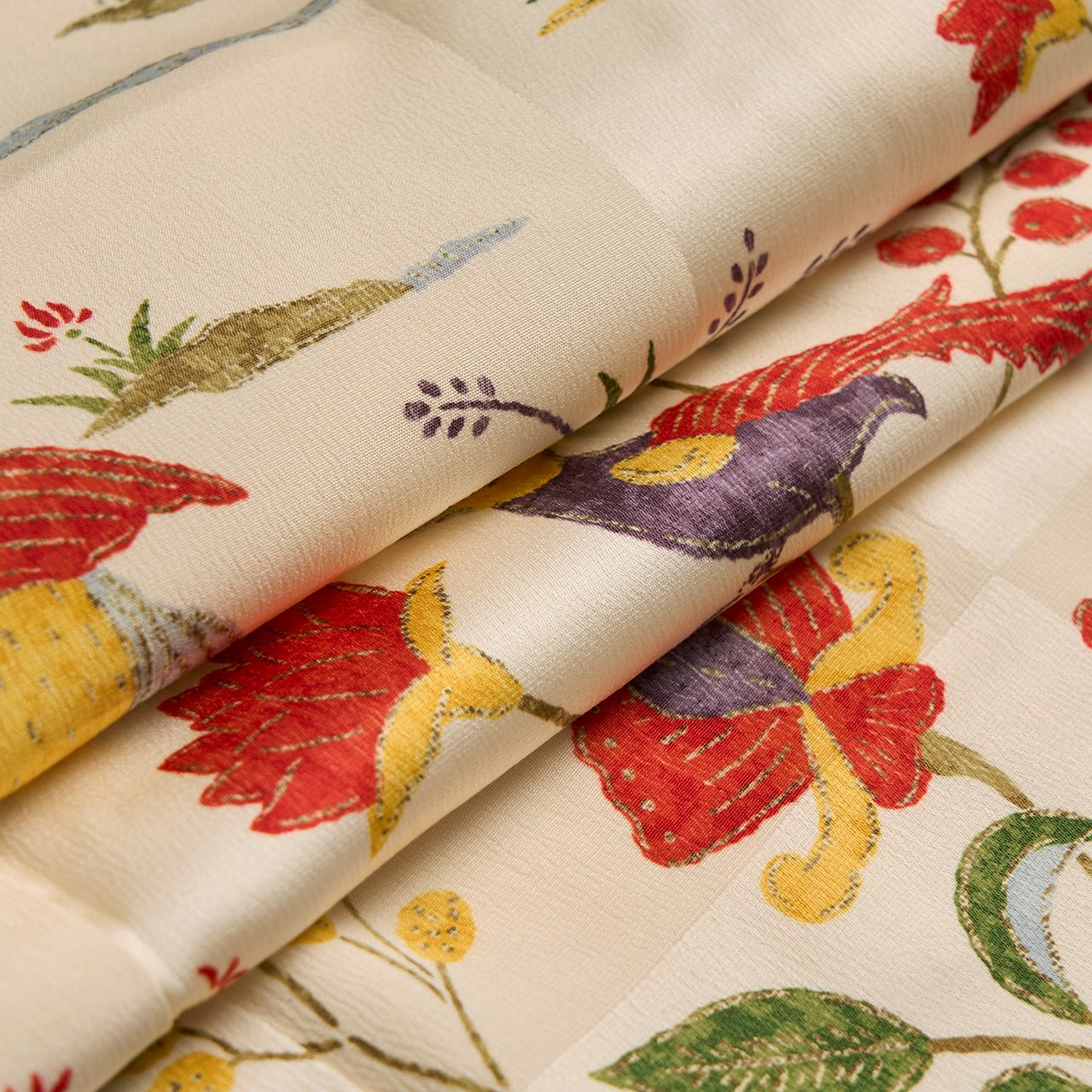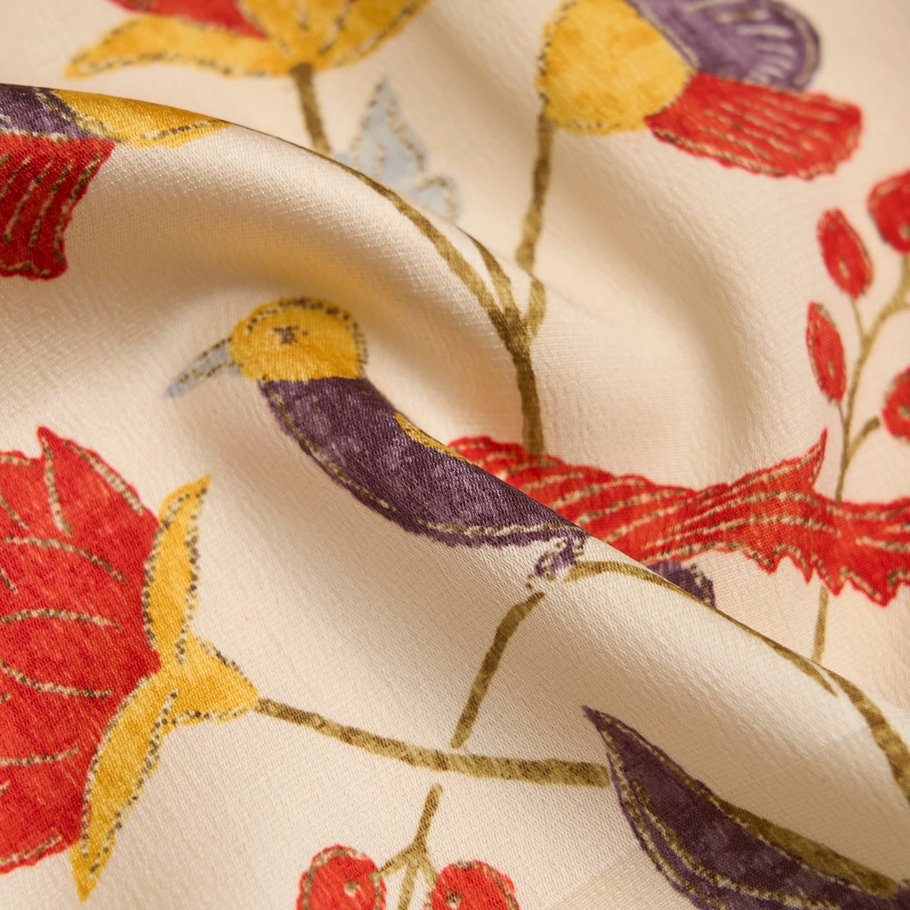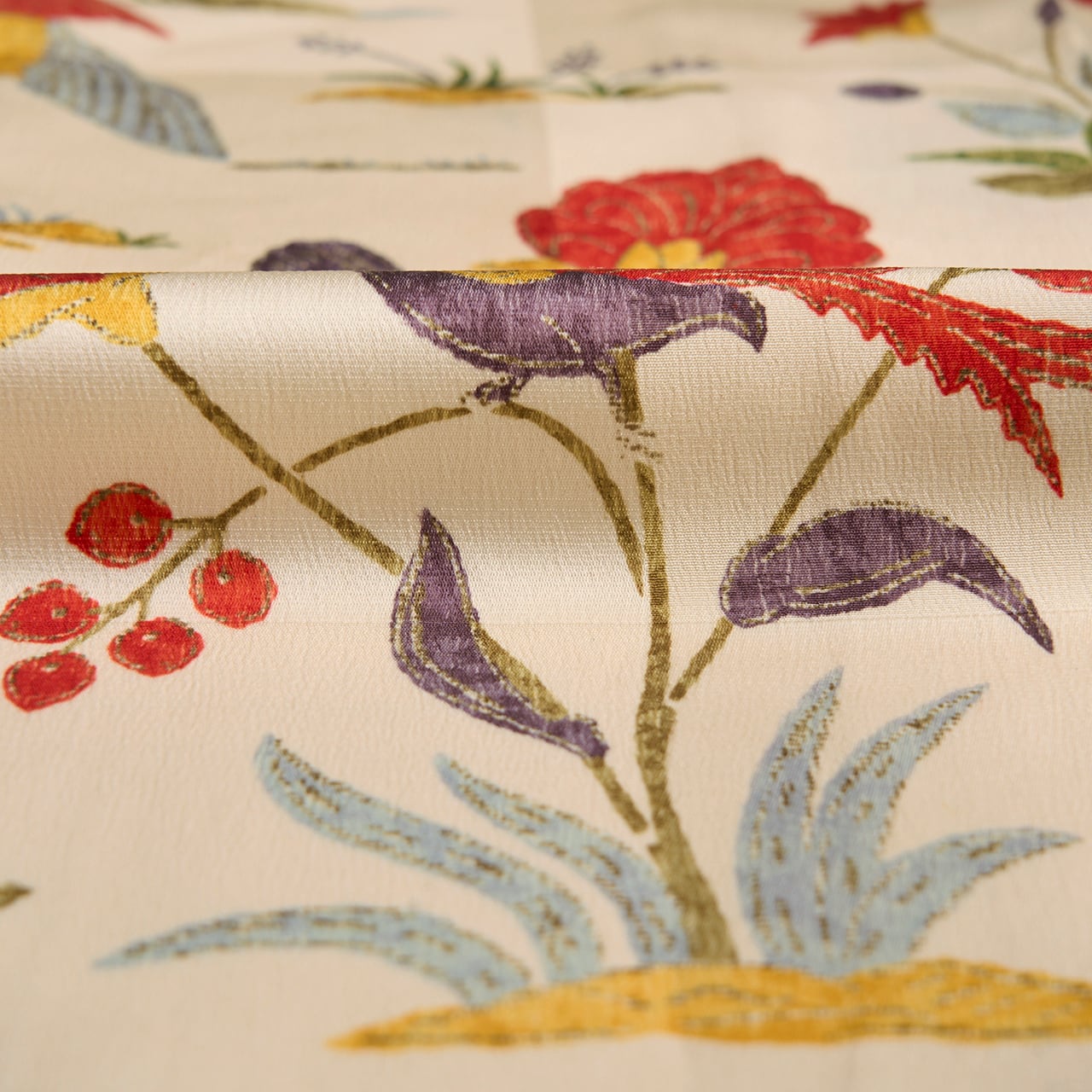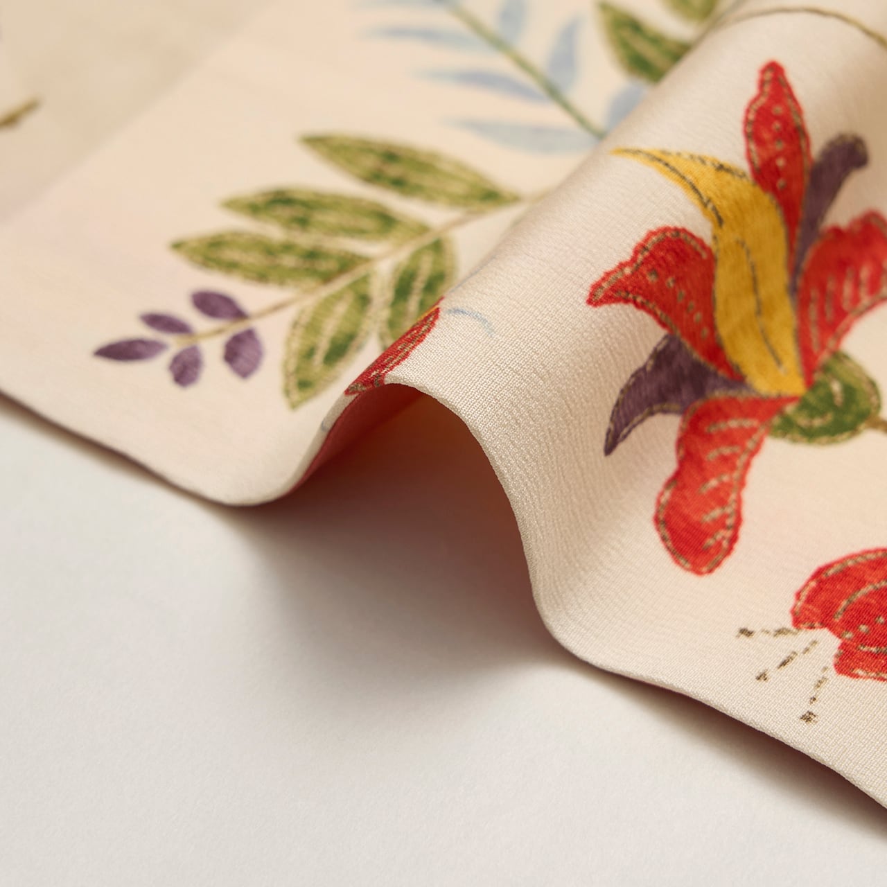 大きな市松取りの地模様のある紋意匠の象牙色の生地に、いろいろな大小のペルシャ花文のような草花が描かれ、そこにとまっている尾の長い鳥、傍らに佇んでいる孔雀の姿があって、小さな蝶々が飛び交っているといった楽園のような風景が、カラフルな摺型友禅で描かれた一方附の小紋のお着物です。