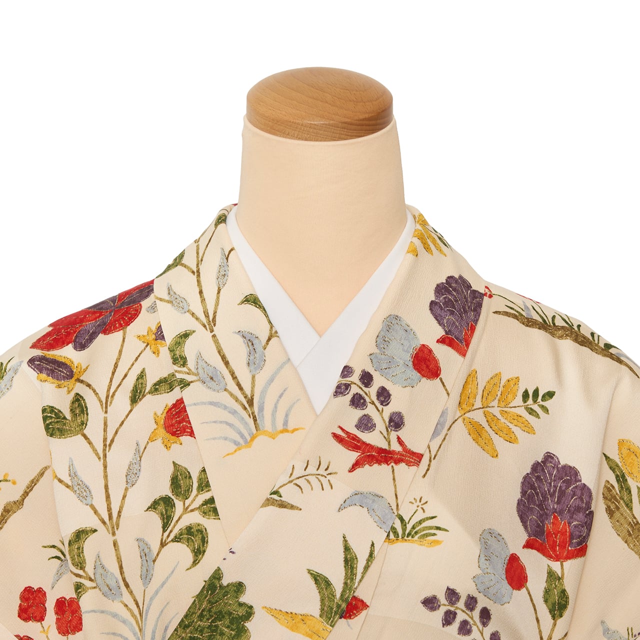 こちらのお着物ですと、名物裂的な模様や有職文様などの帯を合わせて、お茶のお席や和のお稽古の会などにお召しになるのも良いですし、お食事会や観劇などにお召しになるのも良いと思います。