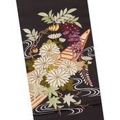 赤味のない紫をぐっと濃くしたような紅消鼠色の、繻子に似た光沢のあるしっかりとした生地に、お太鼓には水辺に浮かぶ小舟と、それに菊と藤の花、もみじなどが花筏のように刺繍で表された、工芸キモノ野口さんのゴージャスな雰囲気の九寸の開名古屋帯です。
