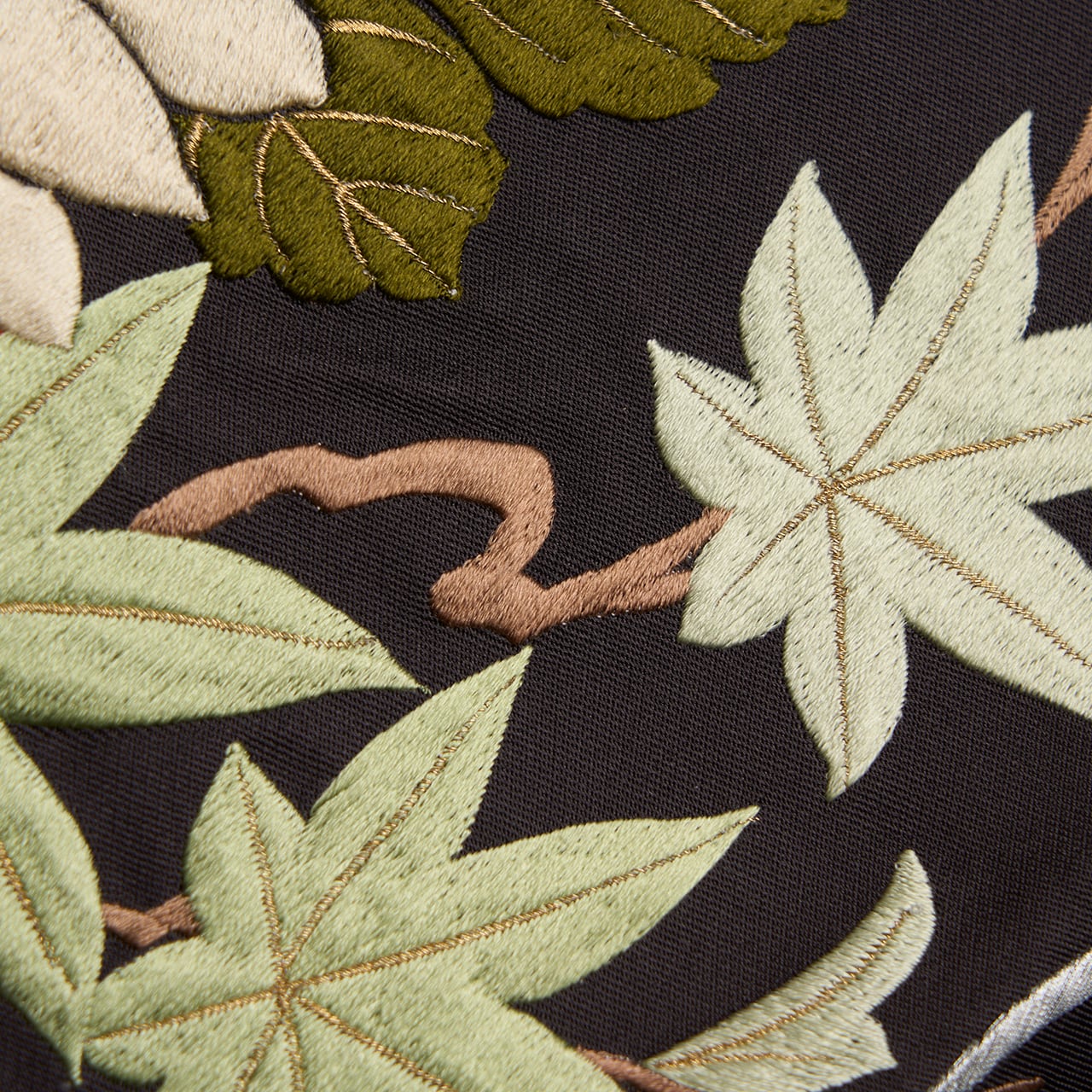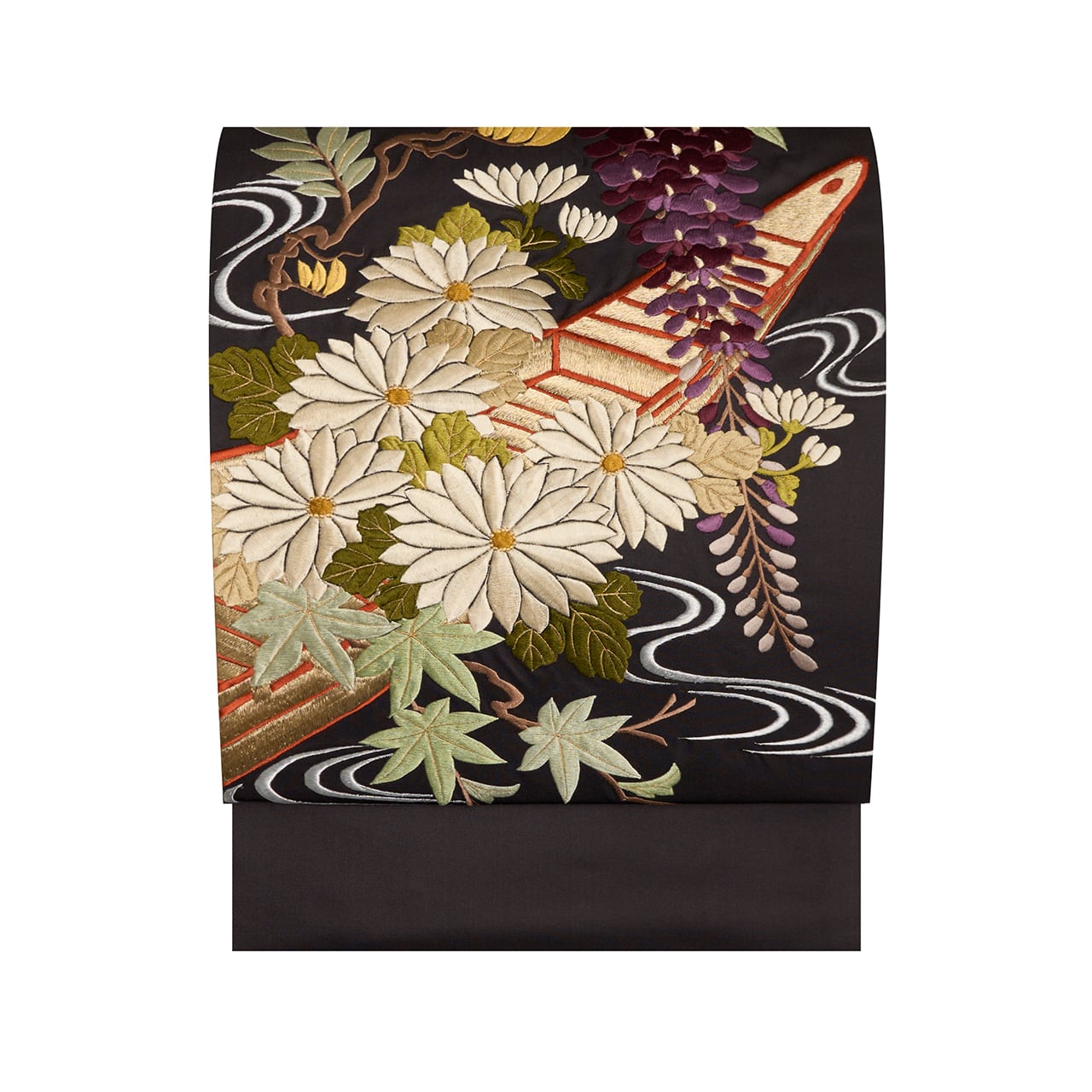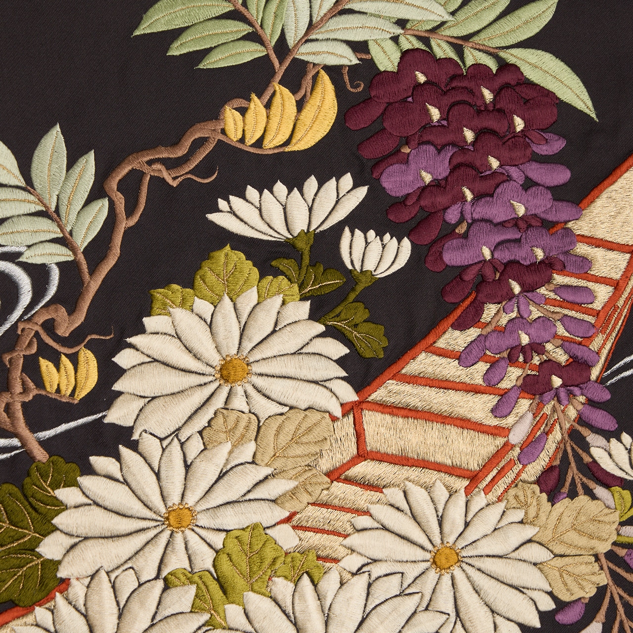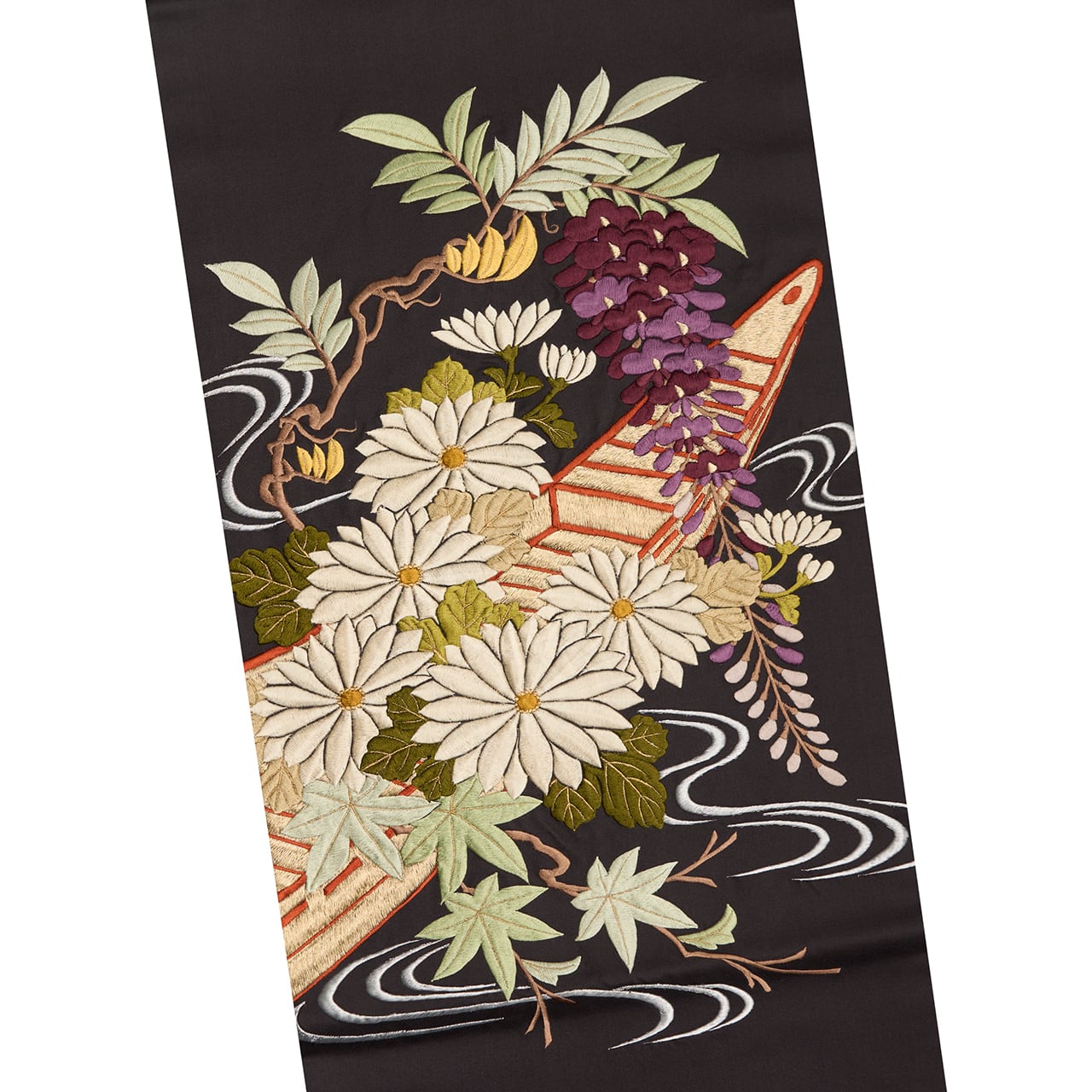 古典のモチーフでありながら、小舟を金糸で刺繍されていたり、菊のお花はシャンパンベージュのような光沢のある刺繍がされていたり、簪のように枝垂れる藤のお花が優雅な雰囲気を醸し出していたりと、さすがと思わされるような一貫したセンスの良さが見られます。