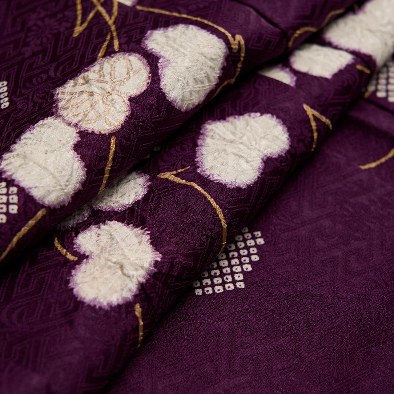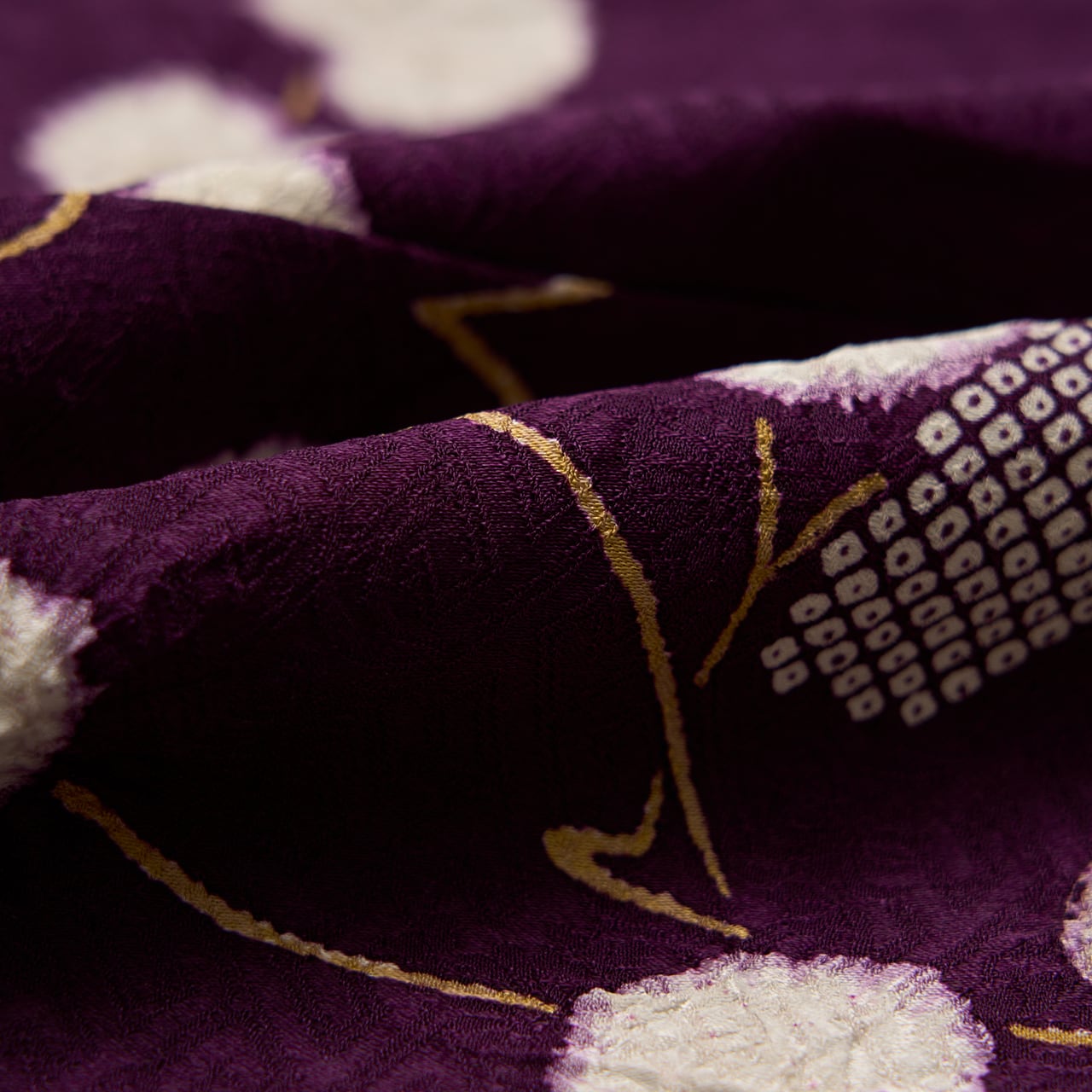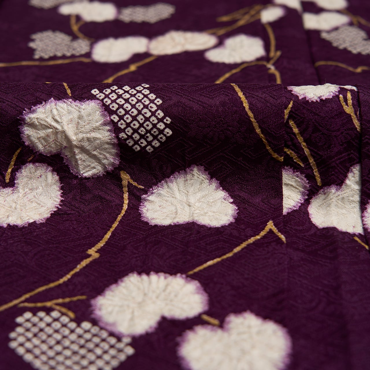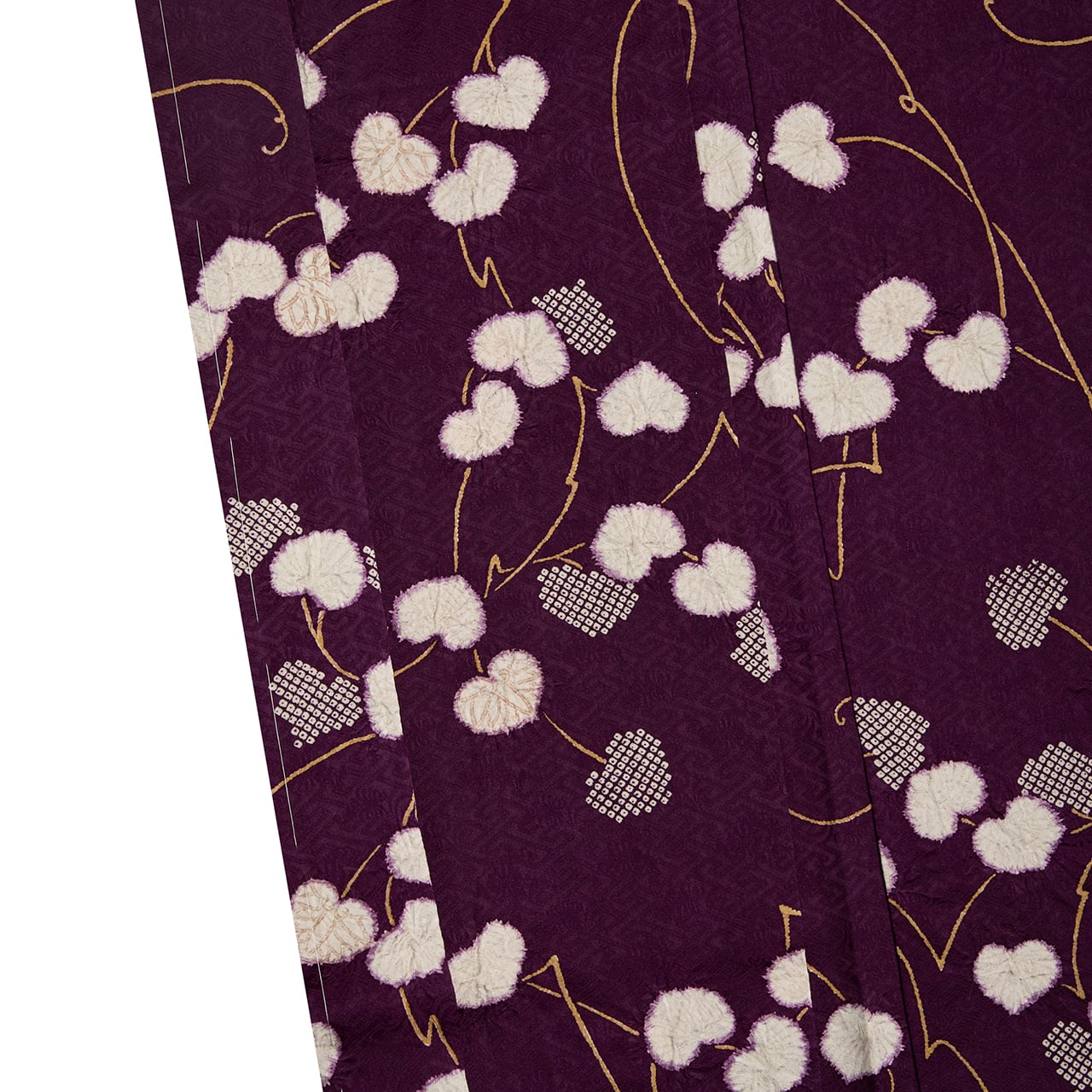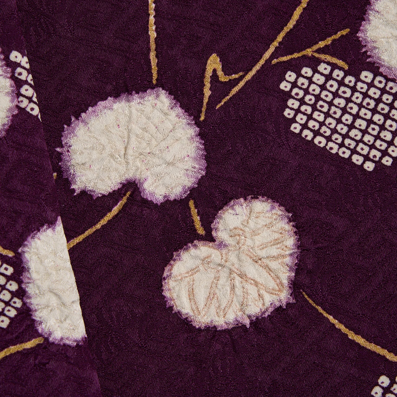 葵の葉は絞りの加工が施されることを想定して少し輪郭を暈すような縁取りがされていて、それも味わい深く感じられますし、細かな疋田模様があることで白い葵の葉が引き立てられているように見えます。