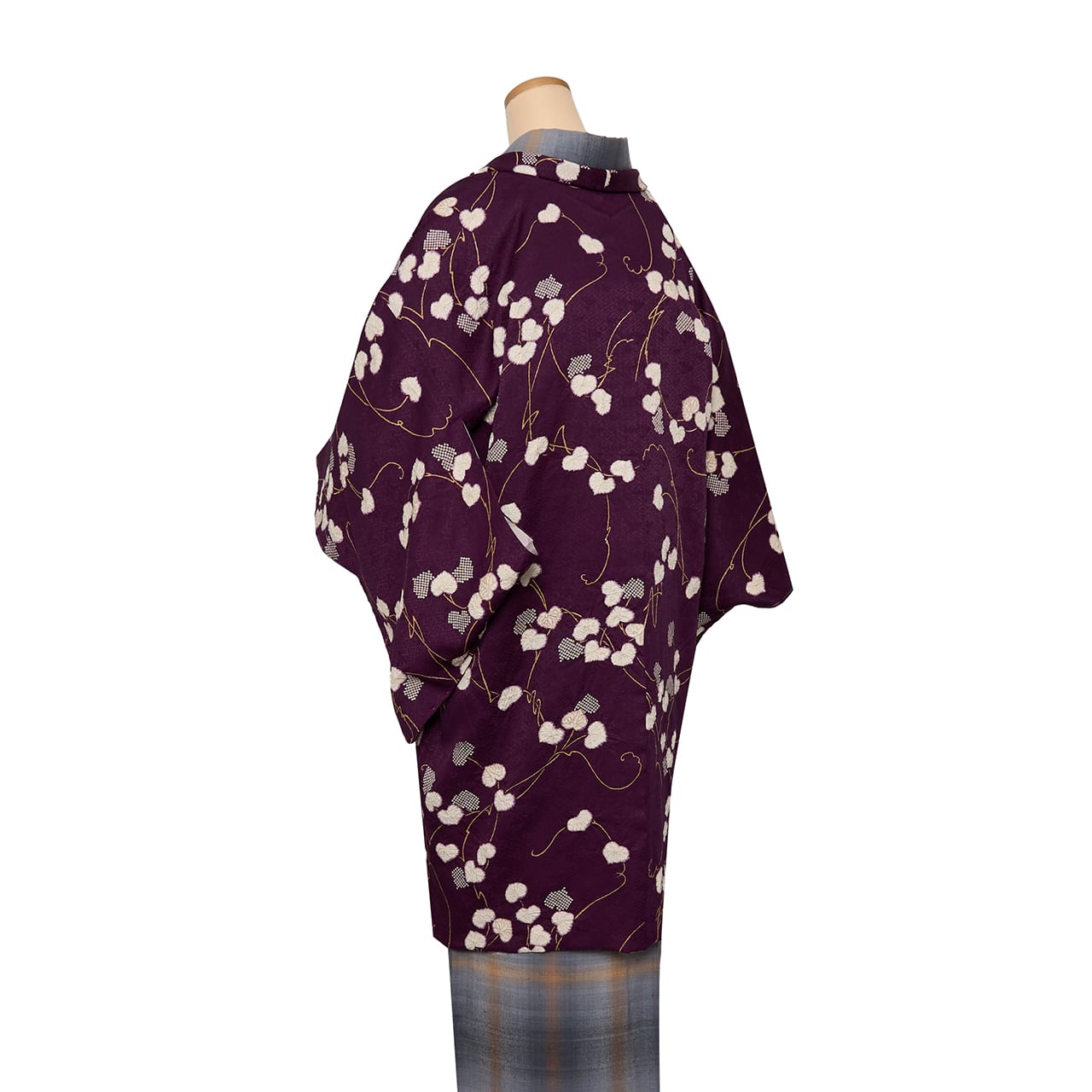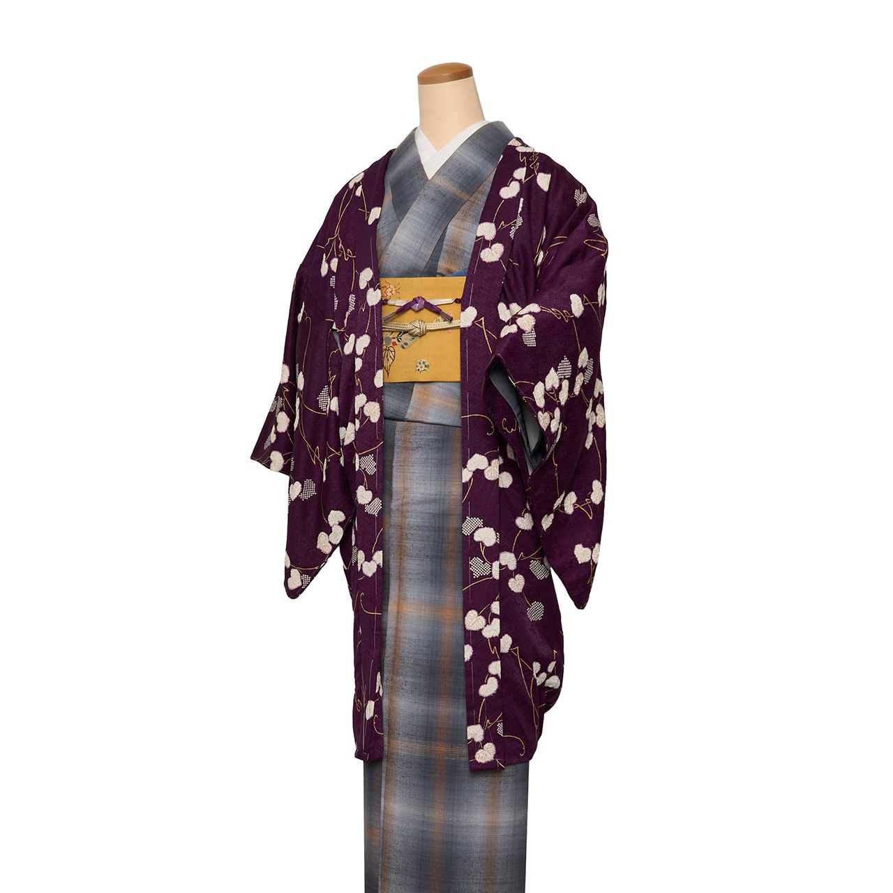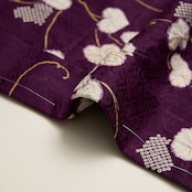 紗綾型に菊と春蘭のお花が散らされた伝統的な文様が地模様となった紋意匠の生地が濃い紫・紫紺色に染められ、葵の葉が白く、また部分的には細かな疋田模様に染め抜かれ、それが少しディフォルメされて蔓のような形に表されたものが連続して、さらに白い葵の葉には絞りの加工が施されてやや立体感もある、とてもキリッとしたお洒落な雰囲気の長羽織です。